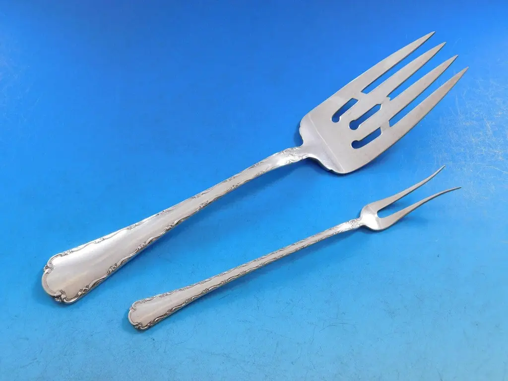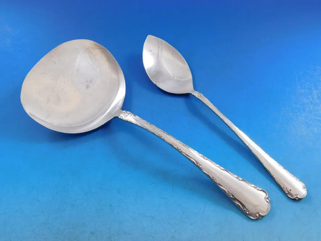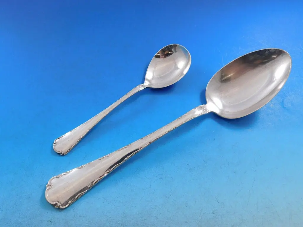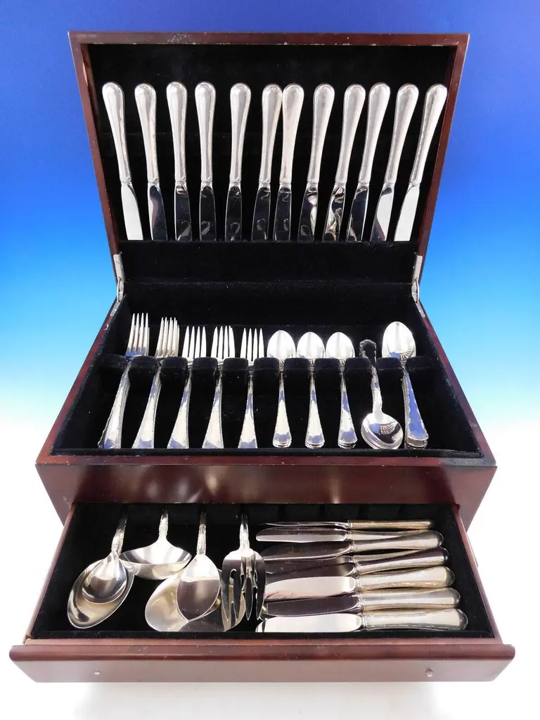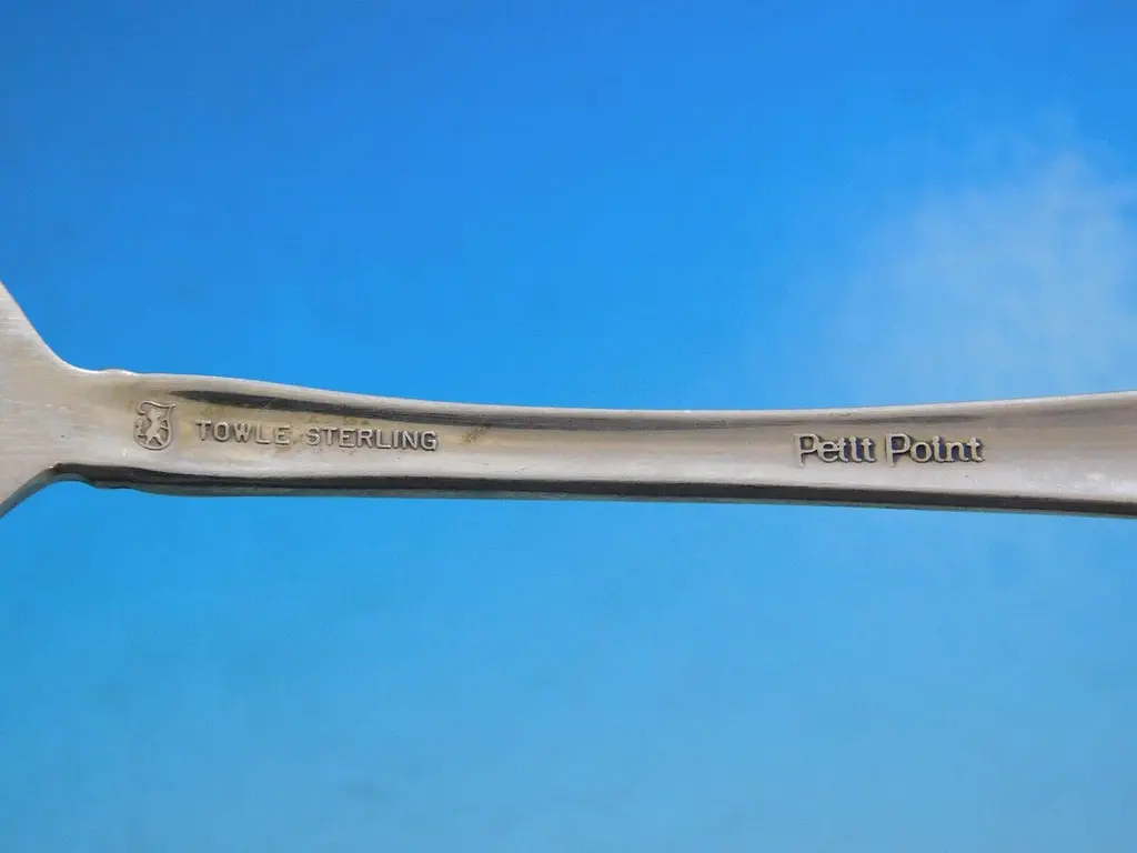 Petit Point by Towle c1957 Sterling Silver Flatware set - 79 pieces. This set includes:12 Knives, 8 7/8"12 Forks, 7 1/8"12 Salad Forks, 6 3/8"12 Teaspoons, 5 7/8"12 Place Soup Spoons, 6 5/8"12 Hollow Handle Butter Spreaders, 6 1/2"1 Gravy Ladle, 6 3/4"1 Serving Spoon, 8 1/2"1 Pierced Serving Spoon, 8 1/2"1 Cold Meat Fork, 7 3/4"1 Sugar Spoon, 5 1/2"1 Pickle Fork, 2-tine, 5 3/4"1 Tomato Server, 7 1/2"1 Jelly Server, 6 1/2"Includes bonus brand new storage chest - styles vary.Excellent condition, with no monograms. This set will be beautifully professionally polished and sealed in individual plastic sleeves prior to shipping. Stunning!100% Satisfaction guaranteed!