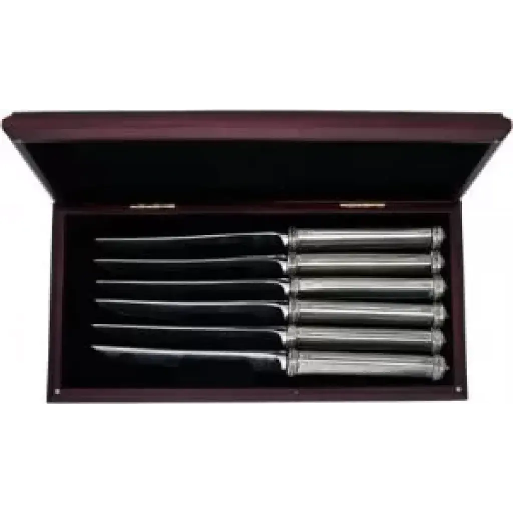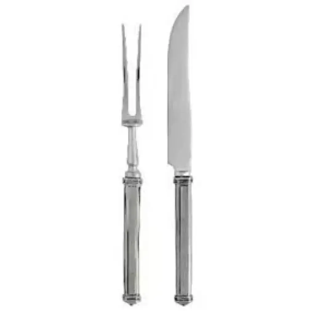 Vagabond House's Leaf Pewter flatware features column style cast pewter handles exquisitely wreathed with a delicate, captivating leaf pattern at the join and end cap. - Five-piece setting includes dinner knife, dinner fork, soup spoon, salad fork, and teaspoon. - Carving set includes carving knife and carving fork. - Set of six steak knives packaged in presentation gift box. Vagabond House is a family-owned American company specializing in fine pewter tableware, servingware and giftware. Largely inspired by nature, their exclusive products are designed to be unique, functional heirlooms for those who seek to express tradition and style in both family and formal entertaining.