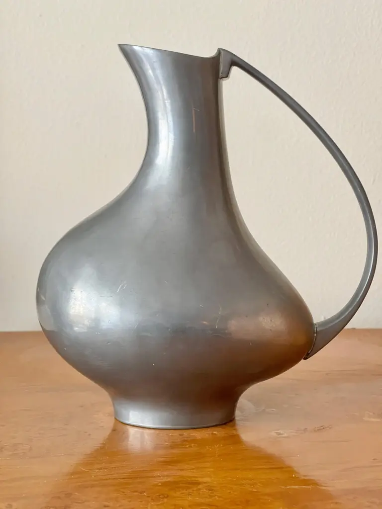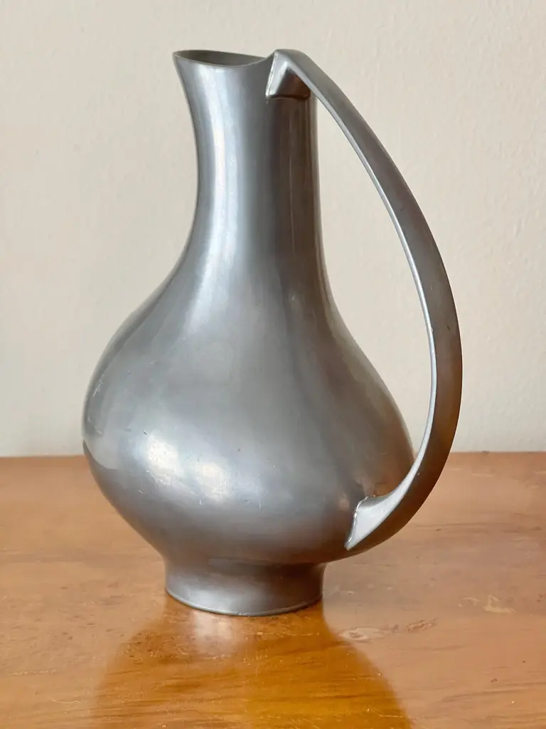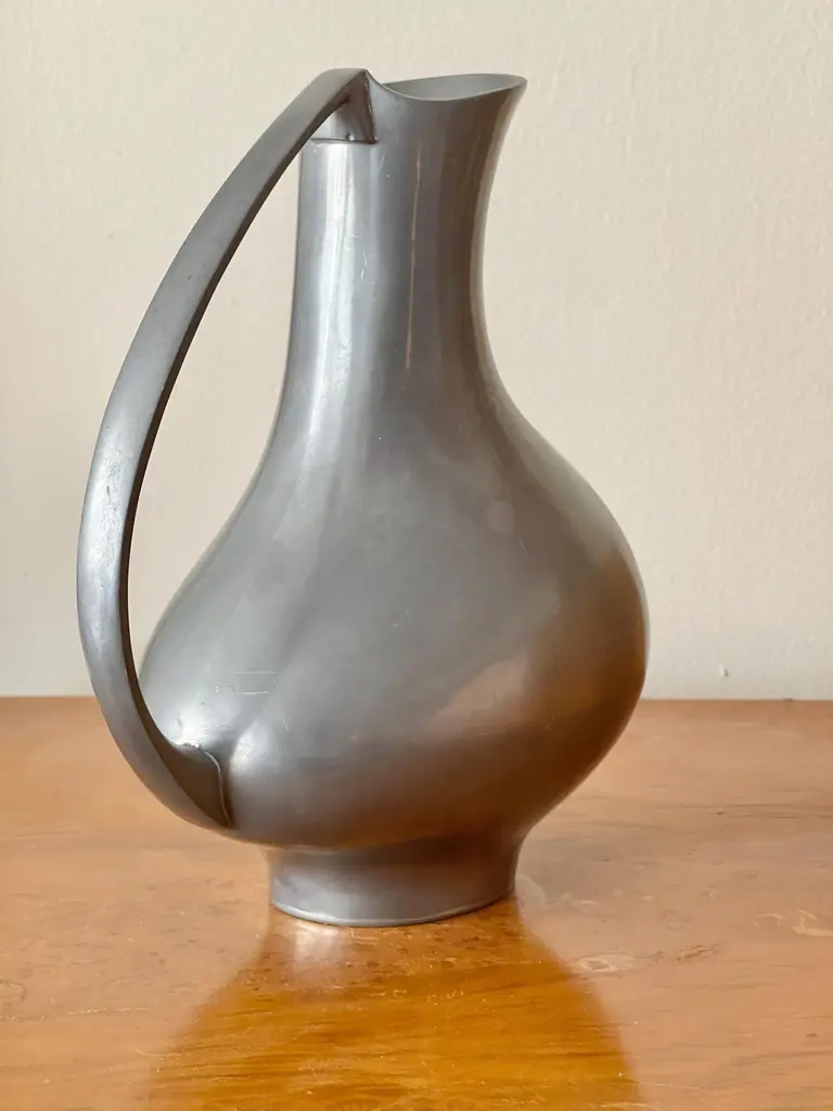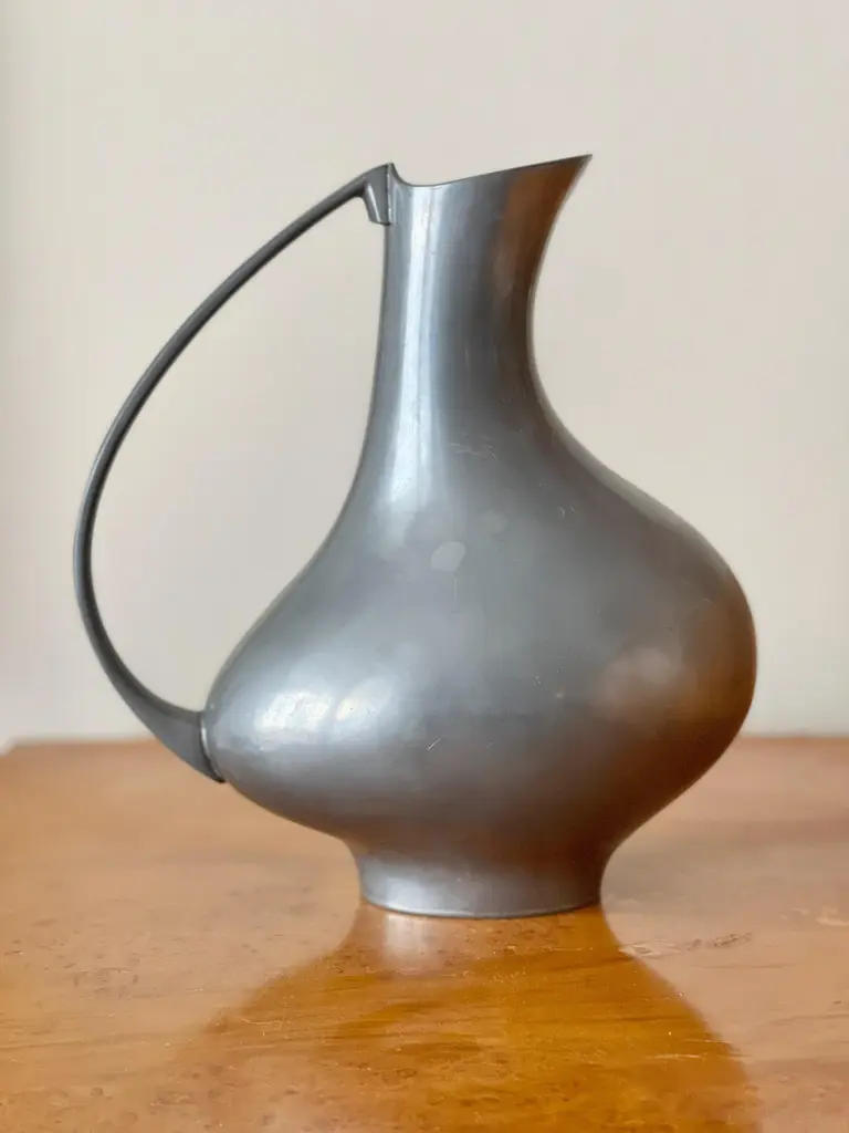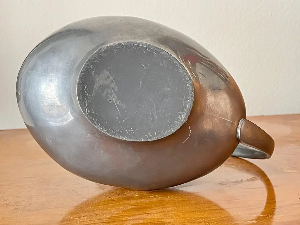 Sculptural mid-century pewter handled pitcher in the style of the "Pregnant Duck" model No. 992 by master silversmith, Henning Koppel for Georg Jensen.No markings and unknown origin.Two available. Priced per.