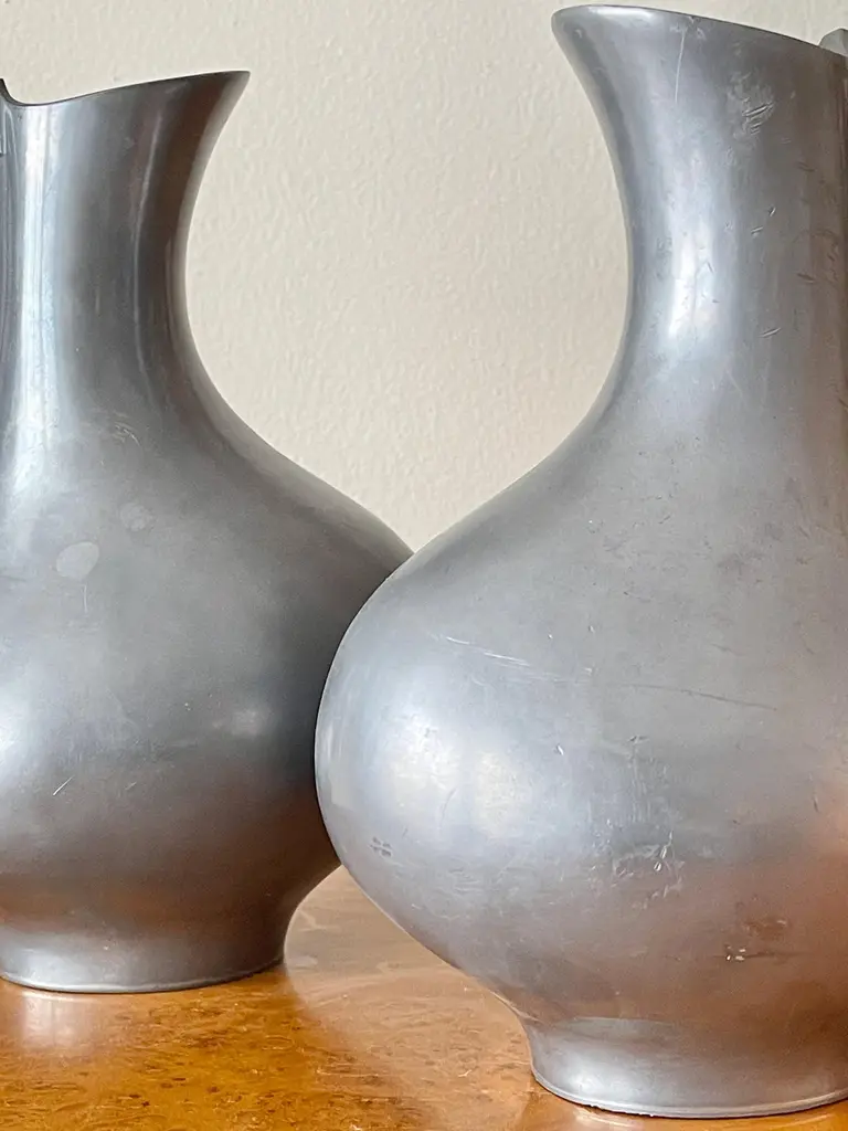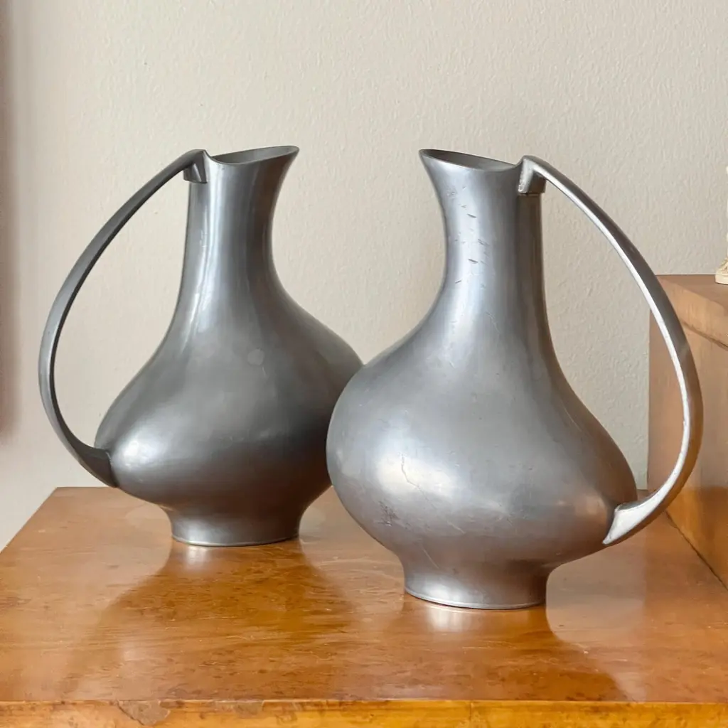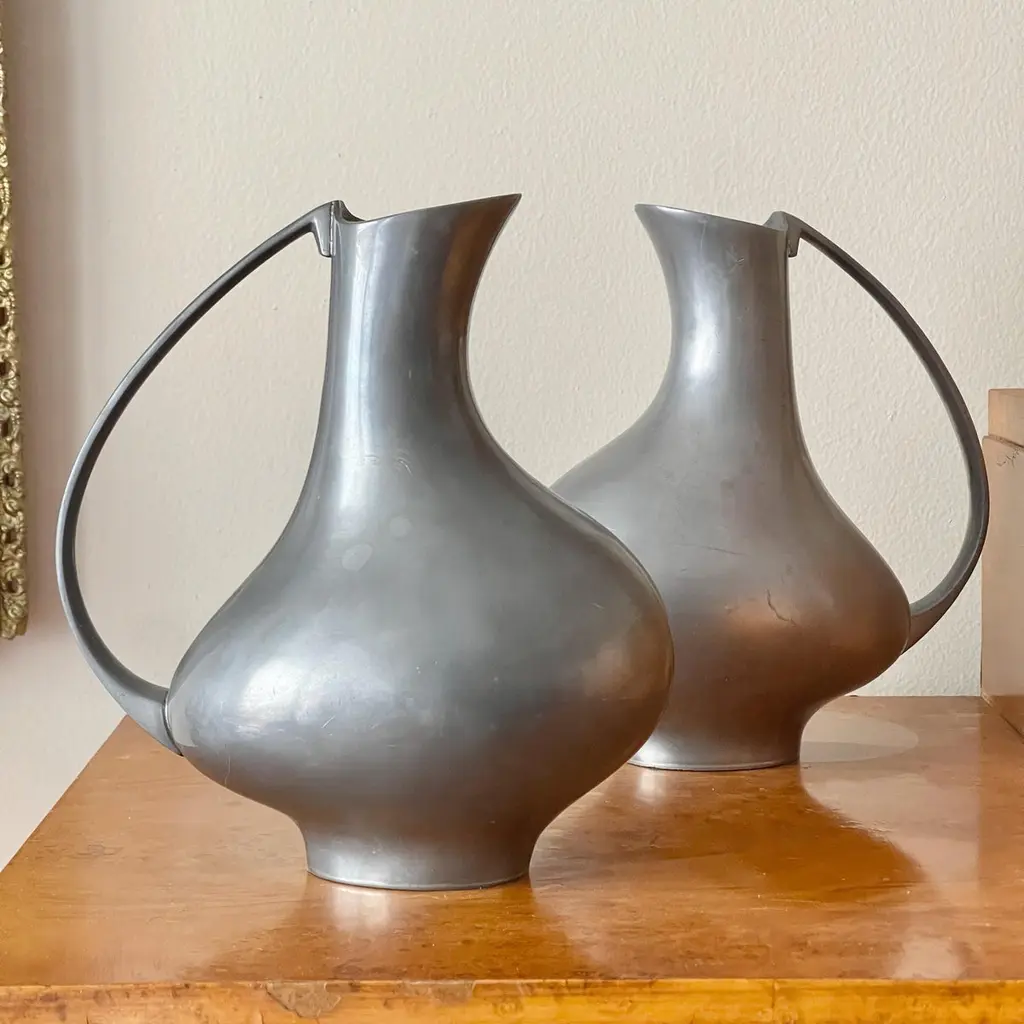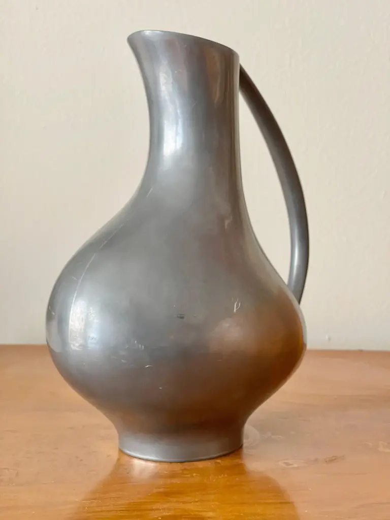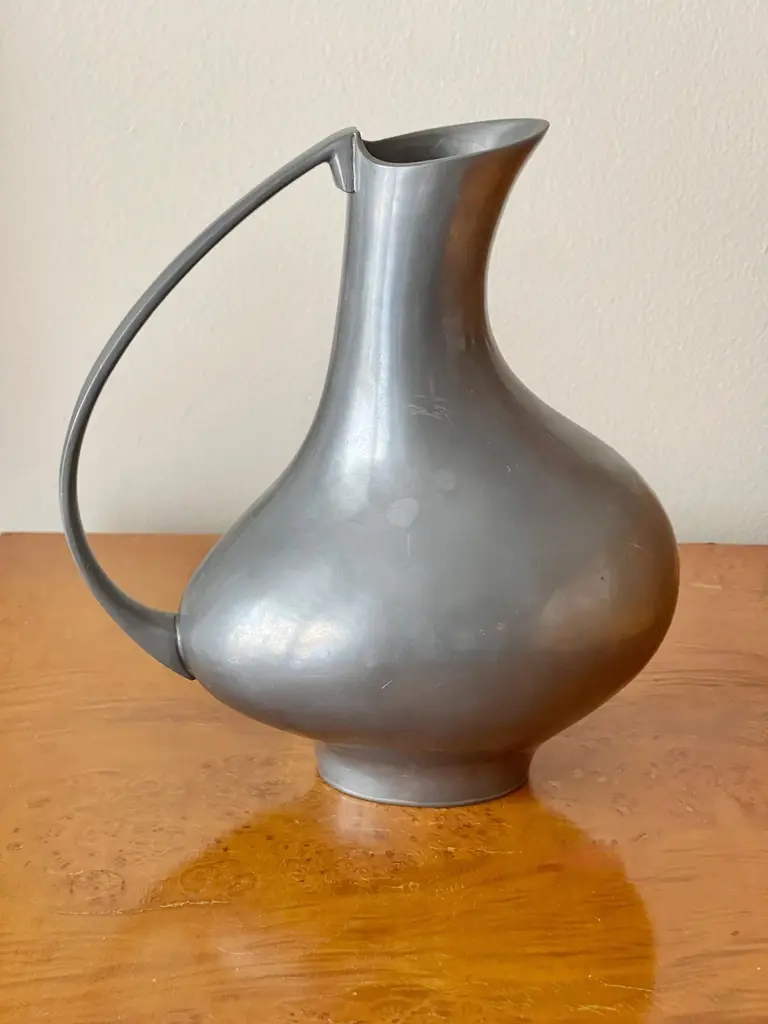 Sculptural mid-century pewter handled pitcher in the style of the "Pregnant Duck" model No. 992 by master silversmith, Henning Koppel for Georg Jensen.No markings and unknown origin.Two available. Priced per.