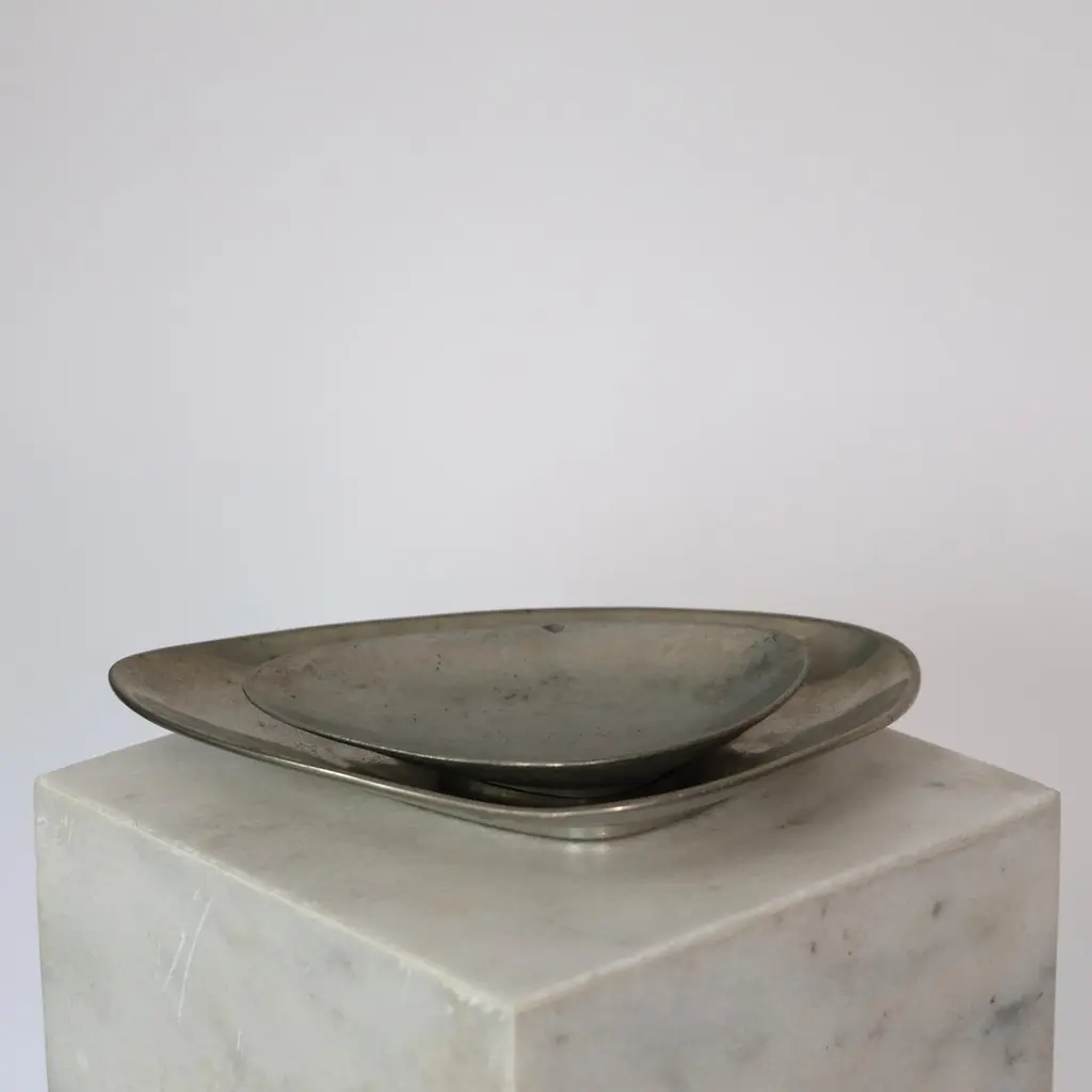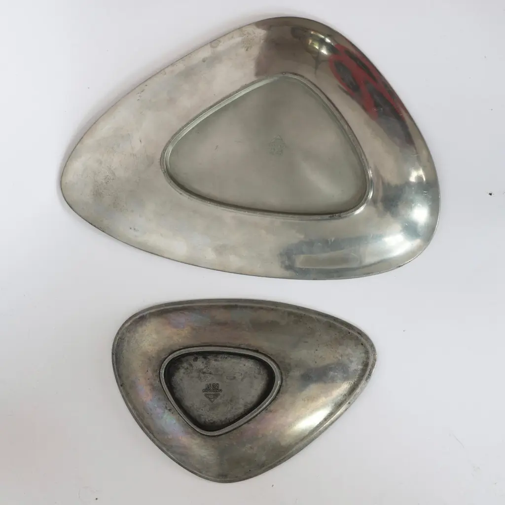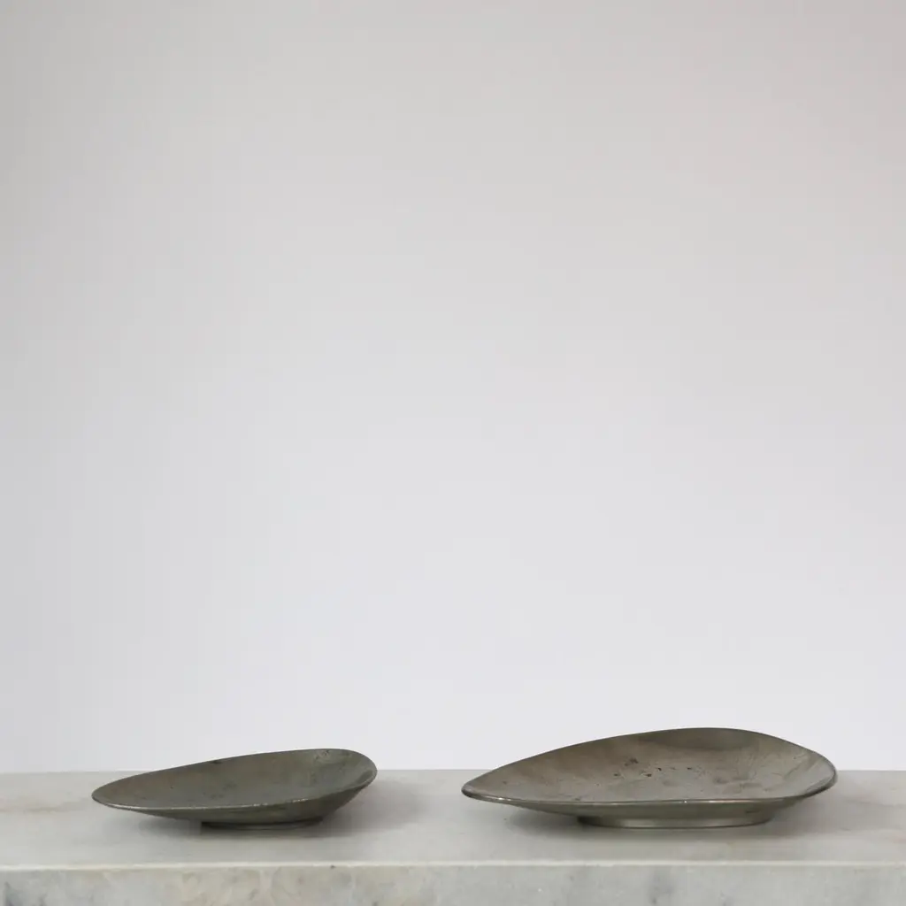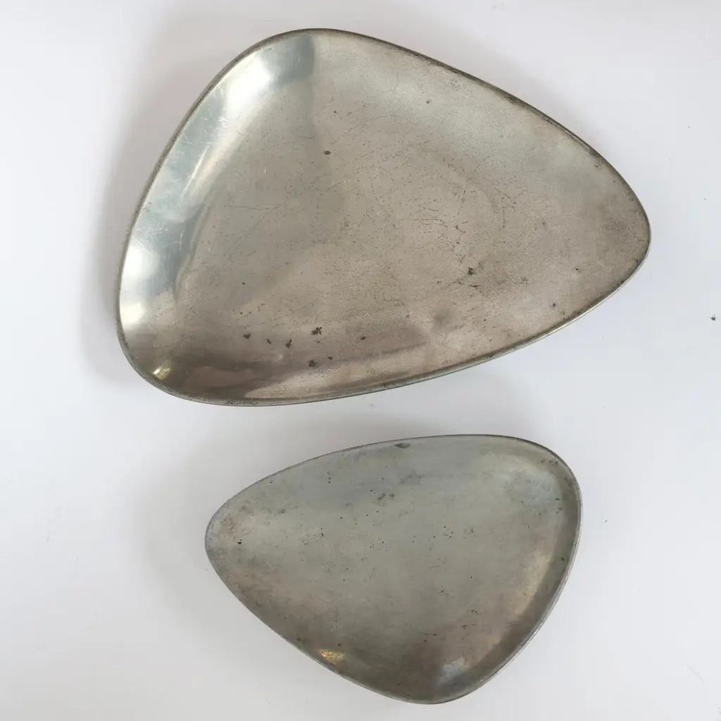 Elegant Pewter Plates designed by Arne Erkers for Just Andersen in the 1950s. Set (2) of curvy pewter plates in two sizes Designer: Arne Erkers Manufacturer: Just Andersen Style: 2618 & 2698 Year: 1952 Condition: Good vintage condition. Makers engraving intact. Marks and signs of use, mainly inside. Dimensions, no. 2618 (W x D x H): 19cm x 13cm x 3cm Dimensions, no. 2698 (W x D x H): 29cm x 20cm x 3cm Just Andersen (1884-1943) was a pioneering Danish designer and manufacturer from Copenhagen. Andersen began working with metal in the early 1920s, having been trained as a sculptor. His early designs were inspired by the Art Deco style, but he soon developed his distinctive style that blended geometric shapes and handcrafted quality with an organic feel.Andersen was renowned for his hallmark contribution to modern Danish design with the invention and utilizing of the Disko metal alloy. While the precise composition of this alloy is unknown, it is believed to consist primarily of zinc, copper, and aluminum, with other metals added for texture and color. His lamps and vases in Disko metal, produced mainly during the 1930s, have become highly coveted among design enthusiasts due to their exquisite beauty and exceptional craftsmanship. Andersen’s fewer pieces made in bronze in bronze and silver are even more sought-after by todays collectors.Andersen's designs were extensively exhibited and sold throughout Europe and the United States. Today, his work is regarded as a vital part of the Danish design tradition, celebrated for its beauty, craftsmanship, and innovative use of materials.