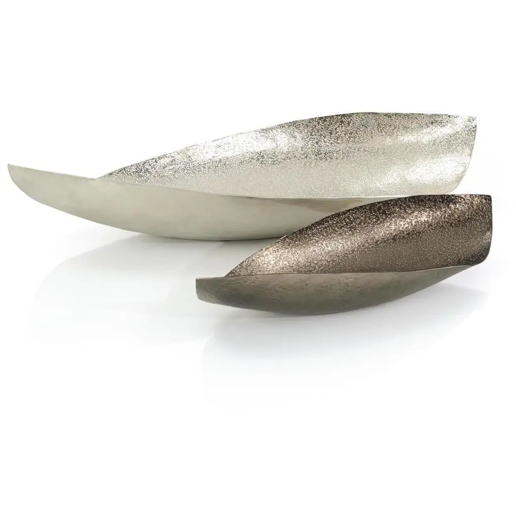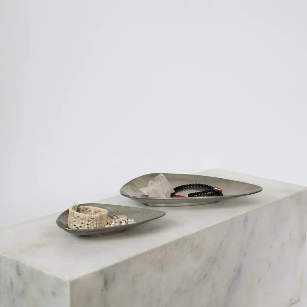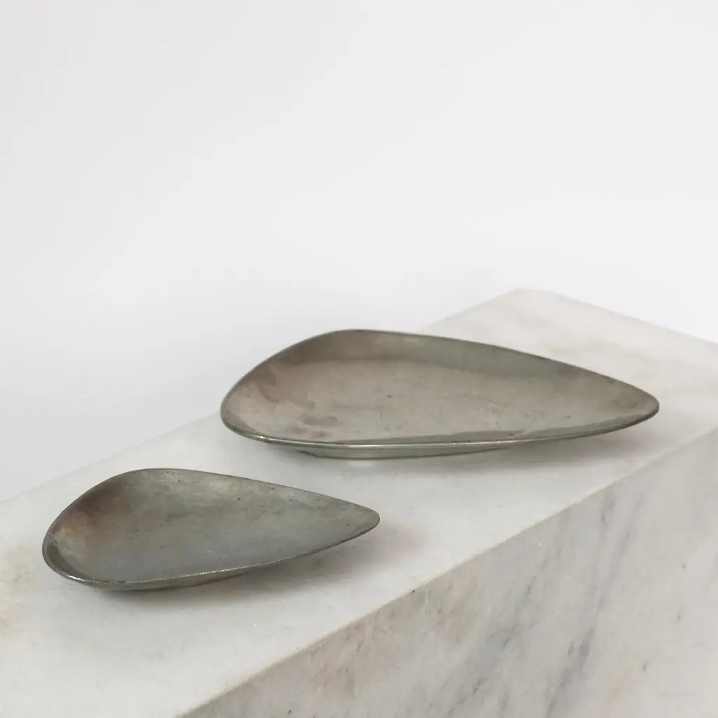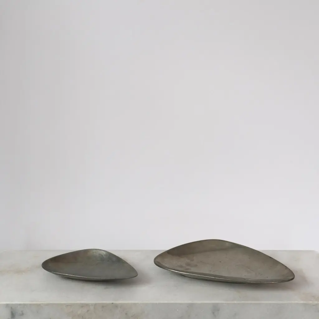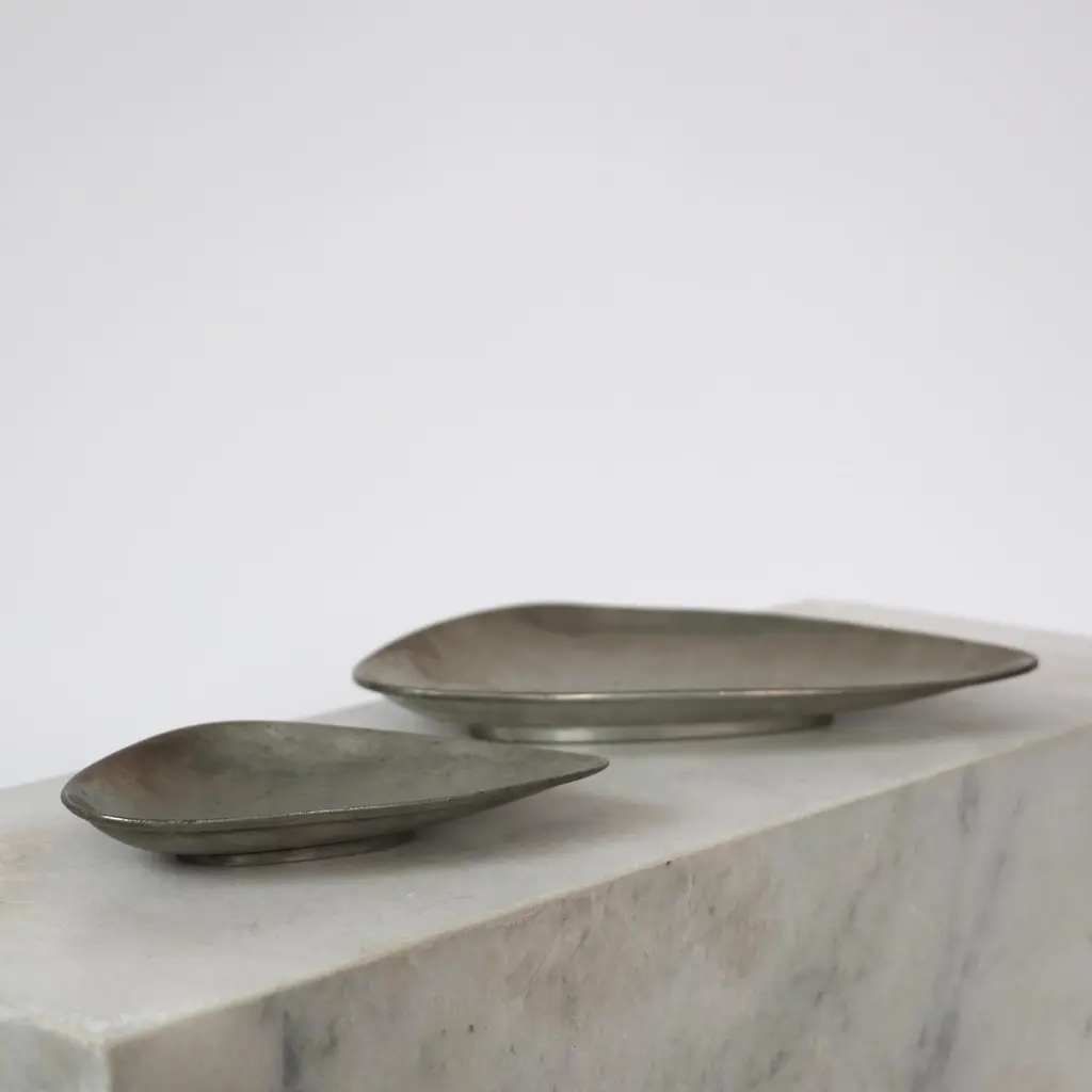Elegant Pewter Plates designed by Arne Erkers for Just Andersen in the 1950s. Set (2) of curvy pewter plates in two sizes Designer: Arne Erkers Manufacturer: Just Andersen Style: 2618 & 2698 Year: 1952 Condition: Good vintage condition. Makers engraving intact. Marks and signs of use, mainly inside. Dimensions, no. 2618 (W x D x H): 19cm x 13cm x 3cm Dimensions, no. 2698 (W x D x H): 29cm x 20cm x 3cm Just Andersen (1884-1943) was a pioneering Danish designer and manufacturer from Copenhagen. Andersen began working with metal in the early 1920s, having been trained as a sculptor. His early designs were inspired by the Art Deco style, but he soon developed his distinctive style that blended geometric shapes and handcrafted quality with an organic feel.Andersen was renowned for his hallmark contribution to modern Danish design with the invention and utilizing of the Disko metal alloy. While the precise composition of this alloy is unknown, it is believed to consist primarily of zinc, copper, and aluminum, with other metals added for texture and color. His lamps and vases in Disko metal, produced mainly during the 1930s, have become highly coveted among design enthusiasts due to their exquisite beauty and exceptional craftsmanship. Andersen’s fewer pieces made in bronze in bronze and silver are even more sought-after by todays collectors.Andersen's designs were extensively exhibited and sold throughout Europe and the United States. Today, his work is regarded as a vital part of the Danish design tradition, celebrated for its beauty, craftsmanship, and innovative use of materials.