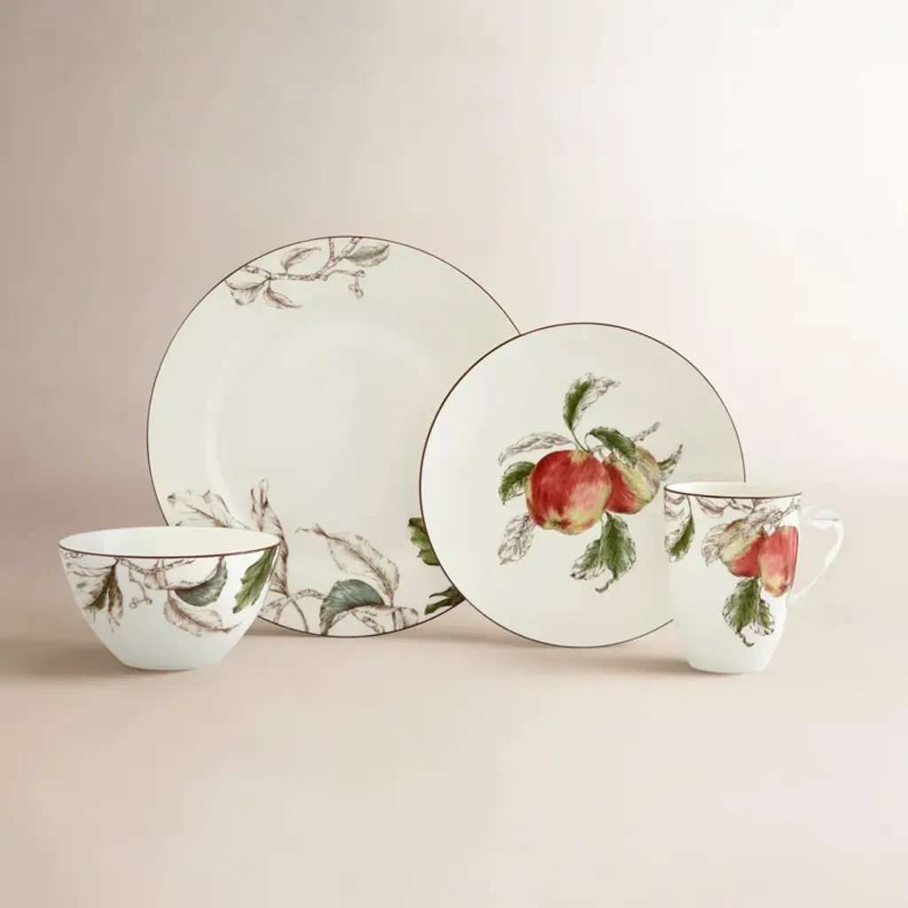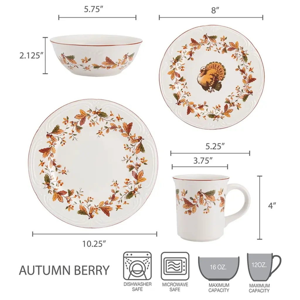 The Pfaltzgraff Autumn Berry 16 Piece Dinnerware Set features a gorgeous pattern that can be mixed and matched with pieces from the Filigree collection. Perfectly sized, these quality pieces are made from durable stoneware and can be used for formal and casual occasions. The set includes: 4 each of 10-1/4 inch dinner plate; 8-inch salad plate; 5-3/4 inch soup cereal bowl with a height of 2-1/8 inch (16oz capacity); 12oz mug measures 4 inches in height with a diameter of 3-3/4 inch, 5-1/4 inch with handle. Microwave and dishwasher safe.