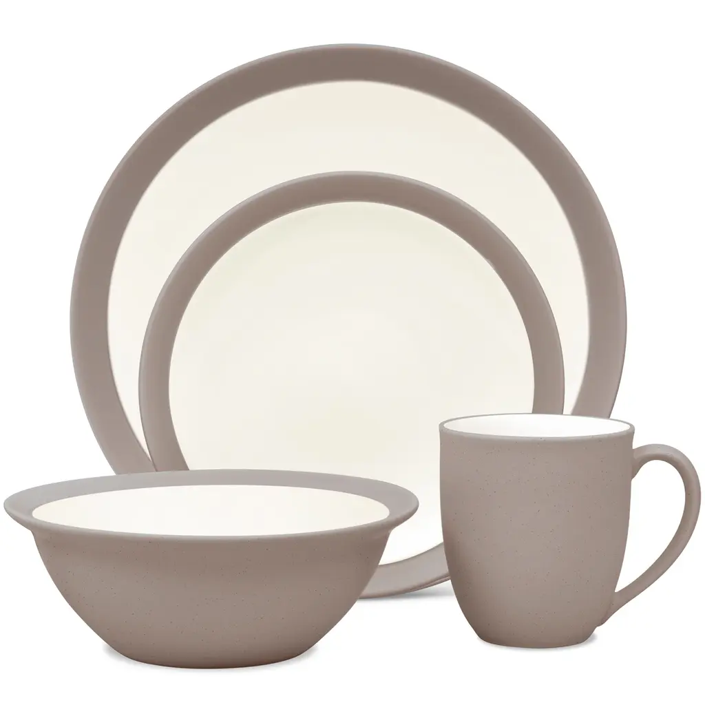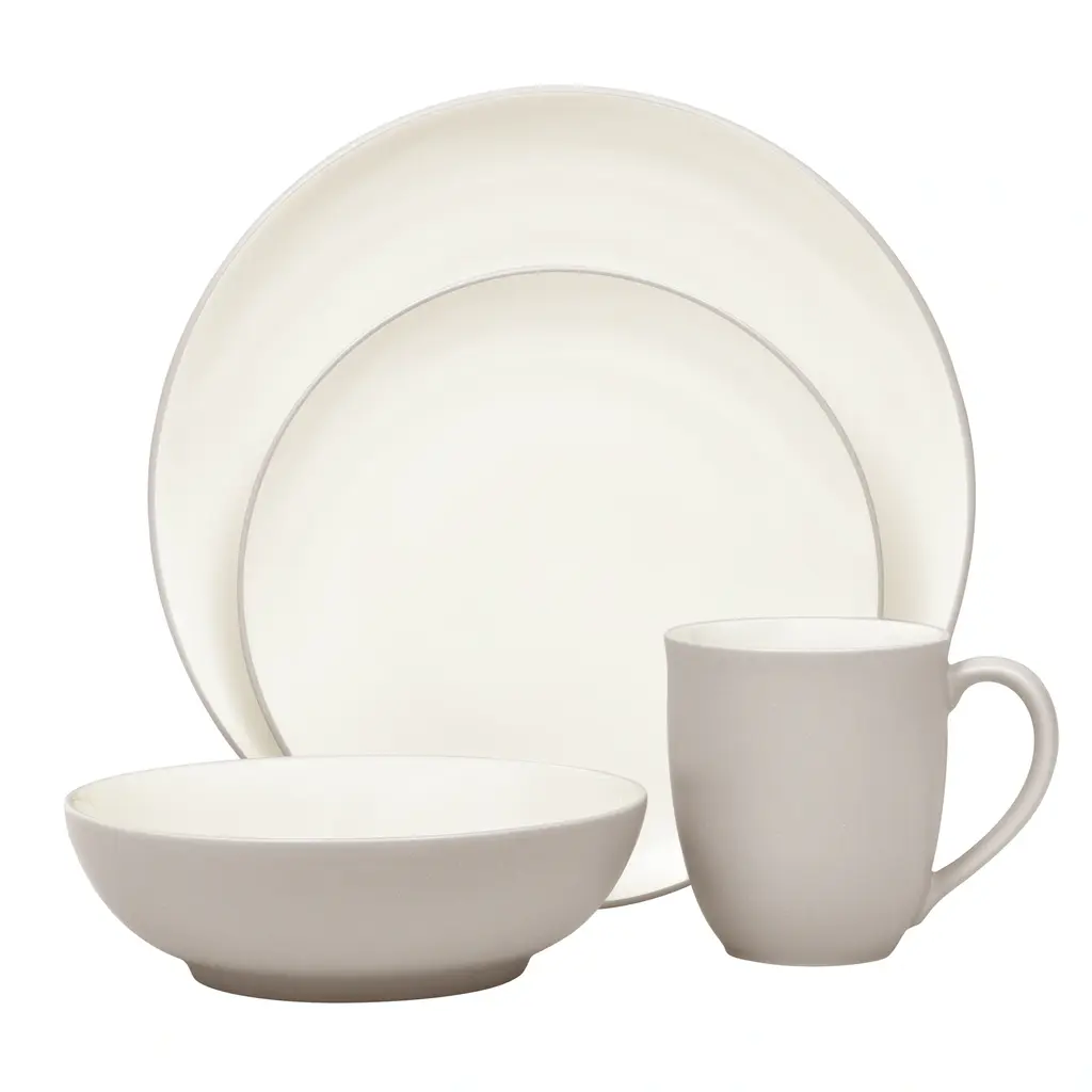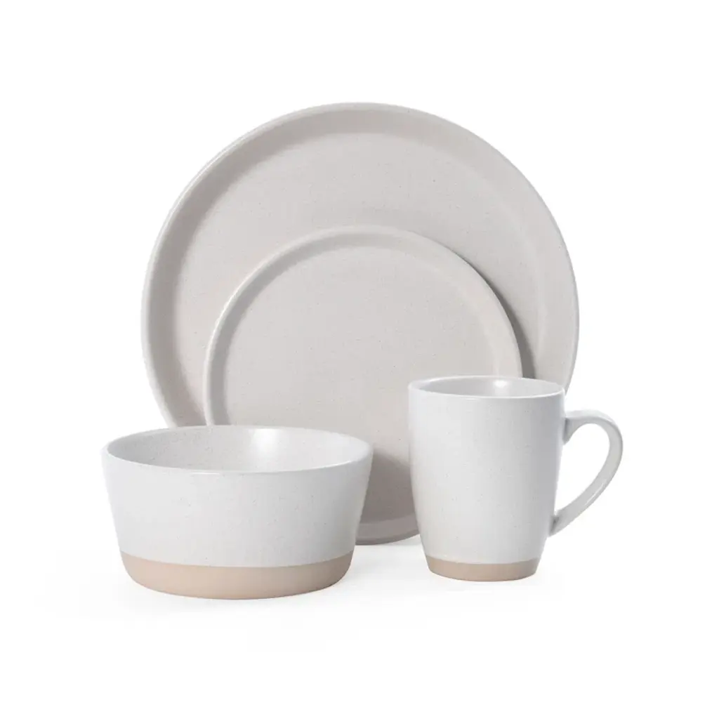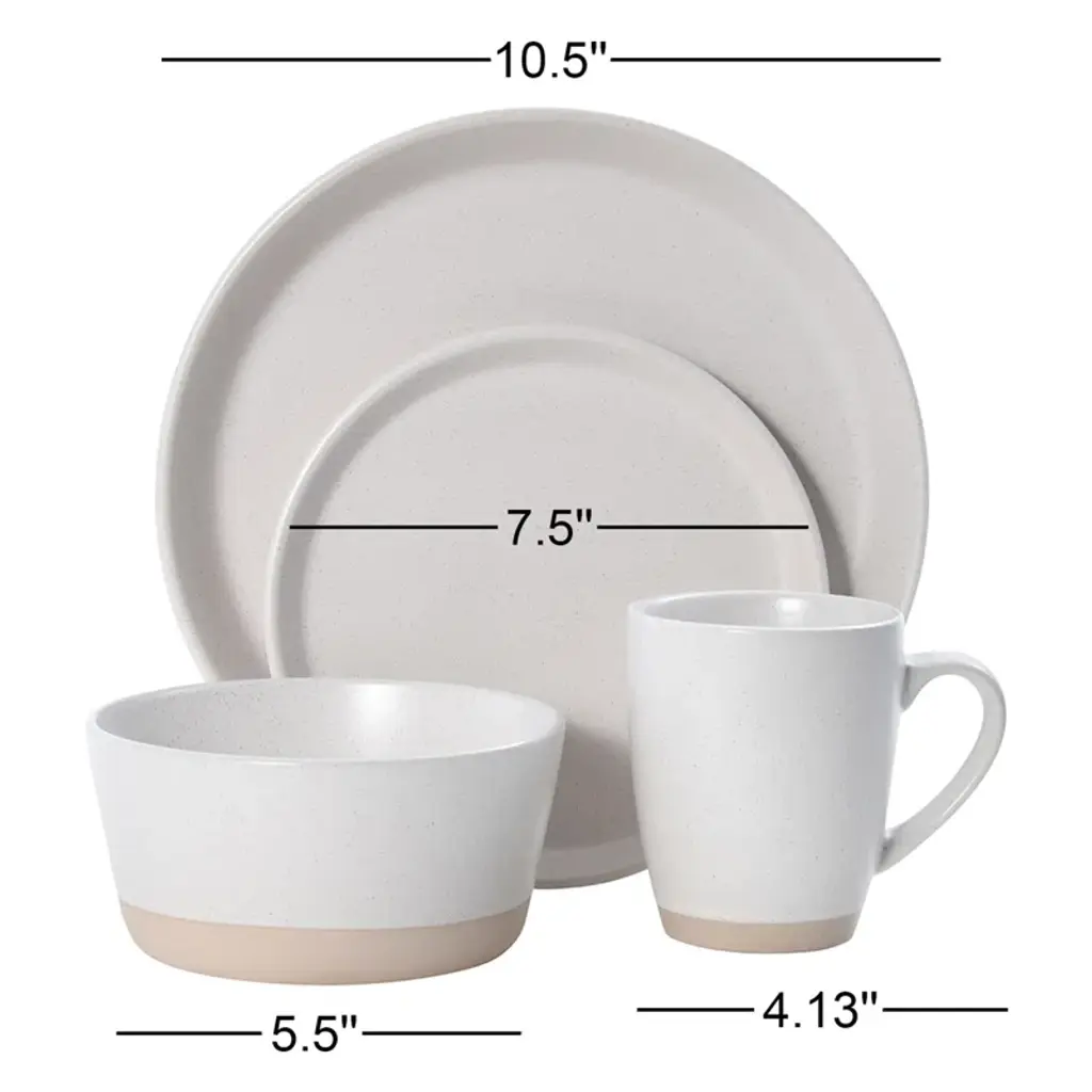 The warm, modern look of this 16-piece beige dinnerware set brings modern sophistication to all your casual dinner gatherings. Made of high-quality stoneware for strength and durability, this collection in a soft beige color features contemporary coupe shapes with unique high walls bordering the plates, and a distinct, cream band encircling the bases of the bowl and mug. 16-piece set, service for 4, includes 4 each of 10-1/2 inch dinner plate, 7-1/2 inch salad plate, 5-1/2 inch cereal bowl, and 12-fluid ounce mug. Microwave and dishwasher safe.