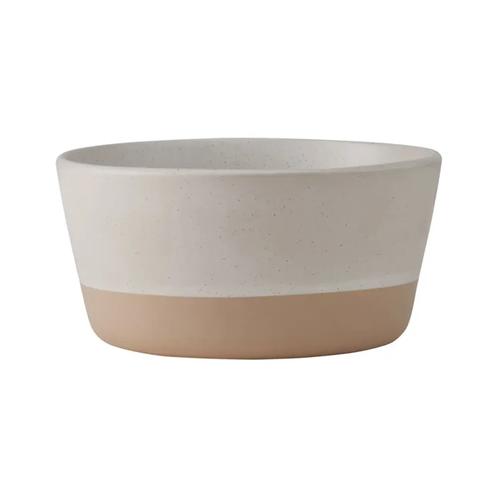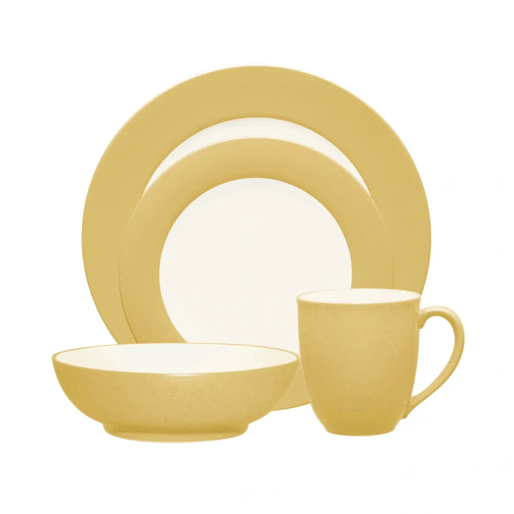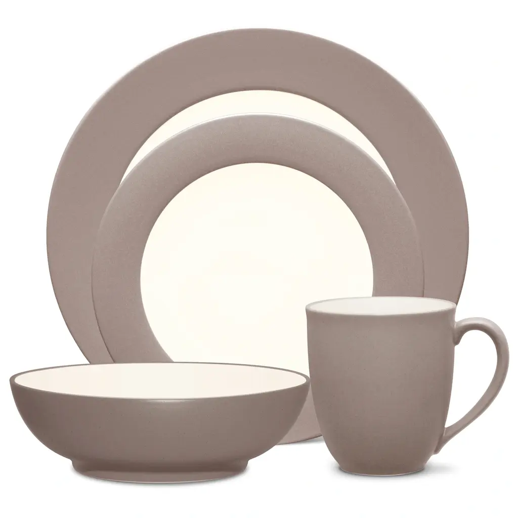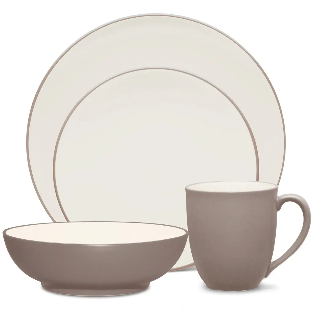 The warm, modern look of this 16-piece beige dinnerware set brings modern sophistication to all your casual dinner gatherings. Made of high-quality stoneware for strength and durability, this collection in a soft beige color features contemporary coupe shapes with unique high walls bordering the plates, and a distinct, cream band encircling the bases of the bowl and mug. 16-piece set, service for 4, includes 4 each of 10-1/2 inch dinner plate, 7-1/2 inch salad plate, 5-1/2 inch cereal bowl, and 12-fluid ounce mug. Microwave and dishwasher safe.