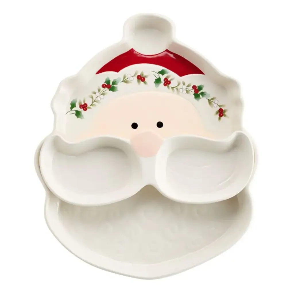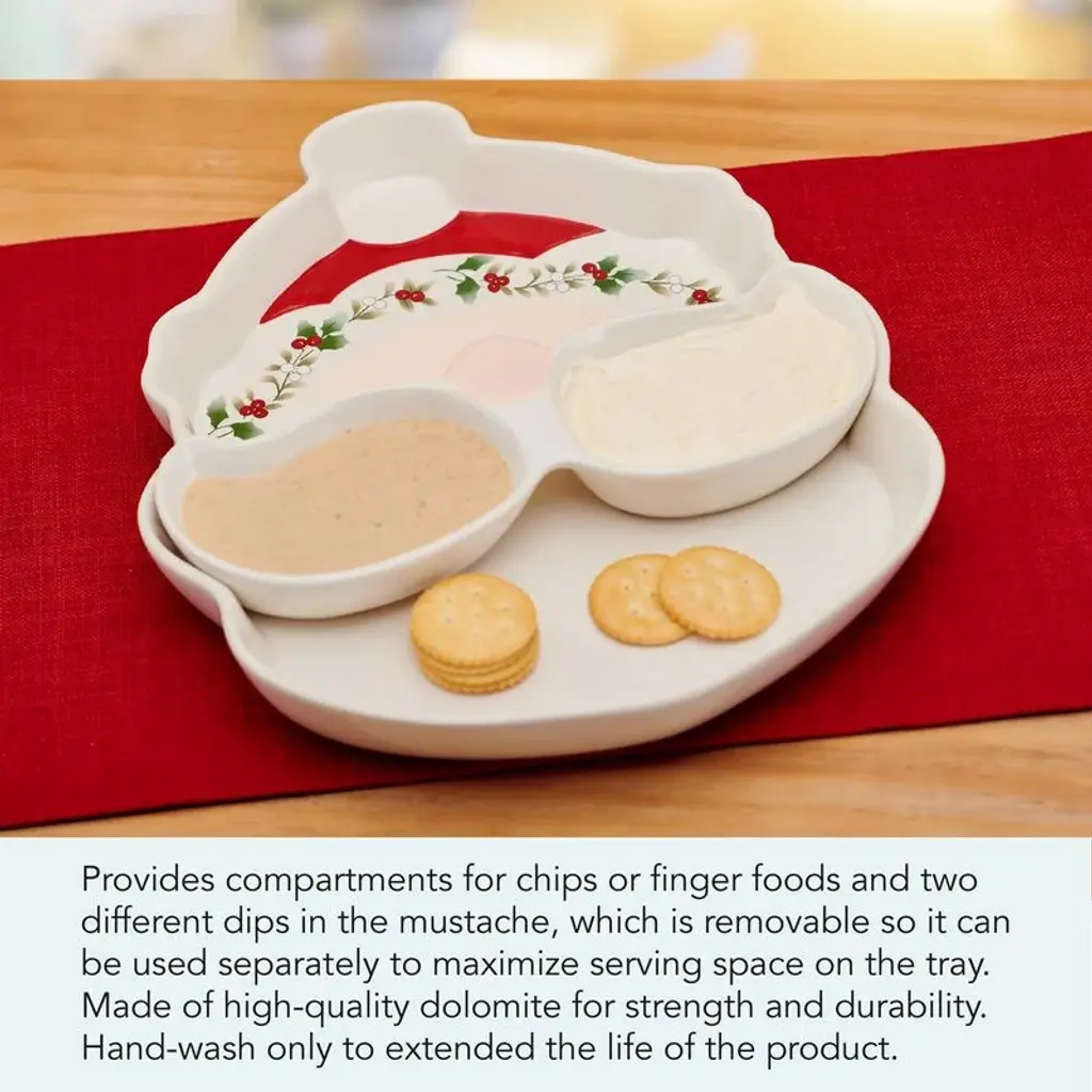 As fall turns to winter, bright holly berries make their appearance. Winterberry dinnerware by Pfaltzgraff is the holiday classic that brings this timeless motif to life in elegantly sculpted dinnerware and serveware, beautiful glassware, and joyous giftware. Made of high-quality dolomite for strength and durability, this delightful platter with dip bowl in vibrant Christmas colors features an adorable Santa face and a festive Winterberry accent. The smart design provides compartments for chips or finger foods and two different dips in the mustache, which is removable so it can be used separately to maximize serving space on the tray. Measures 2 inches high by 12 inches long by 14-1/2 inches wide. Hand-wash only to extended the life of the product.