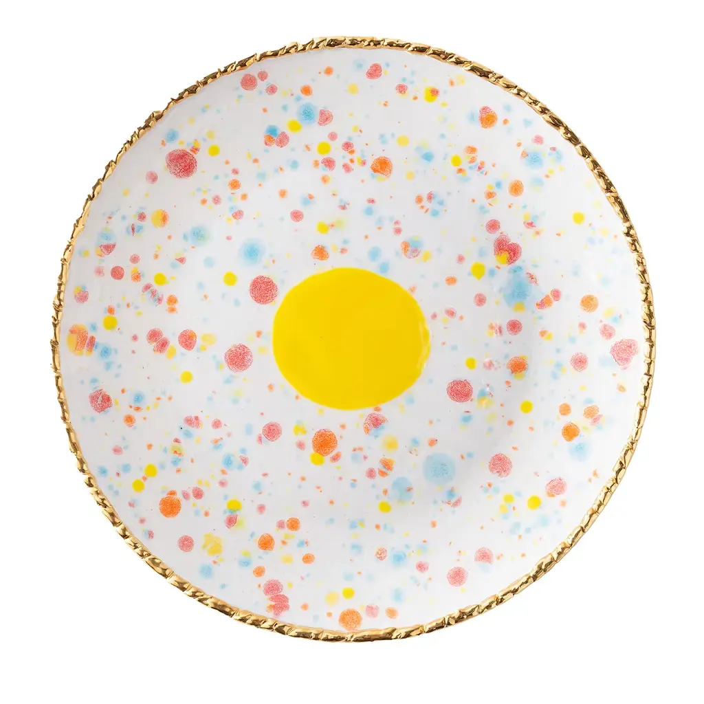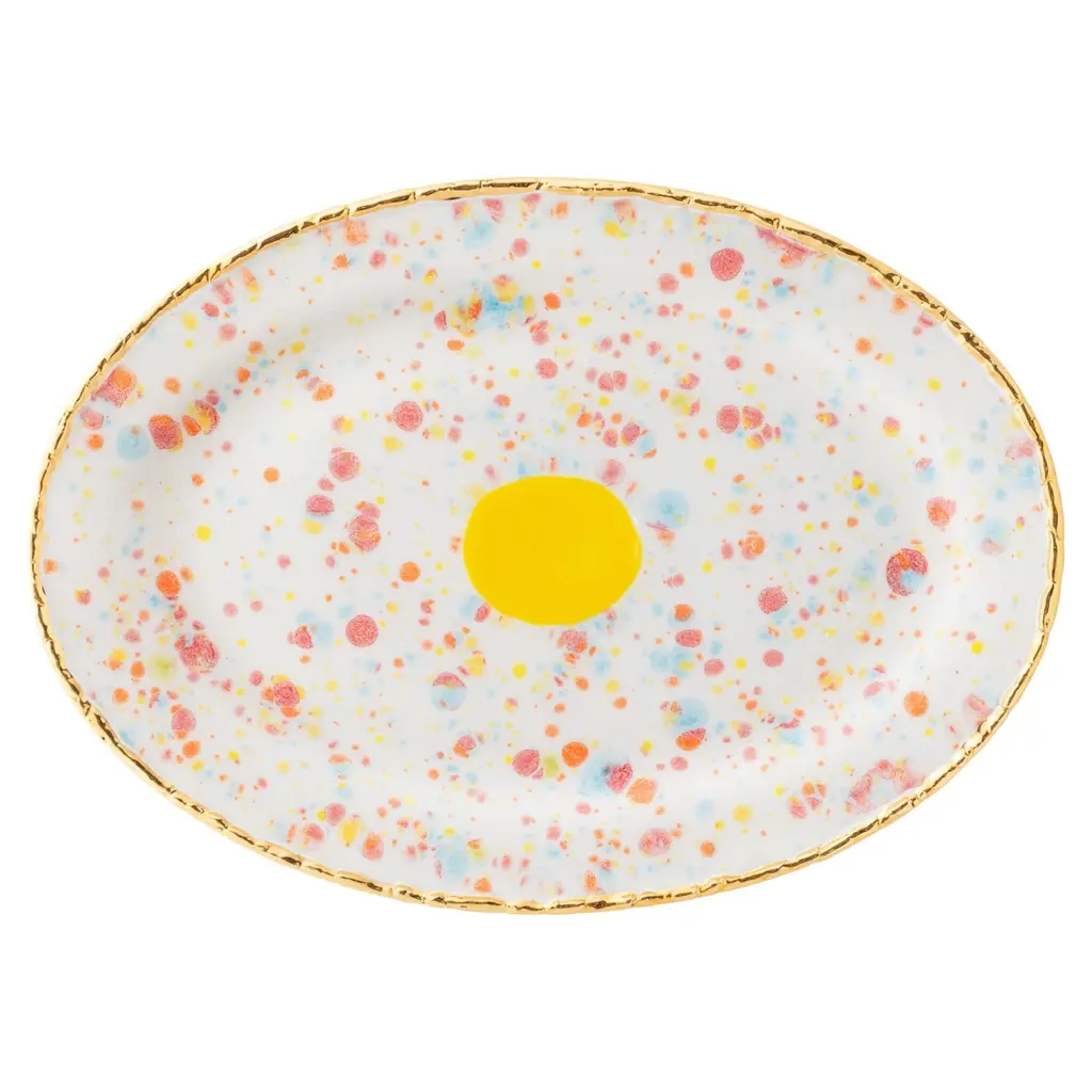 The Piazza del Popolo collection is named after a Roman landmark, and inspired by traditional Italian artisanal pottery yet decorated in a personal and elegant key. Handcrafted from the finest porcelain, this Chestnut Oval Rim Platter has an original golden craquelé edge emphasizing the warm sandy surface, the multicolor dots, and the bright yellow center. Due to the presence of real 24-karat gold, it is not suitable for microwaves. Non-aggressive soap and delicate washing are recommended.