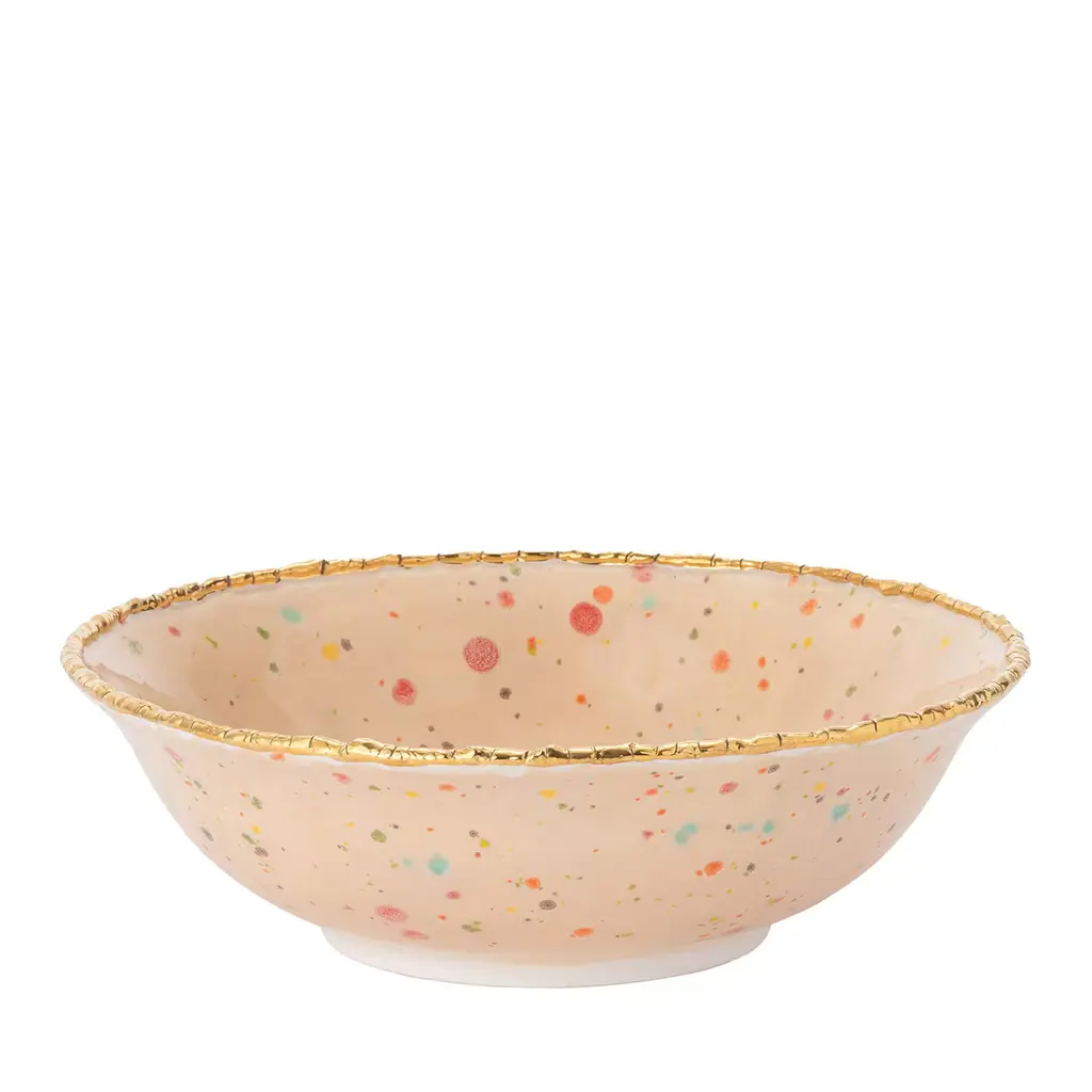 The Piazza del Popolo collection is named after a Roman landmark, and inspired by traditional Italian artisanal pottery yet decorated in a personal and elegant key. Handcrafted from the finest porcelain, this Chestnut salad bowl has an original golden craquelé edge emphasizing the warm sandy surface, the multicolor dots, and the bright yellow center. Due to the presence of real 24-karat gold, it is not suitable for microwaves. Non-aggressive soap and delicate washing are recommended.