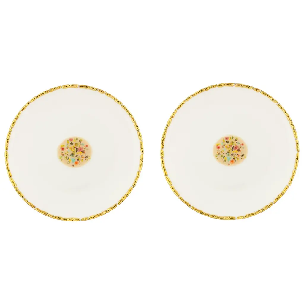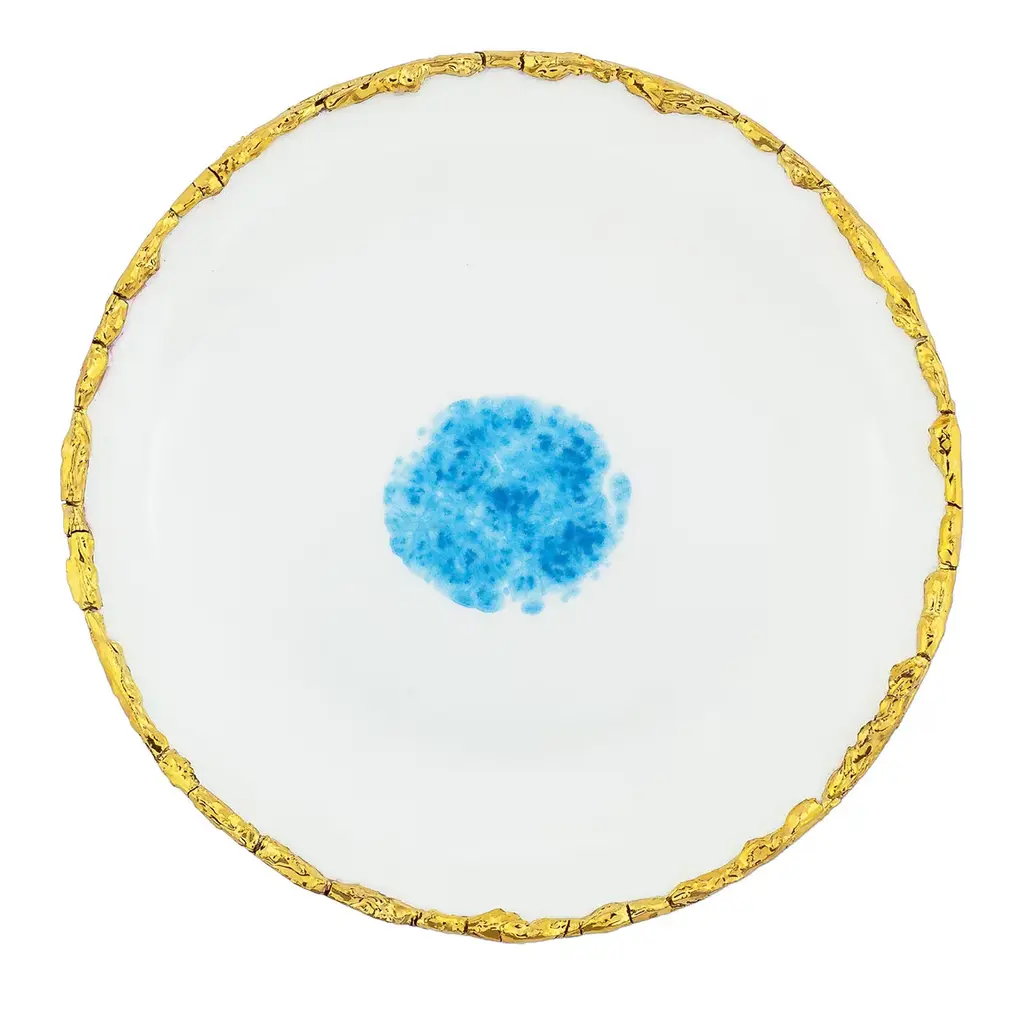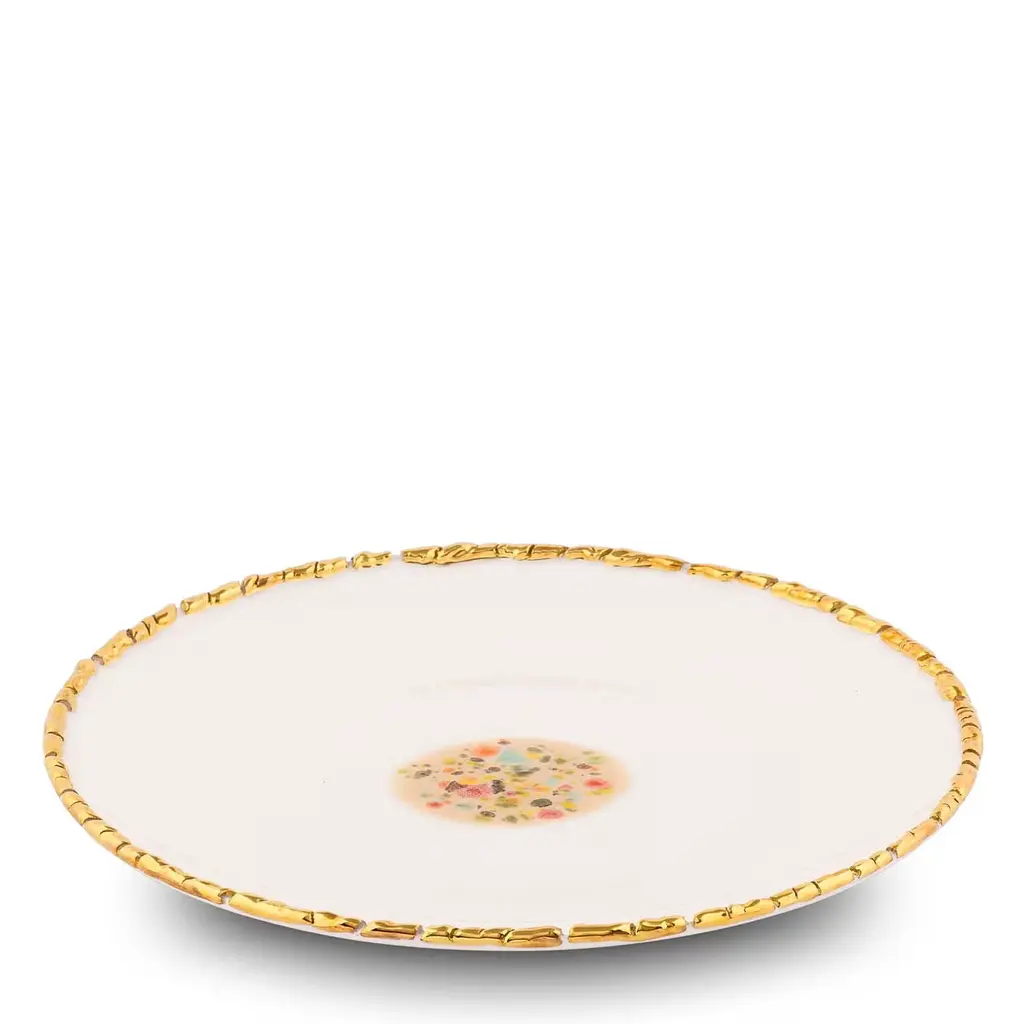 The Piazza del Popolo collection is named after a Roman landmark, and inspired by traditional Italian artisanal pottery yet decorated in a personal and elegant key. this Chestnut Dessert Coupe Plate has an original golden craquelé edge emphasizing the elegant white surface and the multicolor dots over the bright sandy center. Due to the presence of real 24-karat gold, it is not suitable for microwaves. Non-aggressive soap and delicate washing are recommended.
