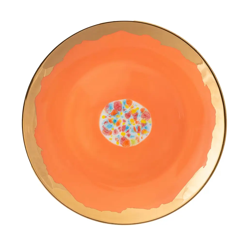 The Piazza del Popolo collection is named after a Roman landmark, and inspired by traditional Italian artisanal pottery yet decorated in a personal and elegant key. These Chestnut dessert plates have a broad golden drop edge emphasizing the bright yellow surface and the multicolor dots over the bright sandy center. Due to the presence of real 24-karat gold, it is not suitable for microwaves. Non-aggressive soap and delicate washing are recommended.