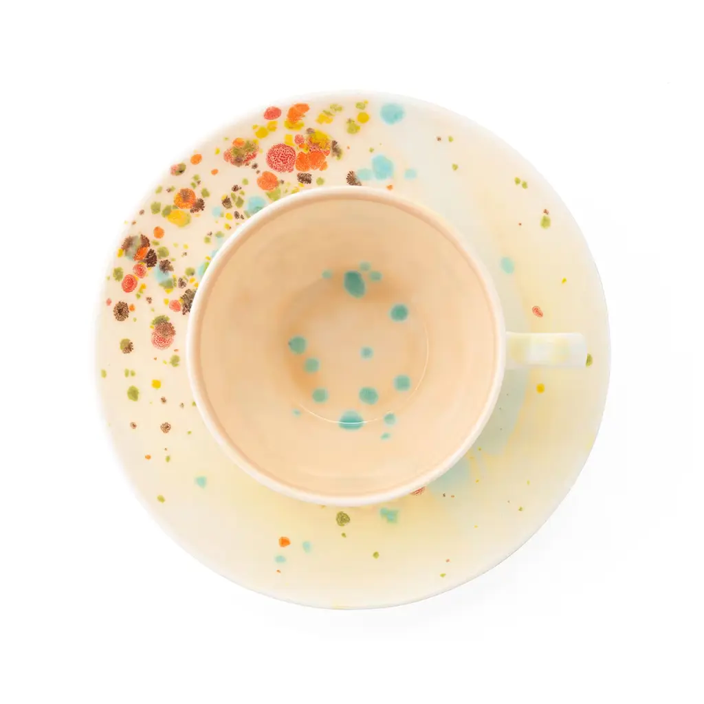 The Piazza del Popolo collection is named after a Roman landmark, at the heart of Roman everyday life, and inspired by traditional Italian artisanal pottery yet decorated in a personal and elegant key. Handcrafted from the finest porcelain, this Chestnut teacup and saucer has a multicolor dotted decoration shaped as a cascade while the inside is painted in a sandy color. Slight variations of color tones are to be expected as a sign of their uniqueness. Suitable for dishwashers and microwaves.