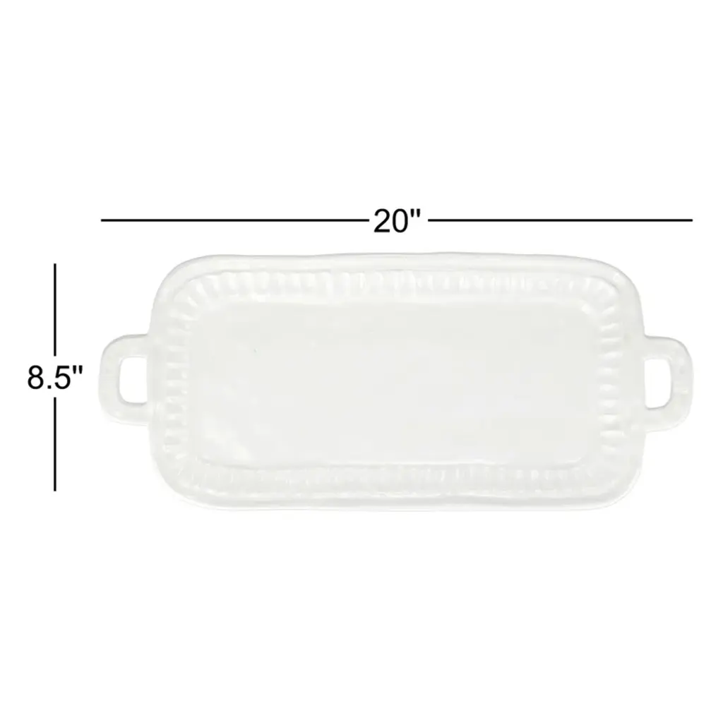 Pietra Serena, meaning serene stone, represents the simplistic beauty of the hand-pressed design found on the Pietra Serena Handled Rectangle Platter.