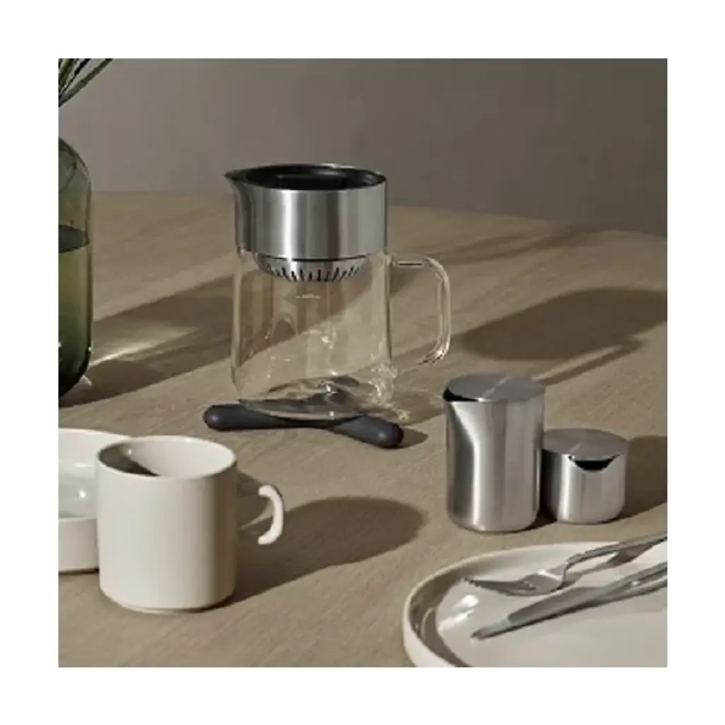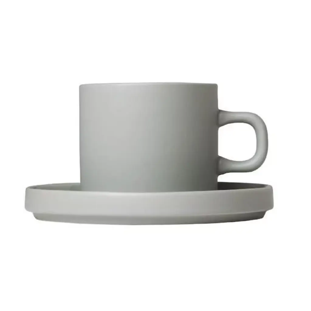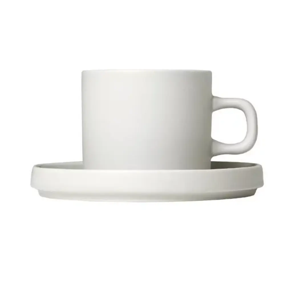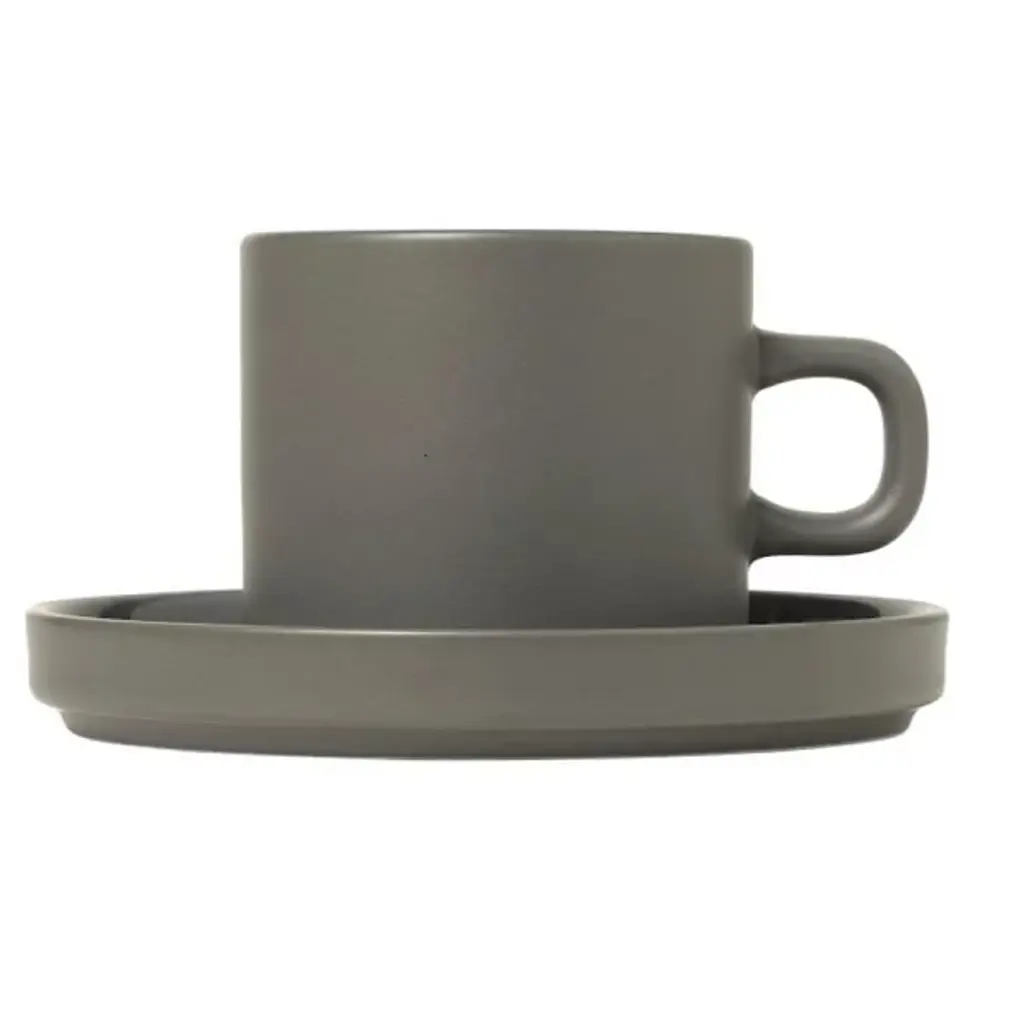 Pour yourself a cup of something warm with the Blomus PILAR Coffee Cups with Saucer, Set of 2, a matte-textured contemporary set of serveware. The saucers are elegant but unobtrusive, flaring up into a generous rim that provides a visual contrast with the simple cylindrical cups that rest on them.