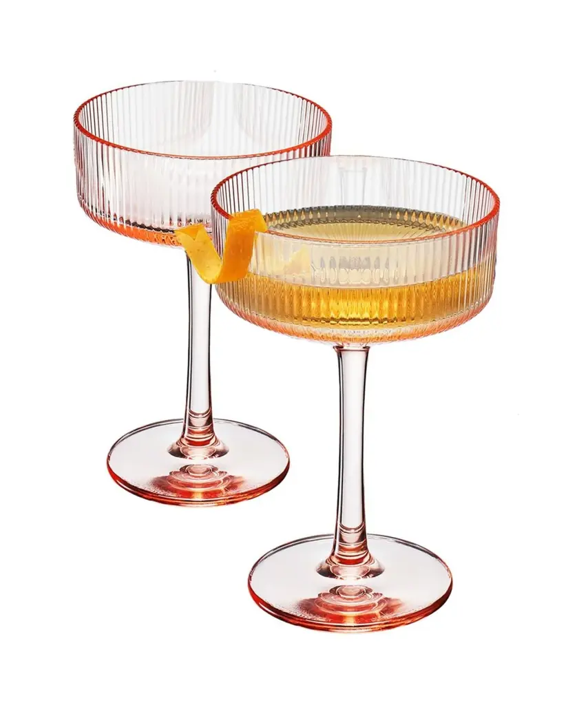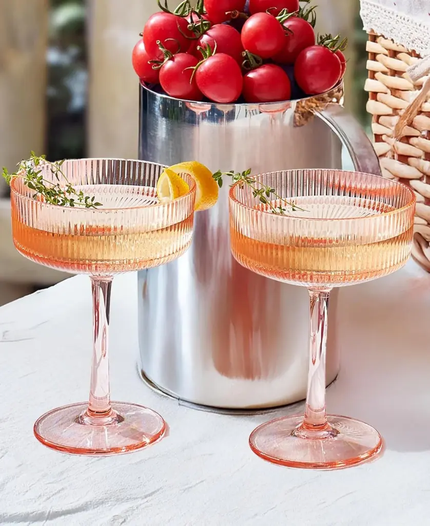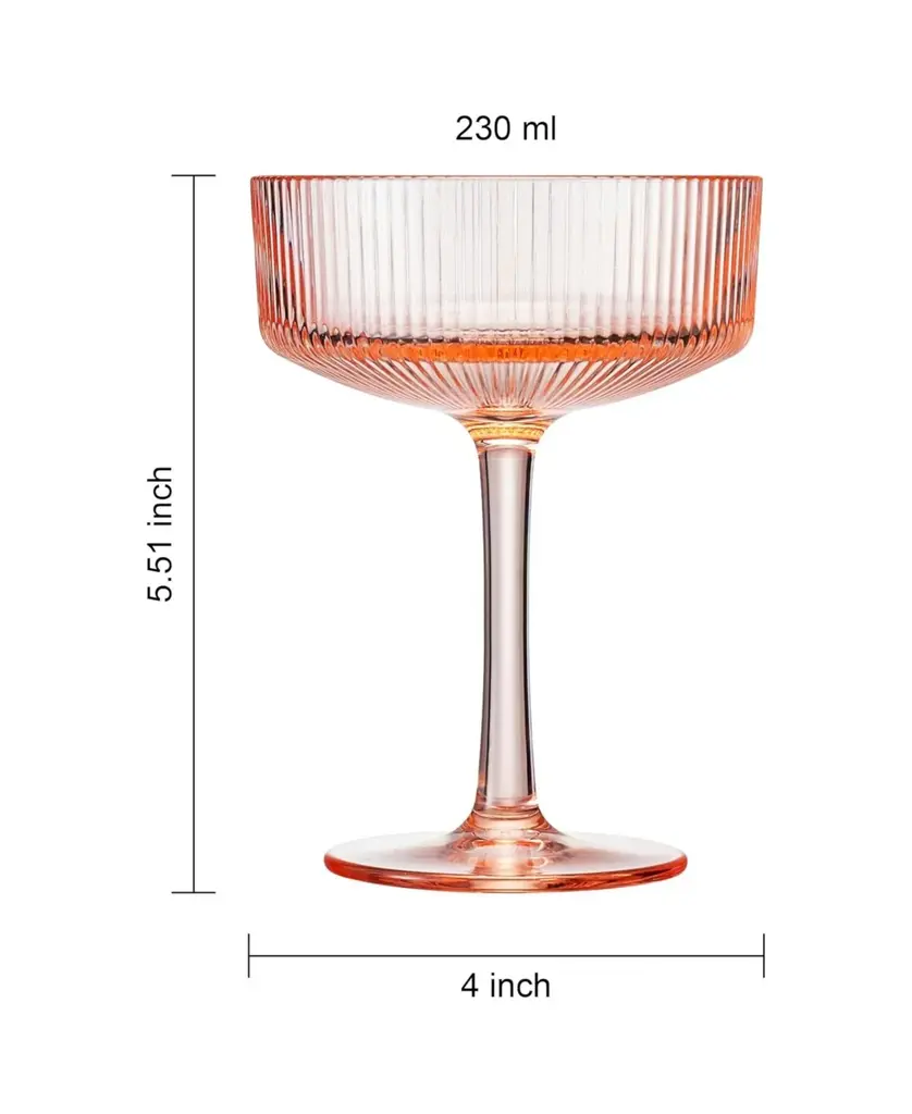 Elegant vintage design featuring a ribbed ripple texture and classic coupe silhouette, these glasses channel the timeless sophistication of Art Deco style. These coupes glasses are perfect for poolside sipping, patio parties, picnics, or elegant dinner settings.