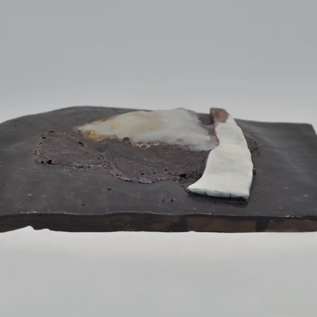 This splendid decorative plate is an exceptional symbol of Maurizia Carantani's passionate art of contemporary inspiration. Meticulously handcrafted following a thoughtful and deft procedure, it is fashioned of black terracotta combining polished and matte finishes, uniquely completed with a white glass insert blending with other unknown materials to create a dynamic and captivating surface.