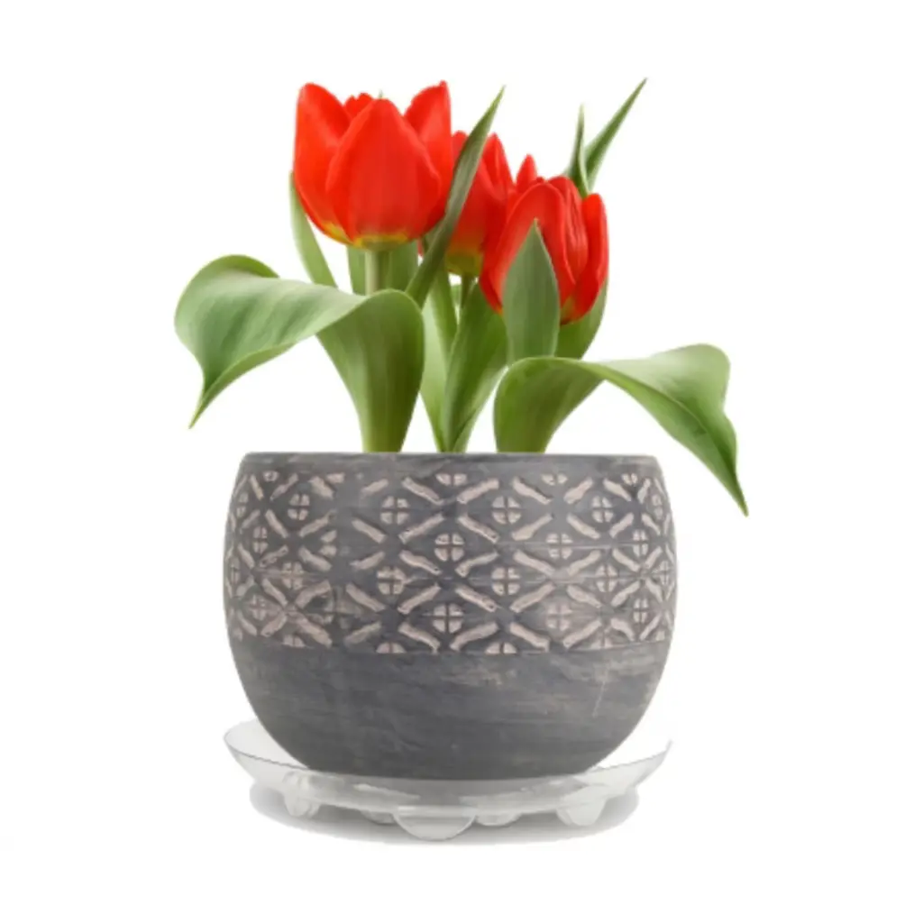 Clear plastic saucer protects carpet, wood, or marble floors and prevents moisture damage. Air flo-thru design and is 5 times thicker than standard saucers, this heavy-duty saucer, will hold up to 500 lbs. It is constructed of up to 50-percent post-industrial PET and is 100-percent Recyclable. Holds up to 500lbs. Made in the USA.
