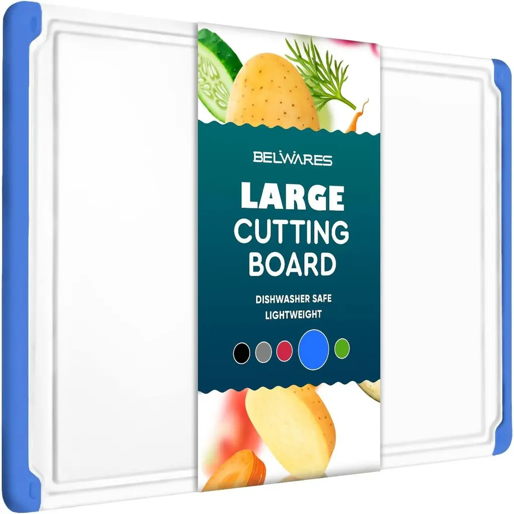 LARGE PLASTIC CUTTING BOARD FOR VERSATILE USE: This durable, large cutting board (18” x 12”) is perfect for everyday kitchen tasks, from chopping vegetables to carving meats. Whether you need a cutting board for prepping meals, slicing fruits, or dicing herbs, this board offers ample space for all your culinary needs. Ideal for busy kitchens or outdoor barbecues NON-SLIP RUBBER FEET FOR SAFETY & STABILITY: With non-slip rubber feet, this cutting board stays securely in place during use, ensuring stability while cutting or chopping. Whether you’re working with large cuts of meat or delicate vegetables, this non-slip cutting board keeps your prep work safe and secure, reducing the risk of accidents DISHWASHER SAFE FOR EASY CLEANING: Designed for convenience, this cutting board is dishwasher safe, making cleanup quick and easy after every meal. Simply toss it in the dishwasher, and it’s ready to use again, saving you time and effort in the kitchen. Perfect for those looking for dishwasher safe cutting boards that maintain durability DEEP JUICE GROOVES TO PREVENT MESS: Equipped with deep juice grooves, this plastic cutting board captures liquids from meats, fruits, and vegetables, preventing spills onto your countertop. It’s the perfect cutting board with juice groove design to make meal prep cleaner and more efficient, whether you’re carving a roast or slicing juicy fruits THICK & DURABLE FOR HEAVY-DUTY USE: This extra large cutting board is built to last, crafted from thick, heavy-duty plastic that resists warping and knife marks. Ideal for everyday kitchen use or special occasions, this board can handle everything from meal prepping to holiday feasts. Its robust design makes it suitable for use as a meat cutting board, carving board, or general-purpose kitchen cutting board
