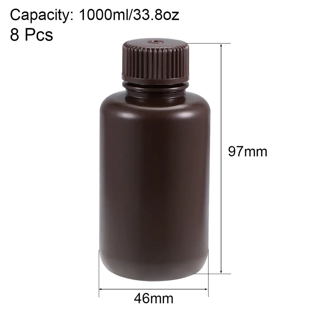 Wide application:Suitable for liquid, reagent and sample storage. Widely used in laboratory, liquid dispensing, solid powder, and industrial use.Advantages:1. Design: Cylindrical body, screwcap, designed for easy to open and close, easy to tighten, no leaking, sealed cover, don't worry the contents will be spilling out. The bottle is even in thickness and durable.2. Chemical resistance: High-frequency insulation, not affected by humidity, not prone to chemical reaction; Lightweight, acid and alkali resistance, and toughness at low temperature. No harmful chemicals and very safe to use, moisture, a wide range of uses.3. Physical resistance: The thick wall wear-resistant structure that prevents cracking makes it have super surface stiffness and scratch resistance.How to Use?1. When using, wash and dry the reagent bottle, and fill it with solid or liquid to be stored.2. Use a funnel when pouring liquid, and then tighten the cap.3. If liquids are prone to volatilization, seal the bottle mouth and cover it with sealing film.Specification:Material: PlasticColor: BrownPackage Content:8pcs x Plastic Bottle