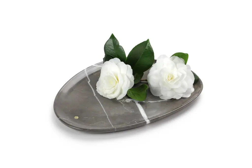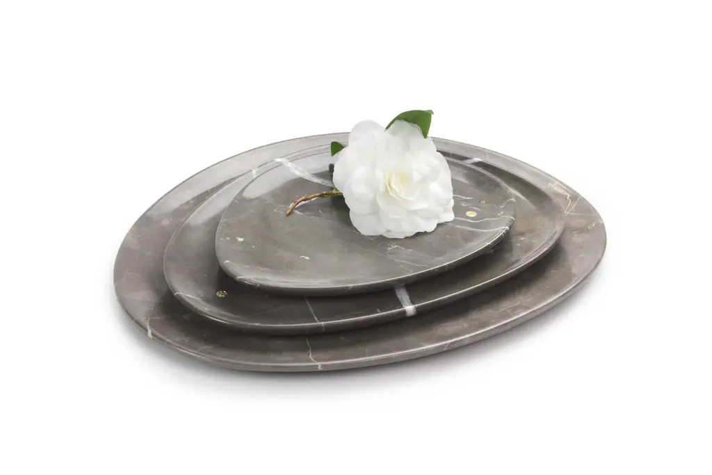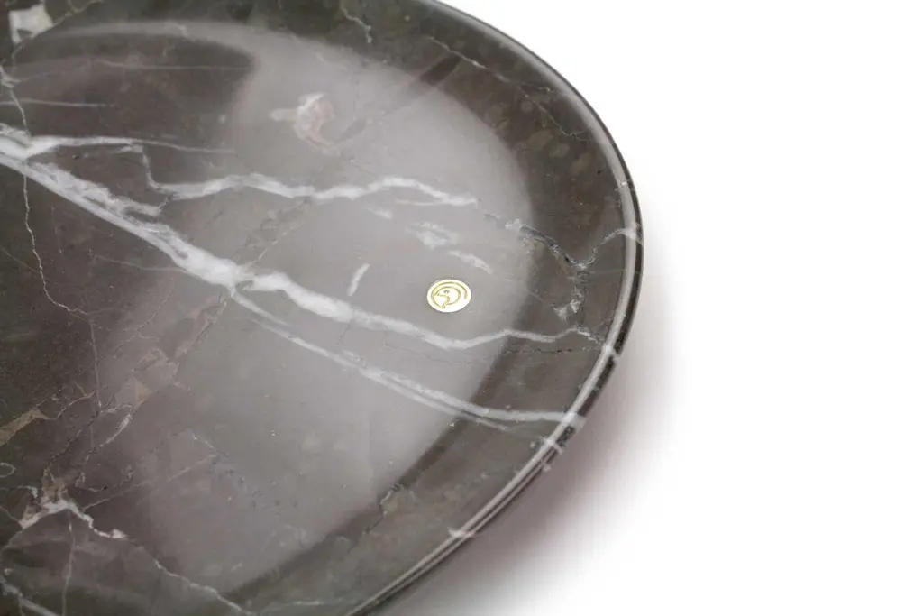 Hand carved presentation plate from Imperial grey marble. Multiple use as plates, platters and placers. Dimensions: Small L 24, W 20, H 1.8 cm, also available: Medium L 30, W 28, H 1.8 cm, big L 36, W 35, H 1.8 cm.Available in different marbles, onyx and quartzite. 100% Hand made in Italy.Marble is a natural material, every piece is unique as each marble block is different in veins and color shades. All of our creations are handmade by Italian artisans and can slightly vary in shape and size. This is to be considered as a guarantee of a handmade object. All Pieruga objects are made of precious and natural marbles and onyx. Marble is sensitive to acid-based liquids, especially a prolonged contact with substances such as wine, lemon, vinegar, fruit juices, cola and alcohol can stain the surface. Cleaning should be carried out with a soft sponge, water and neutral detergent. Do not use metallic or abrasive sponges, do not wash in the dishwasher, do not use in the microwave. The color of the marble after washing can undergo variations due to the humidity trapped in the surface’s micro-pores. Once fully dried it will regain its original color. The brass inlays tend to oxidize over time, to make them return to shine again use a soft cotton pad soaked in a solution of water and traditional Marseille soap, gently rub over the brass inserts and rinse the surface thoroughly. We are against the use of chemical products, all Pieruga objects are processed and polished through long manual processes without the use of polishing liquids.Pieruga proudly creates elegant accessories and complements in marble through artisanal processes, bringing into dialogue ancient techniques of sculpture with advanced technologies. 100% handmade in Italy.Our mission is a clear signal of opposition to the enormous waste that occurs in the extraction and processing of large blocks of marble, tons of material are discarded and thrown, in disfigurement to the generosity of our mountains.Rediscovering the ancient art of manual sculpture we give new life to even the smallest fragment of marble, bringing to light its millenary beauty that is lost in more than 2000 years of architecture and sculpture.Pieruga marble is a new brand by Barberini & Gunnell.The Atelier Barberini & Gunnell was founded by the architects and designers Francesco Barberini and Nina A. Gunnell The artworks by Barberini & Gunnell are regularly shown at international art fairs, such as PAD London, PAD Genève, PAD Monaco, Salon Art and Design New York, Art Miami.