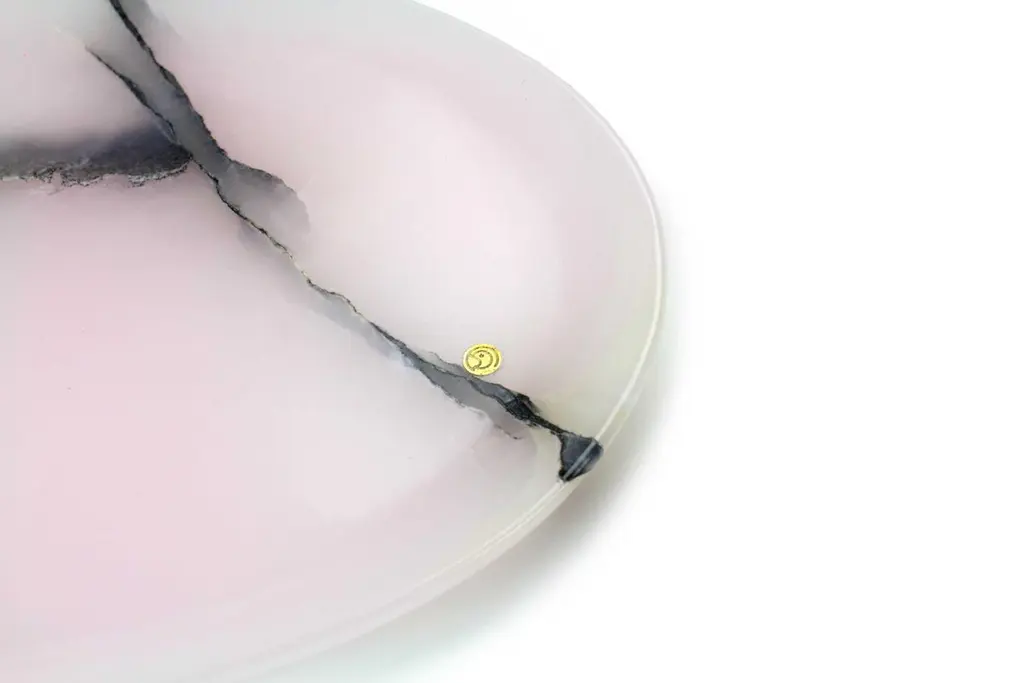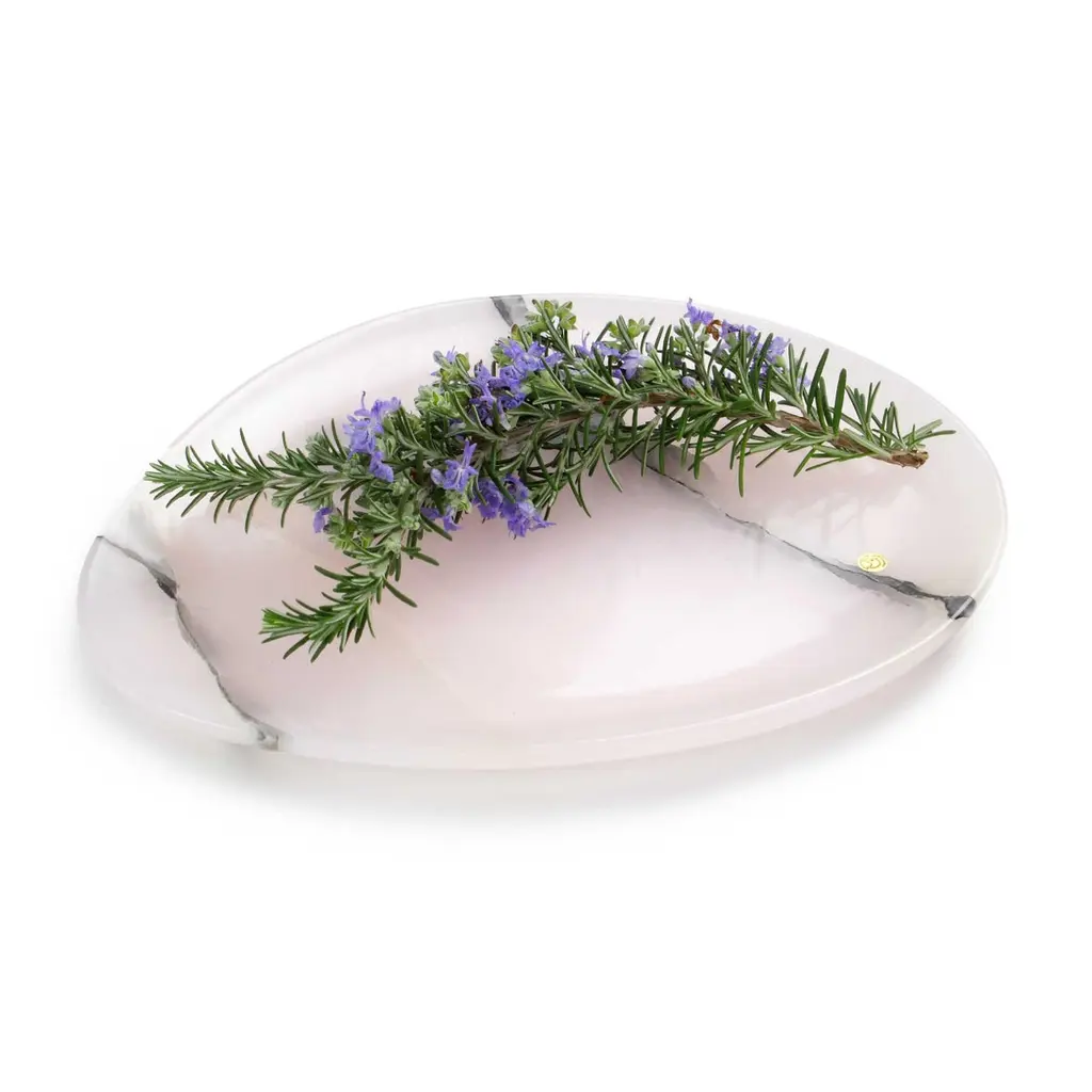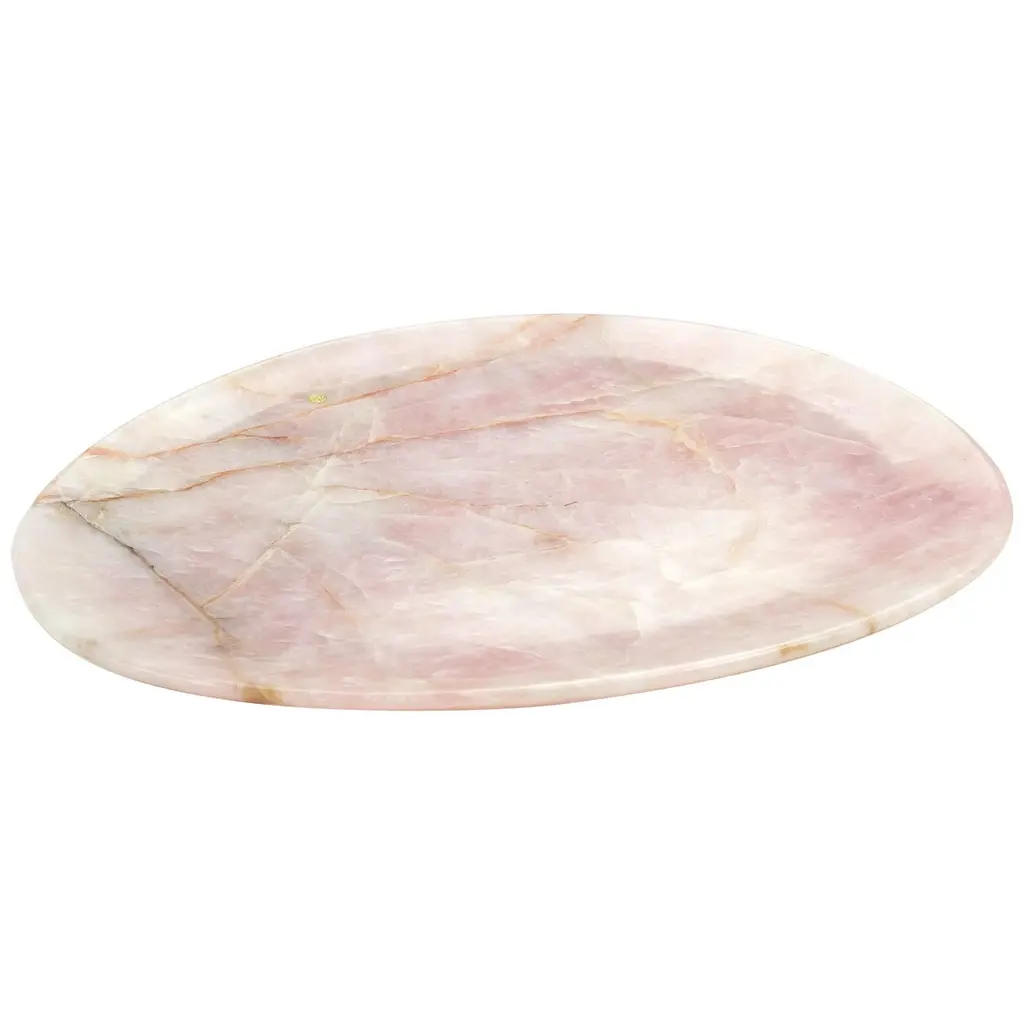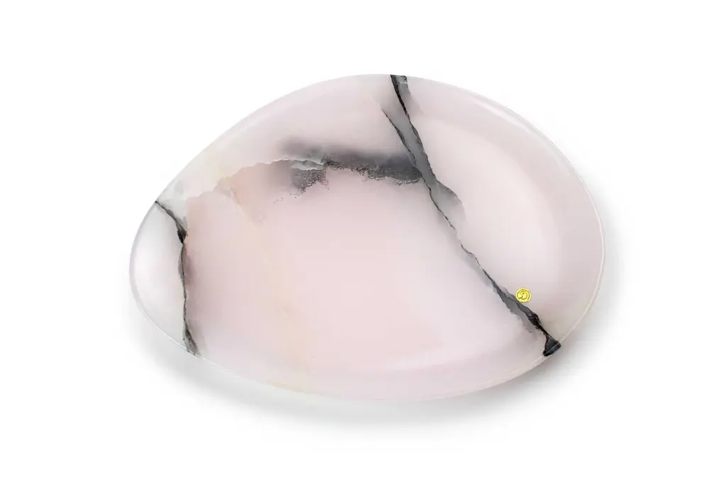Hand carved presentation plate from Pink onyx. Multiple use as plates, platters and placers. The polished finishing underlines the transparency of the onyx making this a very precious object. Dimensions: Small L 24, W 20, H 1.8 cm, also available: Medium L 30, W 28, H 1.8 cm, big L 36, W 35 H1.8 cm.Available in different marbles, onyx and quartzite.100% Hand made in Italy.Onyx is a natural material, every piece is unique as each onyx block is different in veins and color shades. All of our creations are handmade by Italian artisans and can slightly vary in shape and size. This is to be considered as a guarantee of a handmade object. All Pieruga objects are made of precious and natural marbles and onyx. Marble is sensitive to acid-based liquids, especially a prolonged contact with substances such as wine, lemon, vinegar, fruit juices, cola and alcohol can stain the surface.Cleaning should be carried out with a soft sponge, water and neutral detergent. Do not use metallic or abrasive sponges, do not wash in the dishwasher, do not use in the microwave. The color of the marble after washing can undergo variations due to the humidity trapped in the surface’s micro-pores. Once fully dried it will regain its original color. The brass inlays tend to oxidize over time, to make them return to shine again use a soft cotton pad soaked in a solution of water and traditional Marseille soap, gently rub over the brass inserts and rinse the surface thoroughly. We are against the use of chemical products, all Pieruga objects are processed and polished through long manual processes without the use of polishing liquids.Pieruga proudly creates elegant accessories and complements in marble through artisanal processes, bringing into dialogue ancient techniques of sculpture with advanced technologies. 100% handmade in Italy.Our mission is a clear signal of opposition to the enormous waste that occurs in the extraction and processing of large blocks of marble, tons of material are discarded and thrown, in disfigurement to the generosity of our mountains.Rediscovering the ancient art of manual sculpture we give new life to even the smallest fragment of marble, bringing to light its millenary beauty that is lost in more than 2000 years of architecture and sculpture.Pieruga marble is a new brand by Barberini & Gunnell.The Atelier Barberini & Gunnell was founded by the architects and designers Francesco Barberini and Nina A. Gunnell The artworks by Barberini & Gunnell are regularly shown at international art fairs, such as PAD London, PAD Genève, PAD Monaco, Salon Art and Design New York, Art Miami.