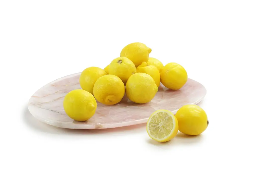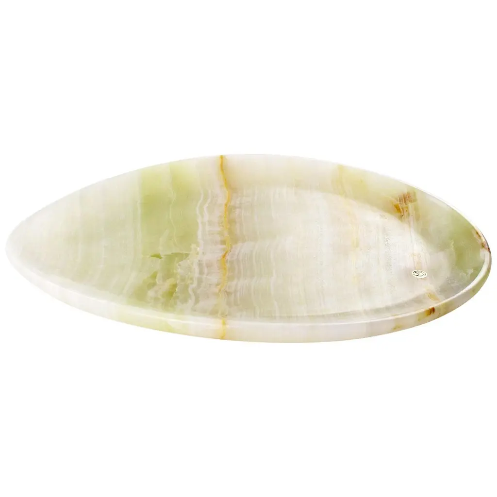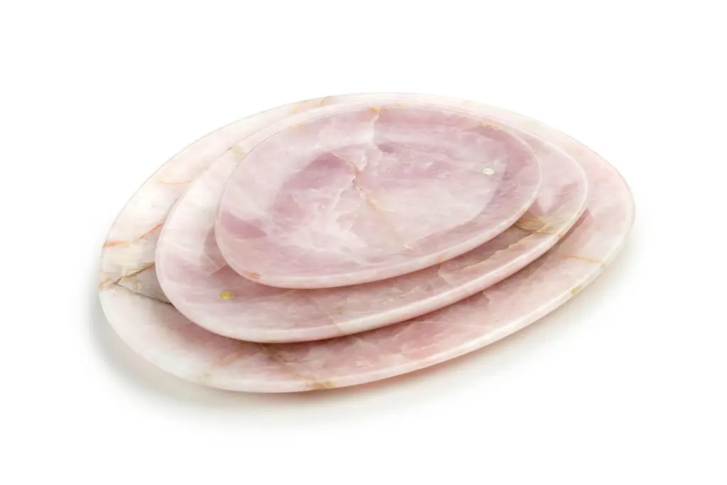 Hand carved presentation plate from precious Rose Quartz.Multiple use as plates, platters and placers. Dimensions: Big L 36, W 35, H 1.8 cm, also available: Medium L 30, W 28, H 1.8 cm / small L 24, W 20, H 1.8 cm.Also available in different marbles, onyx and quartzite. 100% Hand made in Italy. Quartz is a natural material, every piece is unique as each quartz block is different in veins and color shades. All of our creations are handmade by Italian artisans and can slightly vary in shape and size. This is to be considered as a guarantee of a handmade object. All Pieruga objects are made of precious and natural marbles and onyx. Marble is sensitive to acid-based liquids, especially a prolonged contact with substances such as wine, lemon, vinegar, fruit juices, cola and alcohol can stain the surface.Cleaning should be carried out with a soft sponge, water and neutral detergent. Do not use metallic or abrasive sponges, do not wash in the dishwasher, do not use in the microwave. The color of the marble after washing can undergo variations due to the humidity trapped in the surface’s micro-pores. Once fully dried it will regain its original color. The brass inlays tend to oxidize over time, to make them return to shine again use a soft cotton pad soaked in a solution of water and traditional Marseille soap, gently rub over the brass inserts and rinse the surface thoroughly. We are against the use of chemical products, all Pieruga objects are processed and polished through long manual processes without the use of polishing liquids.Pieruga proudly creates elegant accessories and complements in marble through artisanal processes, bringing into dialogue ancient techniques of sculpture with advanced technologies. 100% handmade in Italy.Our Mission is a clear Signal of opposition to the enormous waste that occurs in the extraction and processing of large blocks of marble, tons of material are discarded and thrown, in disfigurement to the generosity of our mountains.Rediscovering the ancient art of manual sculpture we give new life to even the smallest fragment of marble, bringing to light its millenary beauty that is lost in more than 2000 years of architecture and sculpture.Pieruga Marble is a new brand by Barberini & Gunnell.The Atelier Barberini & Gunnell was founded by the architects and designers Francesco Barberini and Nina A. Gunnell The artworks by Barberini & Gunnell are regularly shown at international art fairs, such as PAD London, PAD Genève, PAD Monaco, Salon Art + Design New York, Art Miami.