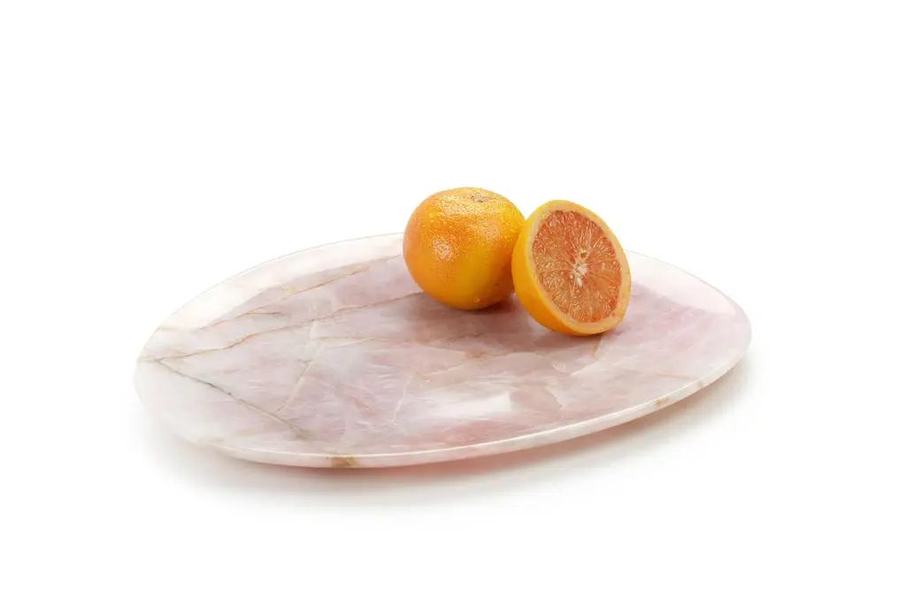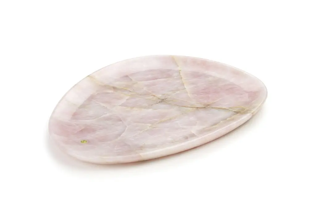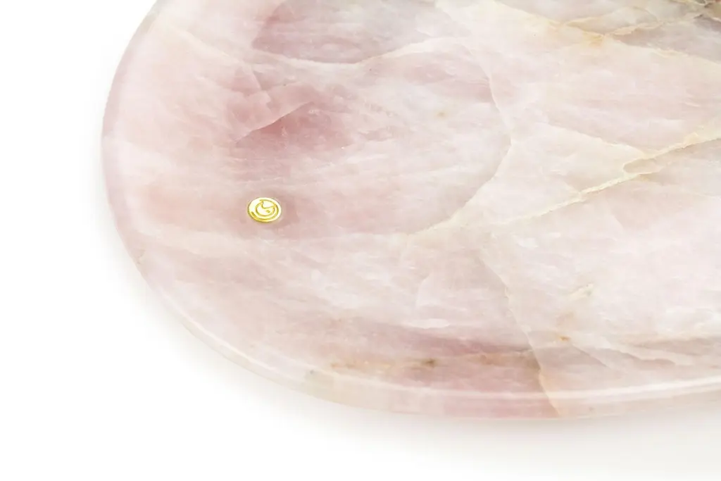 Hand carved presentation plate from precious Rose Quartz.Multiple use as plates, platters and placers. Dimensions: Medium L 30, W 28, H 1.8 cm, also available: Big L 36, W 35, H 1.8 cm, small L 24, W 20, H 1.8 cm.Available in different marbles, onyx and quartzite. 100% Hand made in Italy. Quartz is a natural material, every piece is unique as each quartz block is different in veins and color shades. All of our creations are handmade by Italian artisans and can slightly vary in shape and size. This is to be considered as a guarantee of a handmade object. All Pieruga objects are made of precious and natural marbles and onyx. Marble is sensitive to acid-based liquids, especially a prolonged contact with substances such as wine, lemon, vinegar, fruit juices, cola and alcohol can stain the surface.Cleaning should be carried out with a soft sponge, water and neutral detergent. Do not use metallic or abrasive sponges, do not wash in the dishwasher, do not use in the microwave. The color of the marble after washing can undergo variations due to the humidity trapped in the surface’s micro-pores. Once fully dried it will regain its original color. The brass inlays tend to oxidize over time, to make them return to shine again use a soft cotton pad soaked in a solution of water and traditional Marseille soap, gently rub over the brass inserts and rinse the surface thoroughly. We are against the use of chemical products, all Pieruga objects are processed and polished through long manual processes without the use of polishing liquids.Pieruga proudly creates elegant accessories and complements in marble through artisanal processes, bringing into dialogue ancient techniques of sculpture with advanced technologies. 100% handmade in Italy.Our Mission is a clear Signal of opposition to the enormous waste that occurs in the extraction and processing of large blocks of marble, tons of material are discarded and thrown, in disfigurement to the generosity of our mountains.Rediscovering the ancient art of manual sculpture we give new life to even the smallest fragment of marble, bringing to light its millenary beauty that is lost in more than 2000 years of architecture and sculpture.Pieruga marble is a new brand by Barberini & Gunnell.The Atelier Barberini & Gunnell was founded by the architects and designers Francesco Barberini and Nina A. Gunnell The artworks by Barberini & Gunnell are regularly shown at international art fairs, such as PAD London, PAD Genève, PAD Monaco, Salon Art and Design New York, Art Miami.