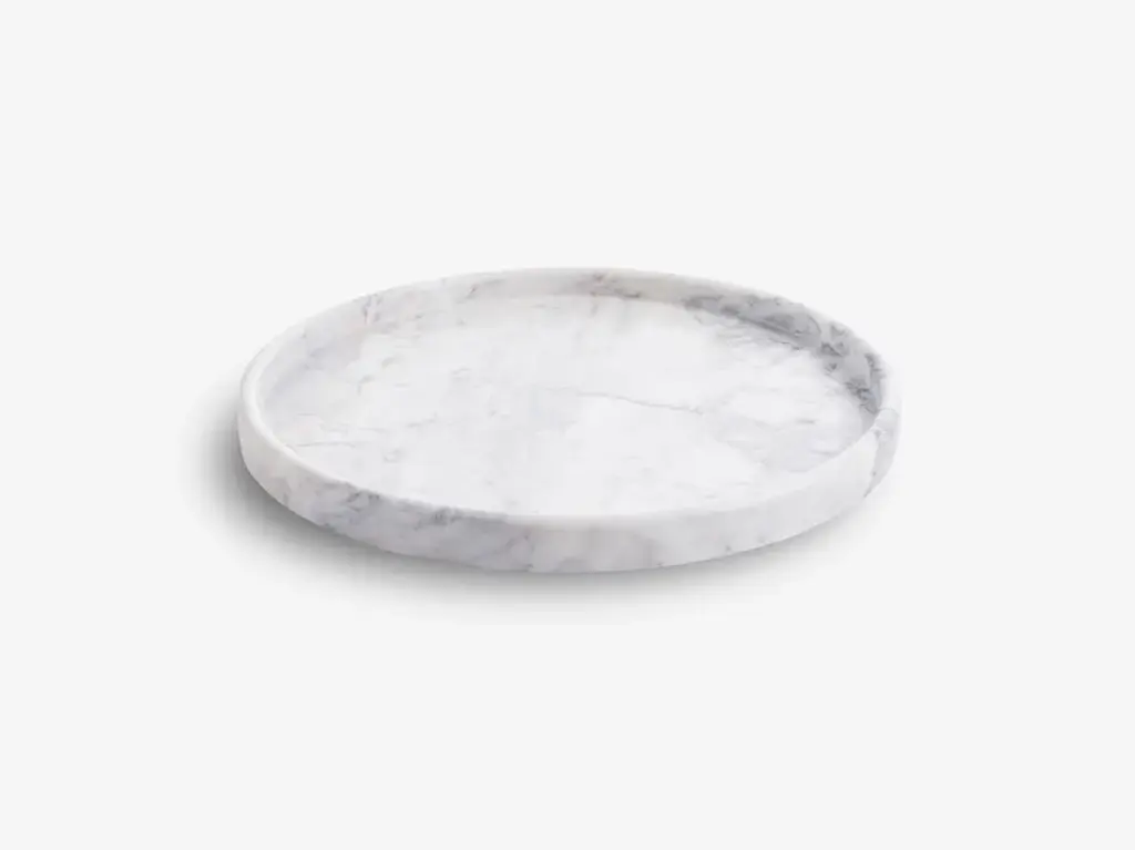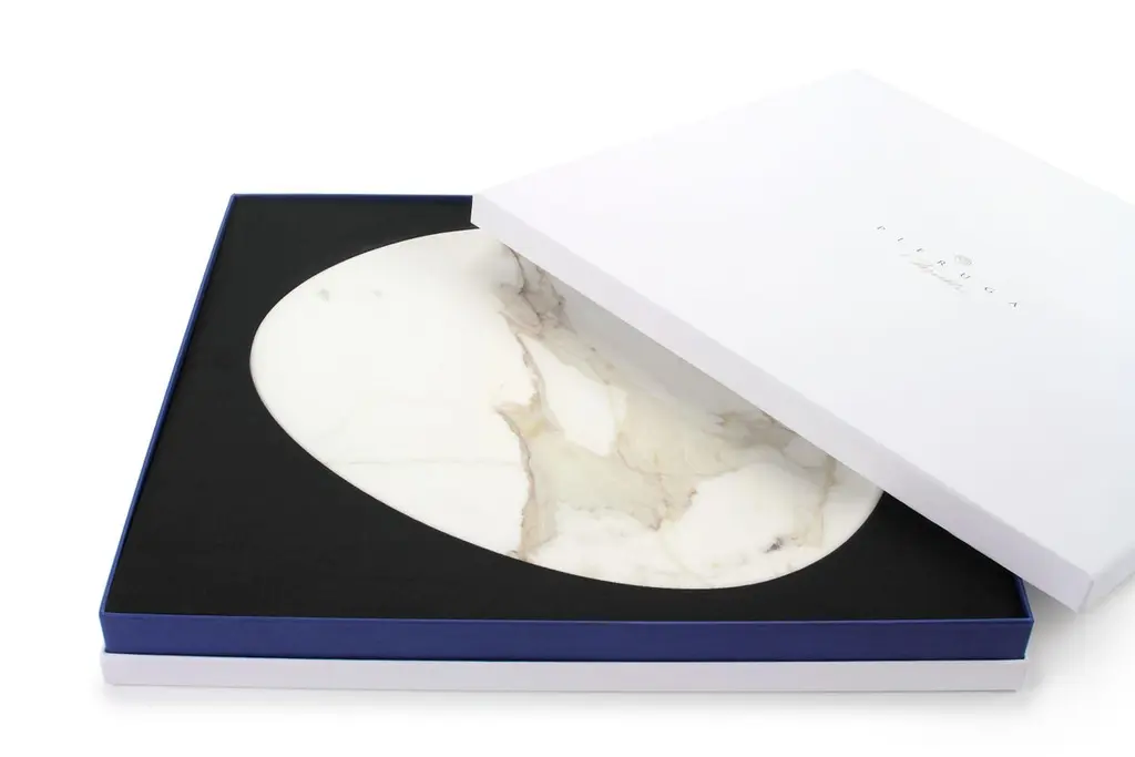 Hand carved presentation plate from Calacatta marble. Multiple use as plates, platters and placers. Dimensions: Big L 36, W 35, H 1.8 cm, also available: Small L 24, W 20, H 1.8 cm, medium L 30, W 28, H 1.8 cm.Available in different marbles, onyx and quartzite. 100% Hand made in Italy. Marble is a natural material, every piece is unique as each marble block is different in veins and color shades. All of our creations are handmade by Italian artisans and can slightly vary in shape and size. This is to be considered as a guarantee of a handmade object. All Pieruga objects are made of precious and natural marbles and onyx. Marble is sensitive to acid-based liquids, especially a prolonged contact with such as wine, lemon, vinegar, fruit juices, cola and alcohol can stain the surface.Cleaning should be carried out with a soft sponge, water and neutral detergent. Do not use metallic or abrasive sponges, do not wash in the dishwasher, do not use in the microwave. The color of the marble after washing can undergo variations due to the humidity trapped in the surface’s micro-pores. Once fully dried it will regain its original color. The brass inlays tend to oxidize over time, to make them return to shine again use a soft cotton pad soaked in a solution of water and traditional Marseille soap, gently rub over the brass inserts and rinse the surface thoroughly. We are against the use of chemical products, all Pieruga objects are processed and polished through long manual processes without the use of polishing liquids.Pieruga proudly creates elegant accessories and complements in marble through artisanal processes, bringing into dialogue ancient techniques of sculpture with advanced technologies. 100% handmade in Italy.Our mission is a clear signal of opposition to the enormous waste that occurs in the extraction and processing of large blocks of marble, tons of material are discarded and thrown, in disfigurement to the generosity of our mountains.Rediscovering the ancient art of manual sculpture we give new life to even the smallest fragment of marble, bringing to light its millenary beauty that is lost in more than 2000 years of architecture and sculpture.Pieruga marble is a new brand by Barberini & Gunnell.The Atelier Barberini & Gunnell was founded by the architects and designers Francesco Barberini and Nina A. Gunnell The artworks by Barberini & Gunnell are regularly shown at international art fairs, such as PAD London, PAD Genève, PAD Monaco, Salon Art + Design New York, Art Miami.IMPORTANT INFORMATION REGARDING SHIPPING:We carefully pack all artworks in strong wooden crates to ensure safe transport. This service is done directly in our atelier and is complimentary. All of our artworks travel with a shock watch system in order to monitorate rough handling by shippers and movers.