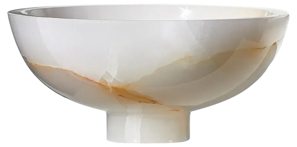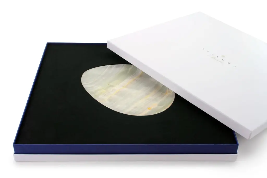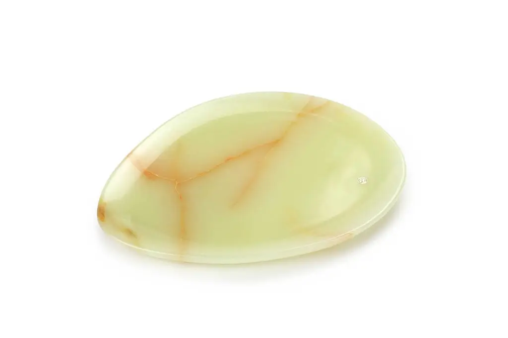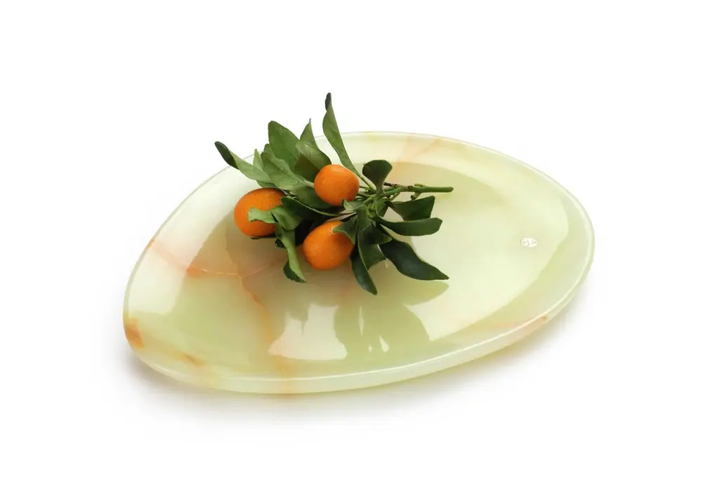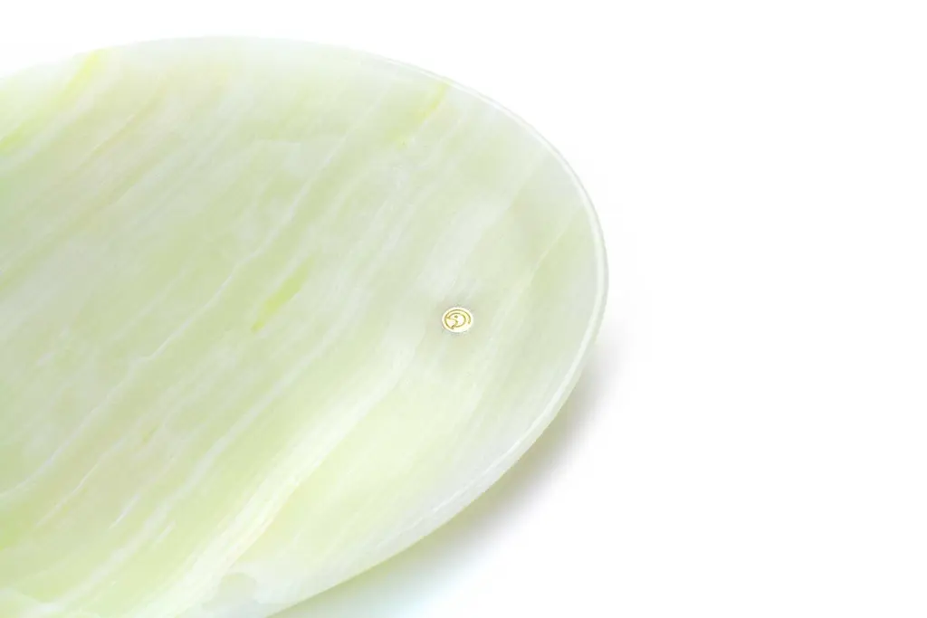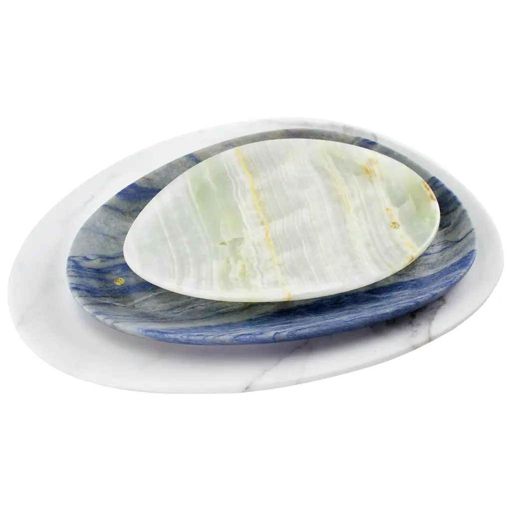 Hand carved presentation plate from Green onyx. Multiple use as plates, platters and placers. The polished finishing underlines the transparency of the onyx making this a very precious object. Dimensions: Small L 24, W 20, H 1.8 cm, also available: Medium L 30, W 28, H 1.8 cm, big L 36, W 35, H 1.8 cm.Also available in different marbles, onyx and quartzite. 100% Hand made in Italy. Onyx is a natural material, every piece is unique as each onyx block is different in veins and color shades. All of our creations are handmade by Italian artisans and can slightly vary in shape and size. This is to be considered as a guarantee of a handmade object. All Pieruga objects are made of precious and natural marbles and onyx. Marble is sensitive to acid-based liquids, especially a prolonged contact with substances such as wine, lemon, vinegar, fruit juices, cola and alcohol can stain the surface.Cleaning should be carried out with a soft sponge, water and neutral detergent. Do not use metallic or abrasive sponges, do not wash in the dishwasher, do not use in the microwave. The color of the marble after washing can undergo variations due to the humidity trapped in the surface’s micro-pores. Once fully dried it will regain its original color. The brass inlays tend to oxidize over time, to make them return to shine again use a soft cotton pad soaked in a solution of water and traditional Marseille soap, gently rub over the brass inserts and rinse the surface thoroughly. We are against the use of chemical products, all Pieruga objects are processed and polished through long manual processes without the use of polishing liquids.Pieruga proudly creates elegant accessories and complements in marble through artisanal processes, bringing into dialogue ancient techniques of sculpture with advanced technologies. 100% handmade in Italy.Our mission is a clear signal of opposition to the enormous waste that occurs in the extraction and processing of large blocks of marble, tons of material are discarded and thrown, in disfigurement to the generosity of our mountains.Rediscovering the ancient art of manual sculpture we give new life to even the smallest fragment of marble, bringing to light its millenary beauty that is lost in more than 2000 years of architecture and sculpture.Pieruga marble is a new brand by Barberini & Gunnell.The Atelier Barberini & Gunnell was founded by the architects and designers Francesco Barberini and Nina A. Gunnell The artworks by Barberini & Gunnell are regularly shown at international art fairs, such as PAD London, PAD Genève, PAD Monaco, Salon Art + Design New York, Art Miami.