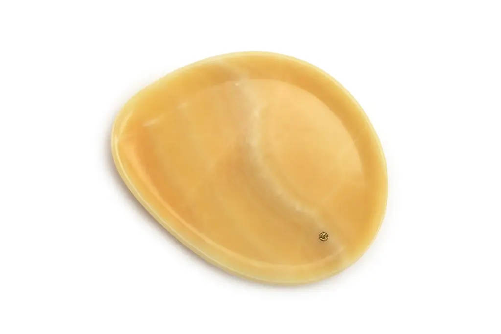Hand carved presentation plate from orange onyx. Multiple use as plates, platters and placers. The polished finishing underlines the transparency of the onyx making this a very precious object. Dimensions: Small L 24, W 20, H 1.8 cm, also available: Medium L 30, W 28, H 1.8 cm, Big L 36, W 35, H 1.8 cm.Available in different marbles, onyx and quartzite. 100% Hand made in Italy. Onyx is a natural material, every piece is unique as each onyx block is different in veins and color shades. All of our creations are handmade by Italian artisans and can slightly vary in shape and size. This is to be considered as a guarantee of a handmade object. All Pieruga objects are made of precious and natural marbles and onyx. Marble is sensitive to acid-based liquids, especially a prolonged contact with substances such as wine, lemon, vinegar, fruit juices, cola and alcohol can stain the surface.Cleaning should be carried out with a soft sponge, water and neutral detergent. Do not use metallic or abrasive sponges, do not wash in the dishwasher, do not use in the microwave. The color of the marble after washing can undergo variations due to the humidity trapped in the surface’s micro-pores. Once fully dried it will regain its original color. The brass inlays tend to oxidize over time, to make them return to shine again use a soft cotton pad soaked in a solution of water and traditional Marseille soap, gently rub over the brass inserts and rinse the surface thoroughly. We are against the use of chemical products, all Pieruga objects are processed and polished through long manual processes without the use of polishing liquids.Pieruga proudly creates elegant accessories and complements in marble through artisanal processes, bringing into dialogue ancient techniques of sculpture with advanced technologies. 100% handmade in Italy.Our mission is a clear signal of opposition to the enormous waste that occurs in the extraction and processing of large blocks of marble, tons of material are discarded and thrown, in disfigurement to the generosity of our mountains.Rediscovering the ancient art of manual sculpture we give new life to even the smallest fragment of marble, bringing to light its millenary beauty that is lost in more than 2000 years of architecture and sculpture.Pieruga marble is a new brand by Barberini & Gunnell.The Atelier Barberini & Gunnell was founded by the architects and designers Francesco Barberini and Nina A. Gunnell The artworks by Barberini & Gunnell are regularly shown at international art fairs, such as PAD London, PAD Genève, PAD Monaco, Salon Art + Design New York, Art Miami.