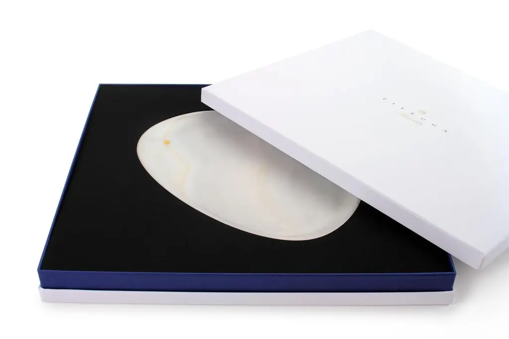 Hand carved presentation plate from White onyx. Multiple use as plates, platters and placers. The polished finishing underlines the transparency of the onyx making this a very precious object. Dimensions: Medium - L30 W28 H1.8 cm, also available: Small - L 24 W 20 H 1.8 cm / Big - L 36 W 35 H 1.8 cm.Available in different marbles, onyx and quartzite. 100% Hand made in Italy. Onyx is a natural material, every piece is unique as each onyx block is different in veins and color shades. All of our creations are handmade by Italian artisans and can slightly vary in shape and size. This is to be considered as a guarantee of a handmade object. All Pieruga objects are made of precious and natural marbles and onyx. Marble is sensitive to acid-based liquids, especially a prolonged contact with substances such as wine, lemon, vinegar, fruit juices, cola and alcohol can stain the surface.Cleaning should be carried out with a soft sponge, water and neutral detergent. Do not use metallic or abrasive sponges, do not wash in the dishwasher, do not use in the microwave. The color of the marble after washing can undergo variations due to the humidity trapped in the surface’s micro-pores. Once fully dried it will regain its original color. The brass inlays tend to oxidize over time, to make them return to shine again use a soft cotton pad soaked in a solution of water and traditional Marseille soap, gently rub over the brass inserts and rinse the surface thoroughly. We are against the use of chemical products, all Pieruga objects are processed and polished through long manual processes without the use of polishing liquids.Pieruga proudly creates elegant accessories and complements in marble through artisanal processes, bringing into dialogue ancient techniques of sculpture with advanced technologies. 100% handmade in Italy.Our mission is a clear signal of opposition to the enormous waste that occurs in the extraction and processing of large blocks of marble, tons of material are discarded and thrown, in disfigurement to the generosity of our mountains.Rediscovering the ancient art of manual sculpture we give new life to even the smallest fragment of marble, bringing to light its millenary beauty that is lost in more than 2000 years of architecture and sculpture.Pieruga marble is a new brand by Barberini & Gunnell.The Atelier Barberini & Gunnell was founded by the architects and designers Francesco Barberini and Nina A. Gunnell The artworks by Barberini & Gunnell are regularly shown at international art fairs, such as PAD London, PAD Genève, PAD Monaco, Salon Art + Design New York, Art Miami.