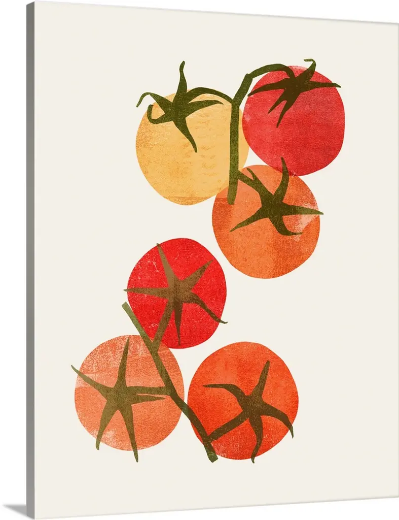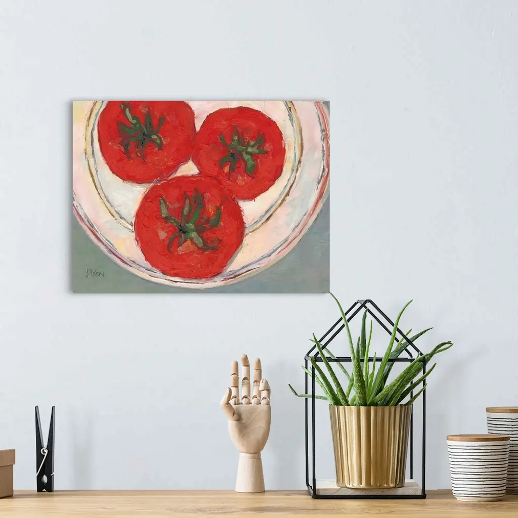 Painting of a plate of tomatoes, seen from above.