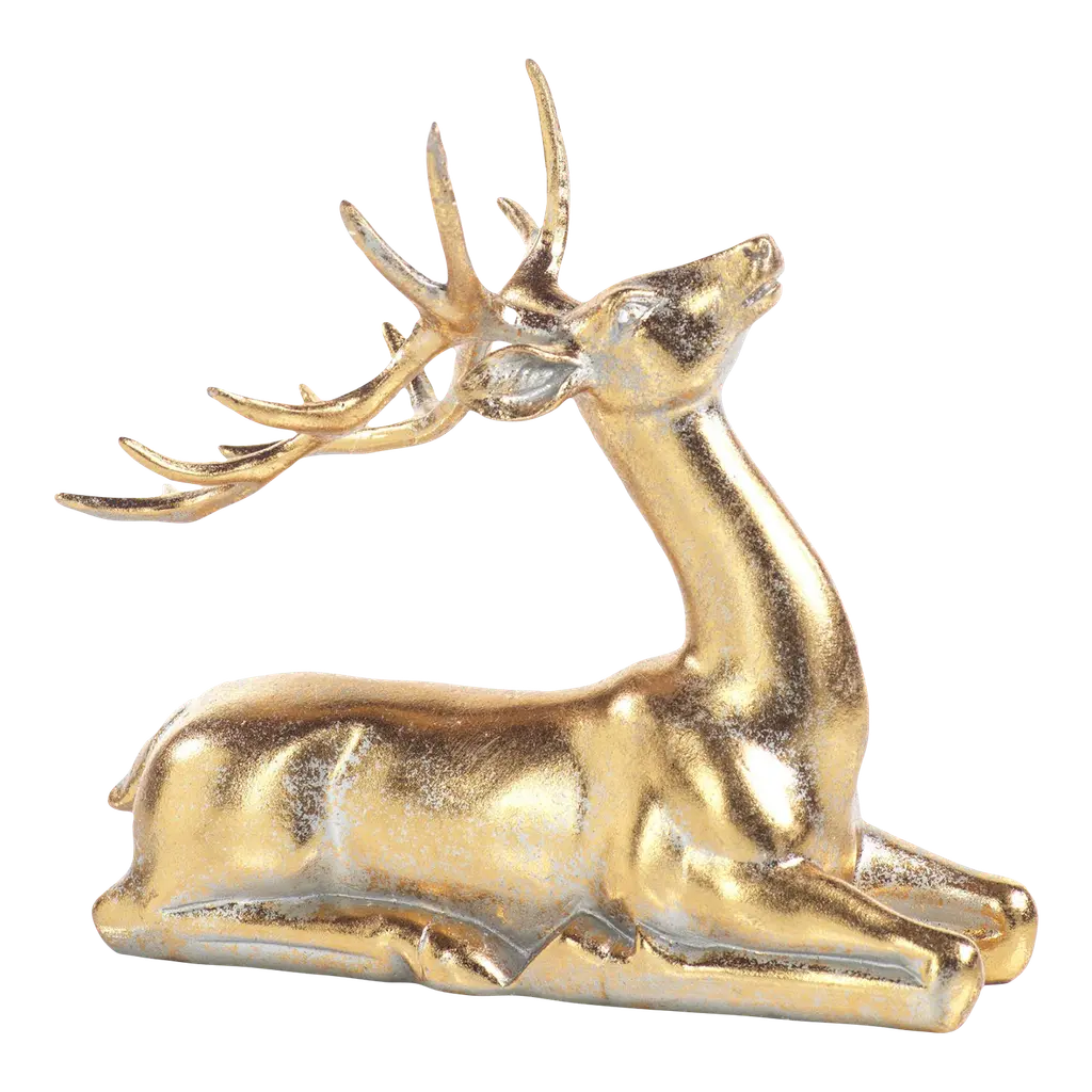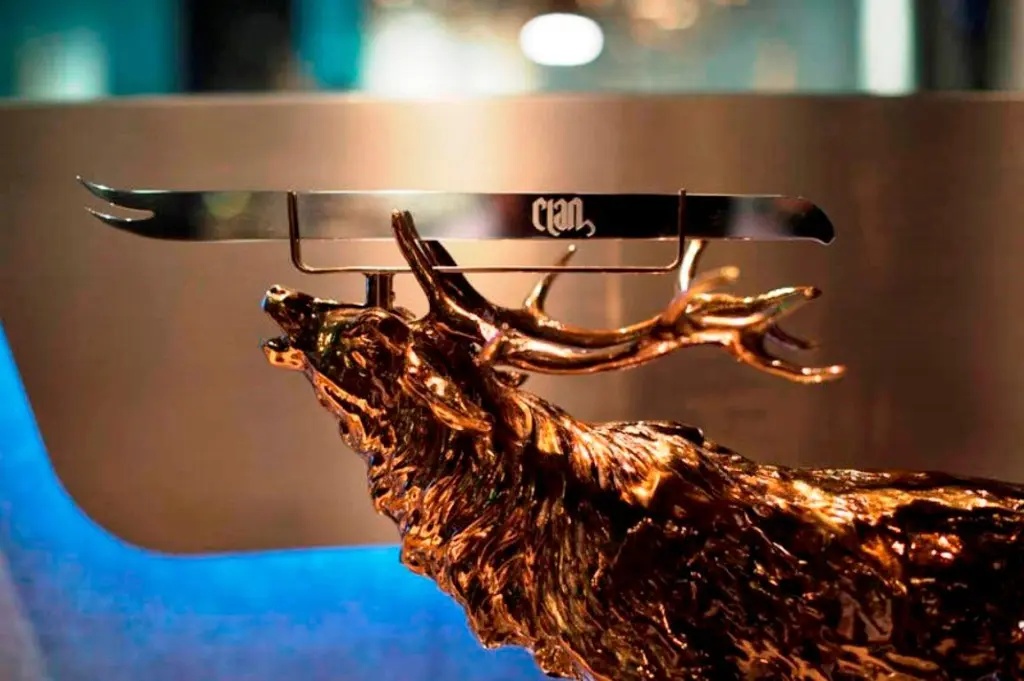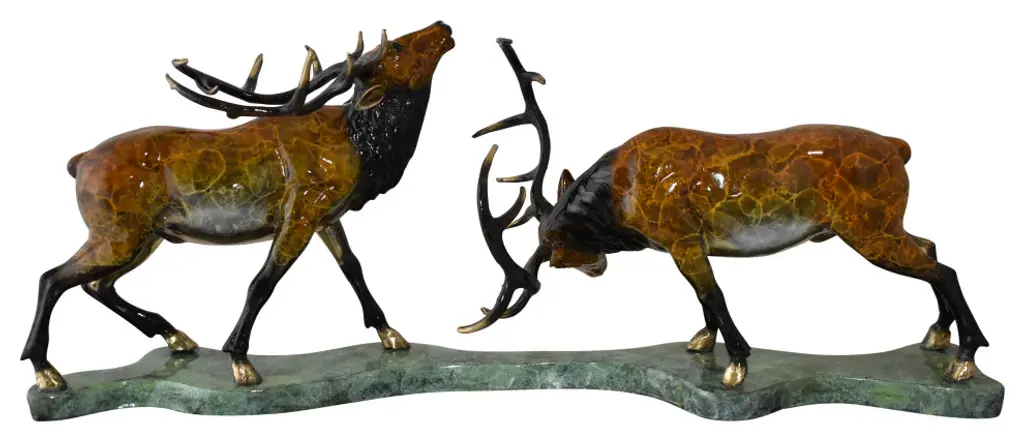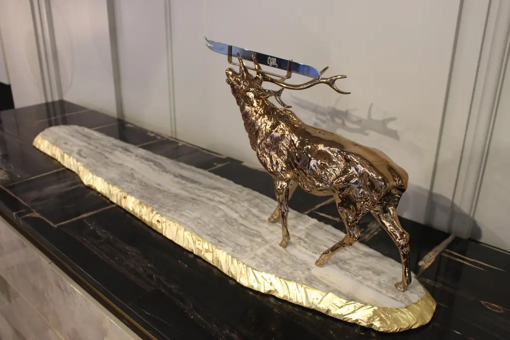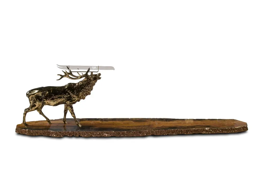 Marble base with hand split border in copper leaf. Deer sculpture in cast brass. Stainless steel knife.