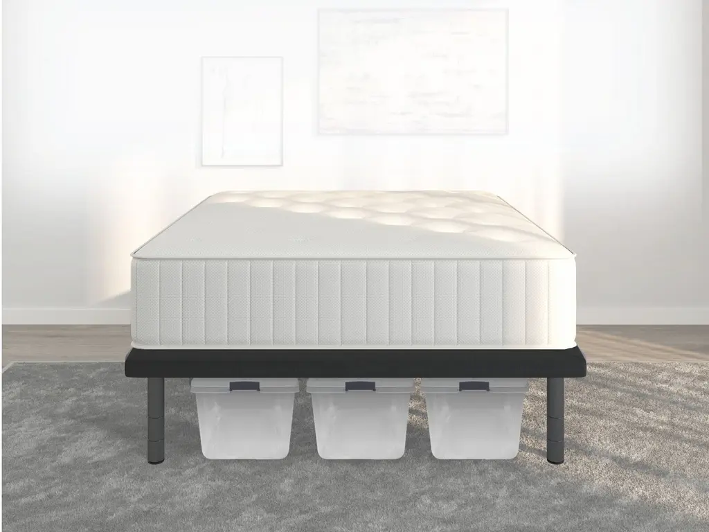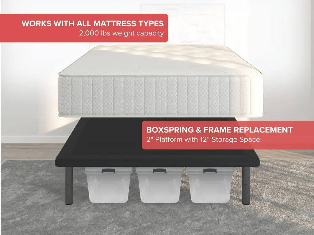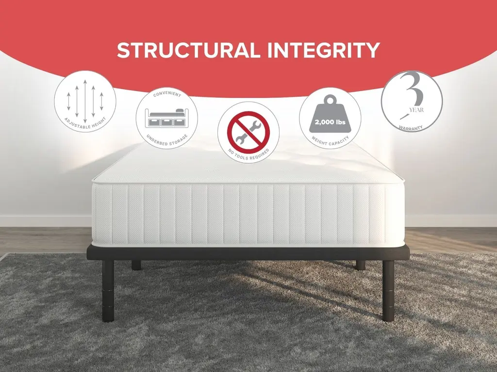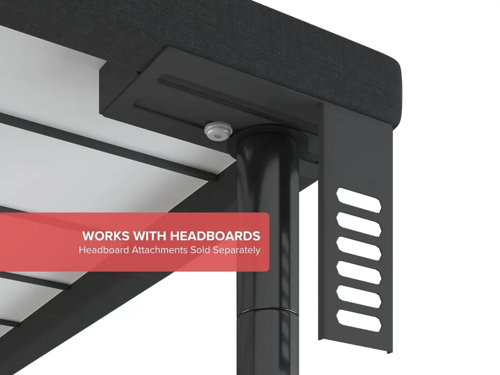 Today’s high quality mattresses were designed to perform with a sturdy non-yielding foundation system. The Plateau Platform Frame provides a complete mattress support system without the need for a boxspring. Upholstered with heavy duty fabric, it supports up to 2,000lbs. Assembly is easy, simply unfold the frame and screw on the height-adjustable legs – no tools needed. Works with headboards for a custom look, attachments sold separately. And with a 3-year limited warranty you can rest easy knowing your investment is protected.