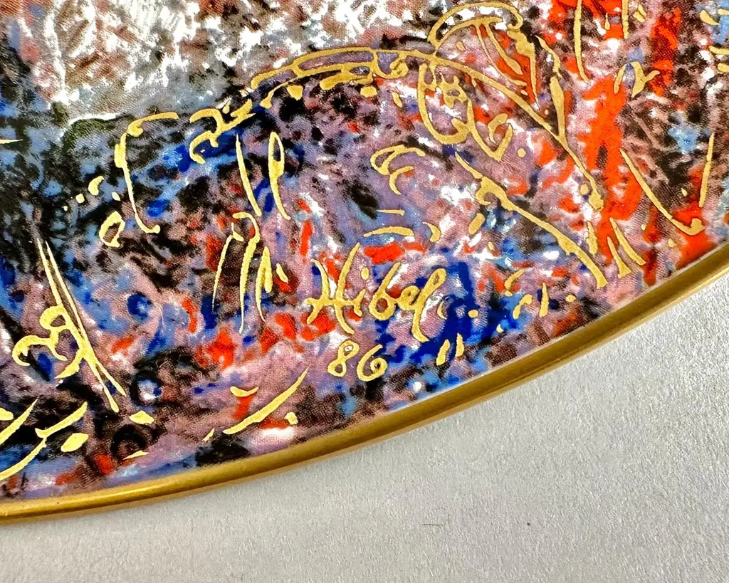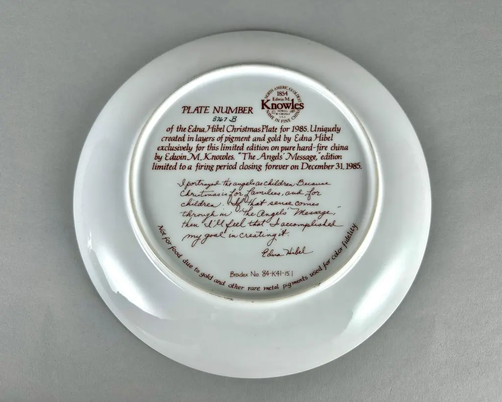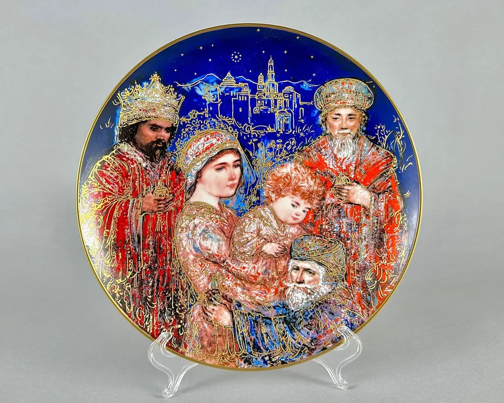 This lot includes three different plates, from 1985-89, the first plate collection created by Edna Hibel, produced by Knowles.All plates have hand applied gold to the rim. Beautiful and vibrant colors throughout. Each plate comes in the original Hibel boxes, with papers/COAs.“The Angels' Message” (1985)Plate No. 8161 B. Bradex Number 84-K41-15.1 "I portrayed the angels as children because Christmas is for families, and for children. If that sense comes through in The Angels' Message, then I'll feel that I accomplished my goal in creating it." -- Edna Hibel.“Peaceful Kingdom”Bradex number: 84-K41-15-5“The Gift of the Magi” ( 1986)Plate No. 20BBeautiful rich colors.PRICE FOR ONE PLATE.Dimensions:Diameter: 10.2 inch - 26 cm. The plates are in excellent condition.No chips, cracks or repairs.