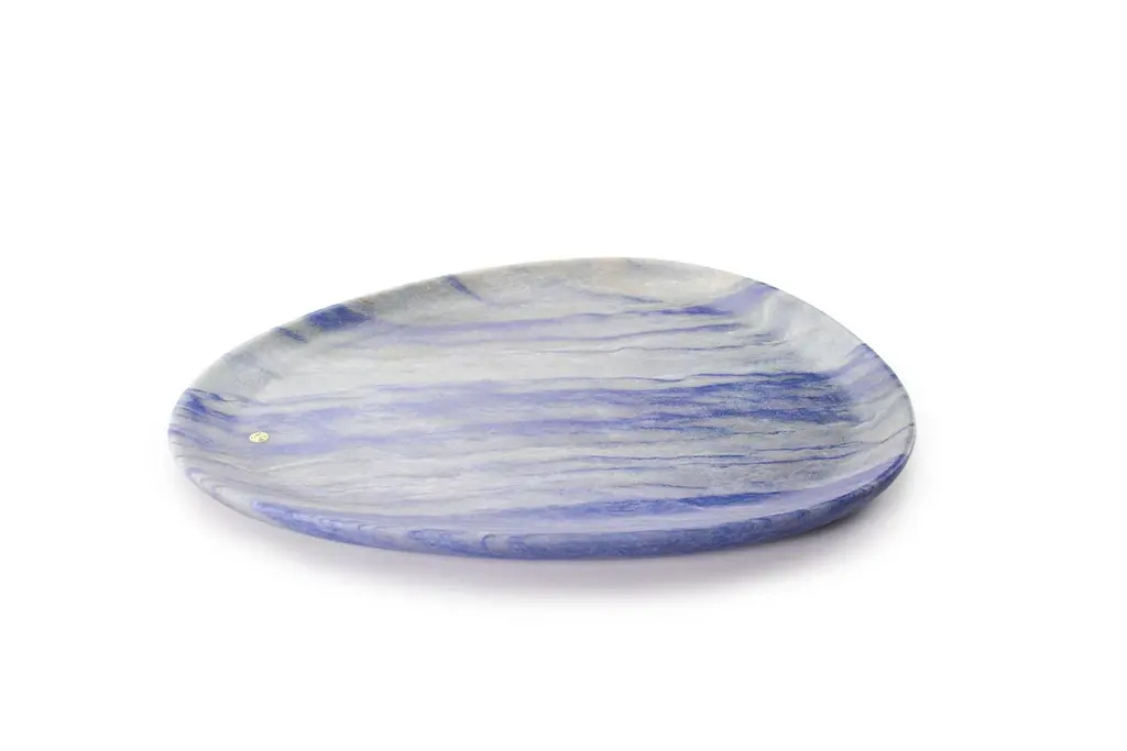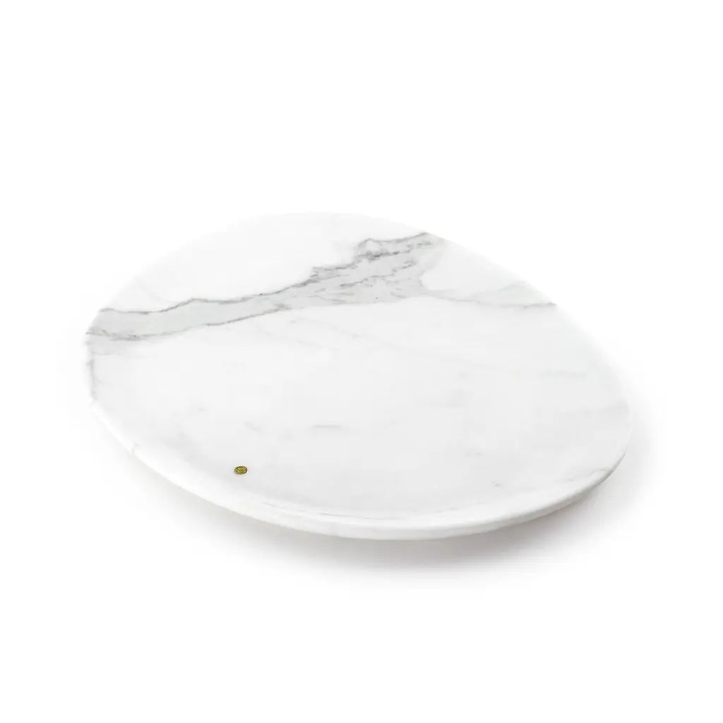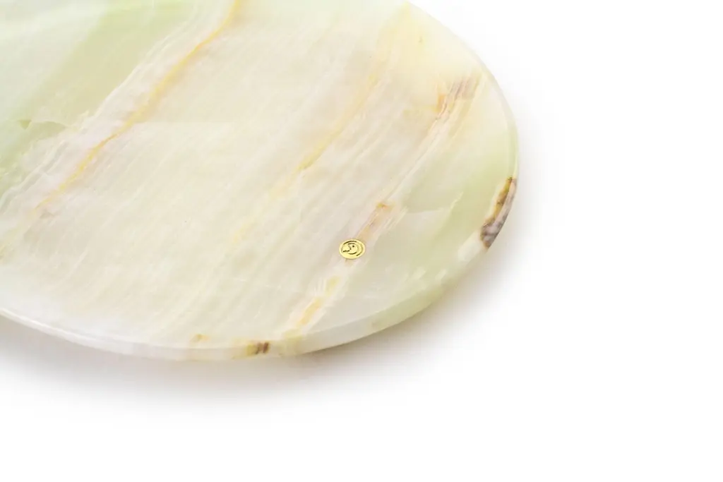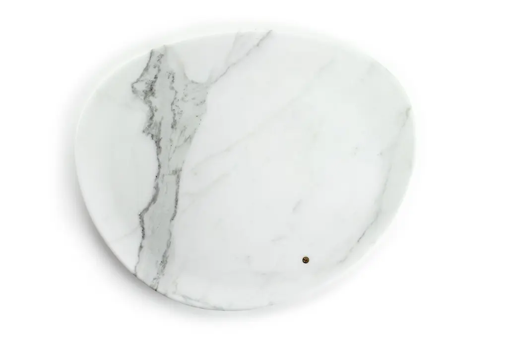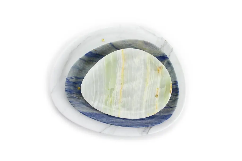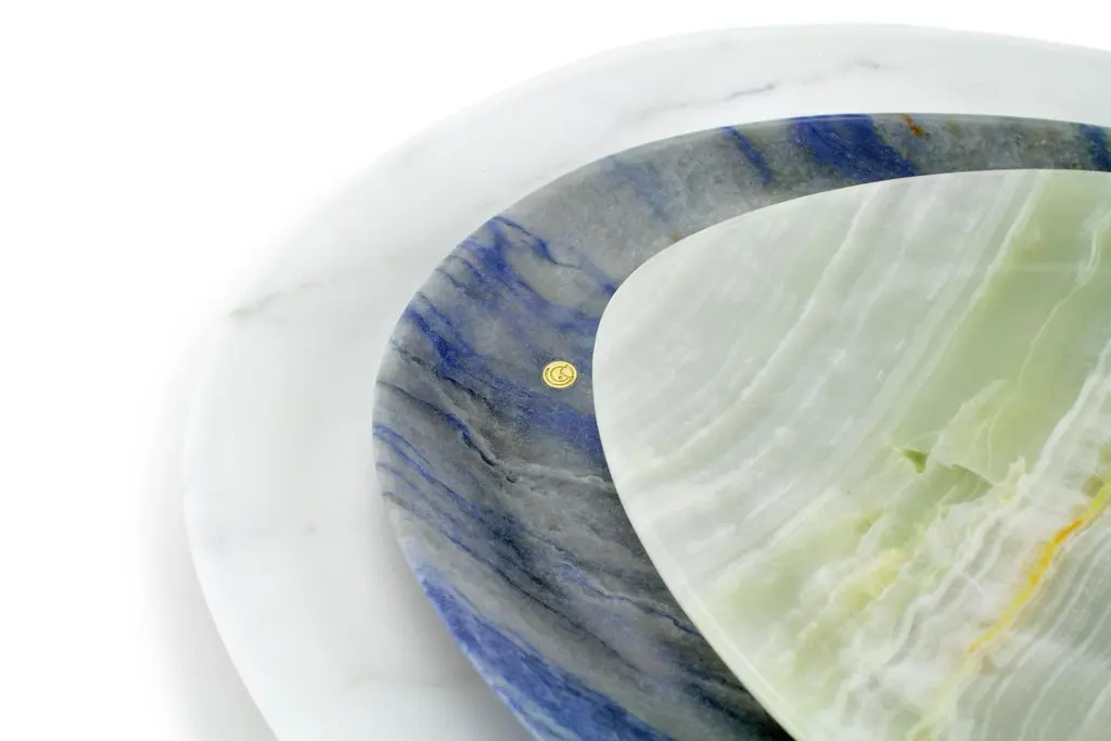 Hand carved presentation plates in Green onyx, Azul Macaubas Quartzite and Statuary marble. Multiple use as plates, platters and placers. Dimensions: Small - L24 W20 H1.8 cm, Medium - L30 W28 H1.8 cm, Big - L36 W35 H1.8 cm.Available in different marbles, onyx and quartzite. 100% Hand made in Italy. Marble is a natural material, every piece is unique as each marble block is different in veins and color shades. All of our creations are handmade by Italian artisans and can slightly vary in shape and size. This is to be considered as a guarantee of a handmade object. All Pieruga objects are made of precious and natural marbles and onyx. Marble is sensitive to acid-based liquids, especially a prolonged contact with substances such as wine, lemon, vinegar, fruit juices, cola and alcohol can stain the surface.Cleaning should be carried out with a soft sponge, water and neutral detergent. Do not use metallic or abrasive sponges, do not wash in the dishwasher, do not use in the microwave. The color of the marble after washing can undergo variations due to the humidity trapped in the surface’s micro-pores. Once fully dried it will regain its original color. The brass inlays tend to oxidize over time, to make them return to shine again use a soft cotton pad soaked in a solution of water and traditional Marseille soap, gently rub over the brass inserts and rinse the surface thoroughly. We are against the use of chemical products, all Pieruga objects are processed and polished through long manual processes without the use of polishing liquids.Pieruga proudly creates elegant accessories and complements in marble through artisanal processes, bringing into dialogue ancient techniques of sculpture with advanced technologies. 100% handmade in Italy.Our mission is a clear signal of opposition to the enormous waste that occurs in the extraction and processing of large blocks of marble, tons of material are discarded and thrown, in disfigurement to the generosity of our mountains.Rediscovering the ancient art of manual sculpture we give new life to even the smallest fragment of marble, bringing to light its millenary beauty that is lost in more than 2000 years of architecture and sculpture.Pieruga marble is a new brand by Barberini & Gunnell.The Atelier Barberini & Gunnell was founded by the architects and designers Francesco Barberini and Nina A. Gunnell The artworks by Barberini & Gunnell are regularly shown at international art fairs, such as PAD London, PAD Genève, PAD Monaco, Salon Art + Design New York, Art Miami.