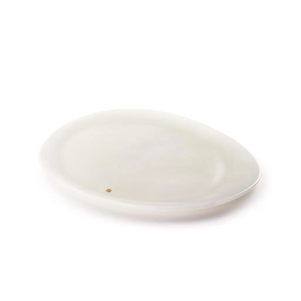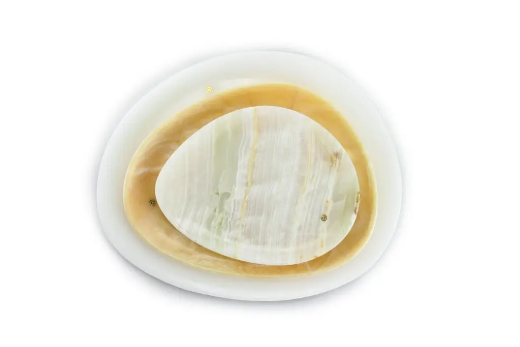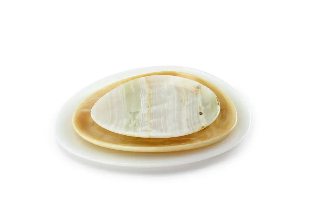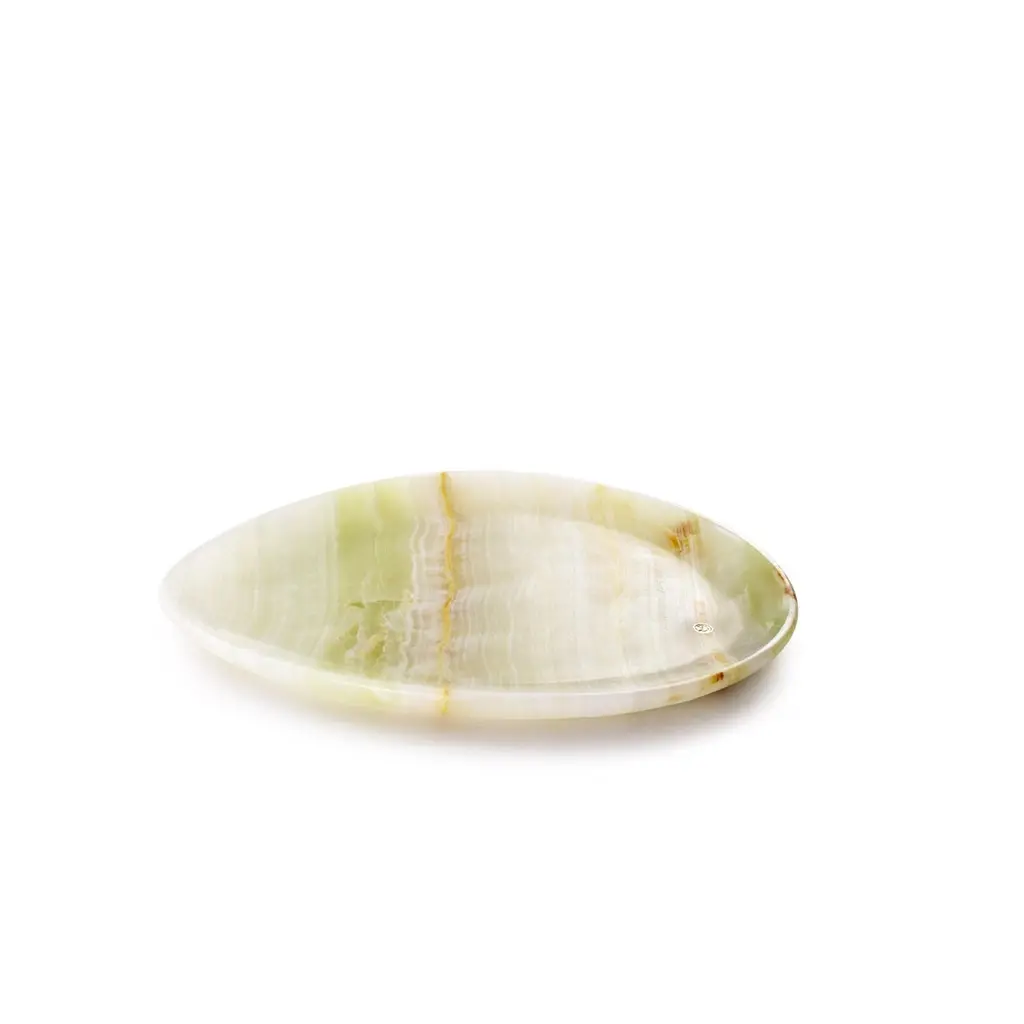 Hand carved presentation plates in Green onyx, Orange onyx and White onyx. Multiple use as plates, platters and placers. Dimensions: Small - L24 W20 H1.8 cm, Medium - L30 W28 H1.8 cm, Big - L36 W35 H1.8 cm.Available in different marbles, onyx and quartzite. 100% Hand made in Italy. Marble is a natural material, every piece is unique as each marble block is different in veins and color shades. All of our creations are handmade by Italian artisans and can slightly vary in shape and size. This is to be considered as a guarantee of a handmade object. All Pieruga objects are made of precious and natural marbles and onyx. Marble is sensitive to acid-based liquids, especially a prolonged contact with substances such as wine, lemon, vinegar, fruit juices, cola and alcohol can stain the surface.Cleaning should be carried out with a soft sponge, water and neutral detergent. Do not use metallic or abrasive sponges, do not wash in the dishwasher, do not use in the microwave. The color of the marble after washing can undergo variations due to the humidity trapped in the surface’s micro-pores. Once fully dried it will regain its original color. The brass inlays tend to oxidize over time, to make them return to shine again use a soft cotton pad soaked in a solution of water and traditional Marseille soap, gently rub over the brass inserts and rinse the surface thoroughly. We are against the use of chemical products, all Pieruga objects are processed and polished through long manual processes without the use of polishing liquids.Pieruga proudly creates elegant accessories and complements in marble through artisanal processes, bringing into dialogue ancient techniques of sculpture with advanced technologies. 100% handmade in Italy.Our mission is a clear signal of opposition to the enormous waste that occurs in the extraction and processing of large blocks of marble, tons of material are discarded and thrown, in disfigurement to the generosity of our mountains.Rediscovering the ancient art of manual sculpture we give new life to even the smallest fragment of marble, bringing to light its millenary beauty that is lost in more than 2000 years of architecture and sculpture.Pieruga marble is a new brand by Barberini & Gunnell.The Atelier Barberini & Gunnell was founded by the architects and designers Francesco Barberini and Nina A. Gunnell The artworks by Barberini & Gunnell are regularly shown at international art fairs, such as PAD London, PAD Genève, PAD Monaco, Salon Art + Design New York, Art Miami.