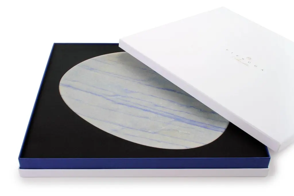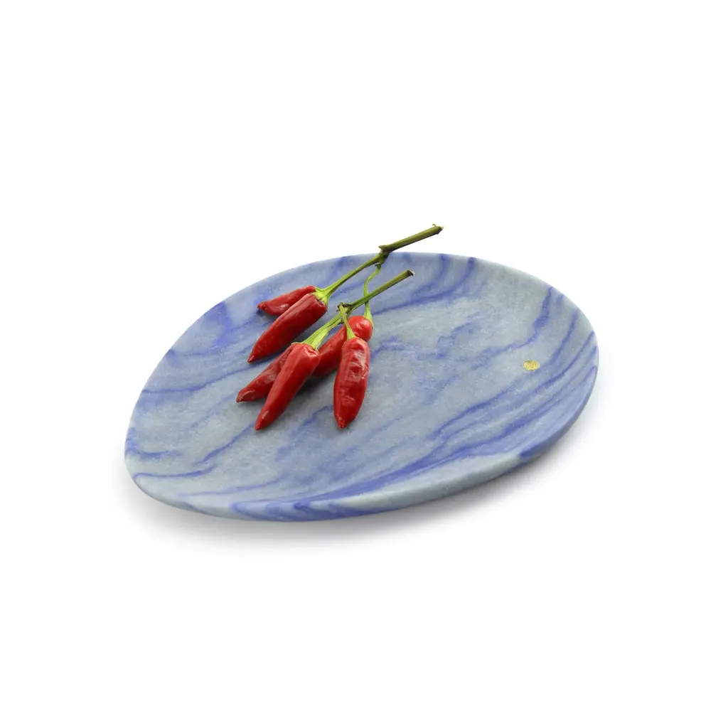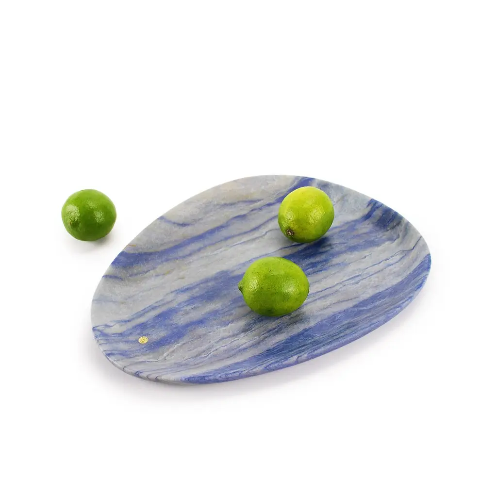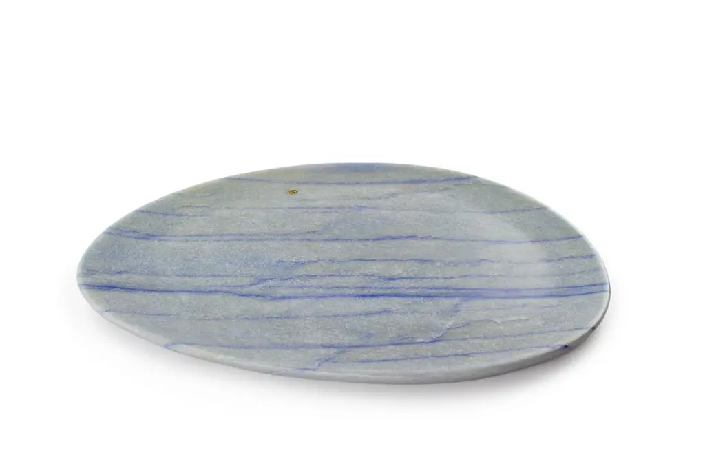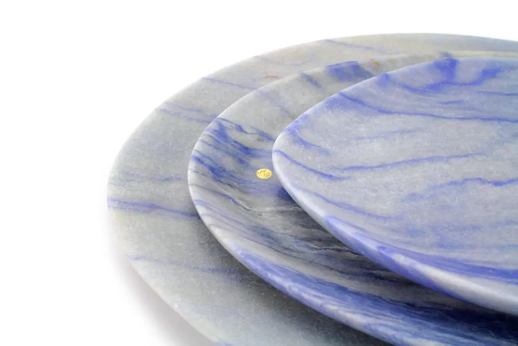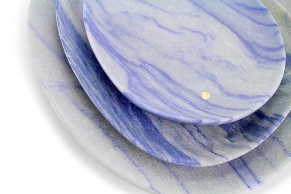 Hand carved presentation plates in semi-precious quartzite Azul Macaubas.Multiple use as plates, platters and placers. Dimensions: Small - L24 W20 H1.8 cm, Medium - L30 W28 H1.8 cm and Big - L36 W35 H1.8 cm.Available in different marbles, onyx and quartzite. 100% Hand made in Italy. Marble is a natural material, every piece is unique as each marble block is different in veins and color shades. All of our creations are handmade by Italian artisans and can slightly vary in shape and size. This is to be considered as a guarantee of a handmade object. All Pieruga objects are made of precious and natural marbles and onyx. Marble is sensitive to acid-based liquids, especially a prolonged contact with substances such as wine, lemon, vinegar, fruit juices, cola and alcohol can stain the surface.Cleaning should be carried out with a soft sponge, water and neutral detergent. Do not use metallic or abrasive sponges, do not wash in the dishwasher, do not use in the microwave. The color of the marble after washing can undergo variations due to the humidity trapped in the surface’s micro-pores. Once fully dried it will regain its original color. The brass inlays tend to oxidize over time, to make them return to shine again use a soft cotton pad soaked in a solution of water and traditional Marseille soap, gently rub over the brass inserts and rinse the surface thoroughly. We are against the use of chemical products, all Pieruga objects are processed and polished through long manual processes without the use of polishing liquids.Pieruga proudly creates elegant accessories and complements in marble through artisanal processes, bringing into dialogue ancient techniques of sculpture with advanced technologies. 100% handmade in Italy.Our Mission is a clear Signal of opposition to the enormous waste that occurs in the extraction and processing of large blocks of marble, tons of material are discarded and thrown, in disfigurement to the generosity of our mountains.Rediscovering the ancient art of manual sculpture we give new life to even the smallest fragment of marble, bringing to light its millenary beauty that is lost in more than 2000 years of architecture and sculpture.Pieruga Marble is a new brand by Barberini & Gunnell.The Atelier Barberini & Gunnell was founded by the architects and designers Francesco Barberini and Nina A. Gunnell The artworks by Barberini & Gunnell are regularly shown at international art fairs, such as PAD London, PAD Genève, PAD Monaco, Salon Art + Design New York, Art Miami.