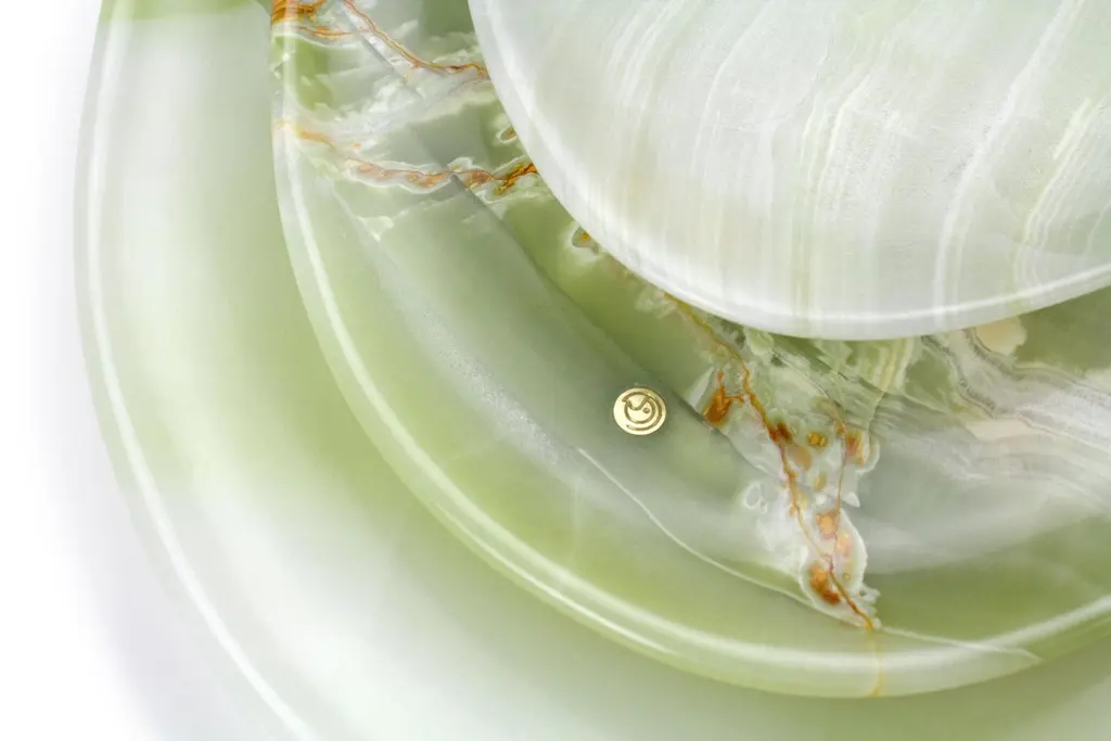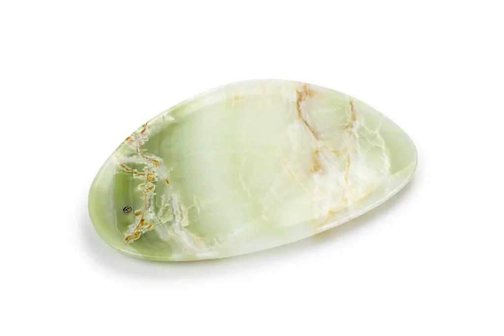 Hand carved presentation plates in Green Onyx. Multiple use as plates, platters and placers. Dimensions: Small - L 24 W 20 H 1.8 cm, Medium - L 30 W 28 H 1.8 cm and Big - L 36 W 35 H 1.8 cm.Available in different marbles, onyx and quartzite. 100% Hand made in Italy. Onyx is a natural material, every piece is unique as each onyx block is different in veins and color shades. All of our creations are handmade by Italian artisans and can slightly vary in shape and size. This is to be considered as a guarantee of a handmade object. All Pieruga objects are made of precious and natural marbles and onyx. Marble is sensitive to acid-based liquids, especially a prolonged contact with substances such as wine, lemon, vinegar, fruit juices, cola and alcohol can stain the surface.Cleaning should be carried out with a soft sponge, water and neutral detergent. Do not use metallic or abrasive sponges, do not wash in the dishwasher, do not use in the microwave. The color of the marble after washing can undergo variations due to the humidity trapped in the surface’s micro-pores. Once fully dried it will regain its original color. The brass inlays tend to oxidize over time, to make them return to shine again use a soft cotton pad soaked in a solution of water and traditional Marseille soap, gently rub over the brass inserts and rinse the surface thoroughly. We are against the use of chemical products, all Pieruga objects are processed and polished through long manual processes without the use of polishing liquids.Pieruga proudly creates elegant accessories and complements in marble through artisanal processes, bringing into dialogue ancient techniques of sculpture with advanced technologies. 100% handmade in Italy.Our mission is a clear Signal of opposition to the enormous waste that occurs in the extraction and processing of large blocks of marble, tons of material are discarded and thrown, in disfigurement to the generosity of our mountains.Rediscovering the ancient art of manual sculpture we give new life to even the smallest fragment of marble, bringing to light its millenary beauty that is lost in more than 2000 years of architecture and sculpture.Pieruga Marble is a new brand by Barberini & Gunnell.The Atelier Barberini & Gunnell was founded by the architects and designers Francesco Barberini and Nina A. Gunnell The artworks by Barberini & Gunnell are regularly shown at international art fairs, such as PAD London, PAD Genève, PAD Monaco, Salon Art + Design New York, Art Miami.