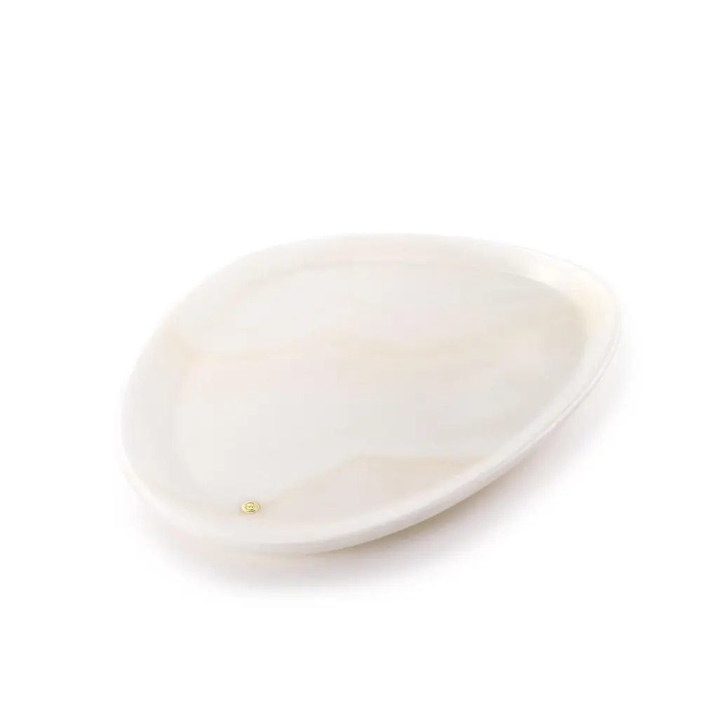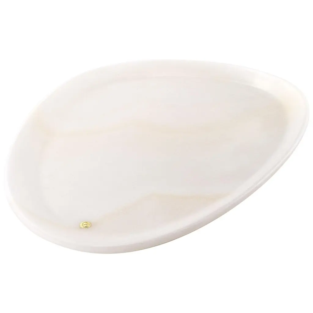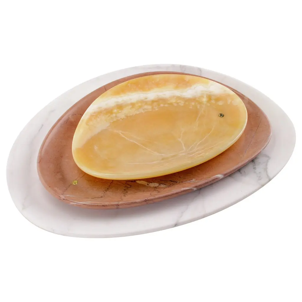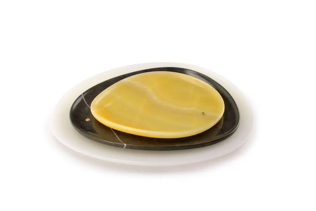 Hand carved presentation plates in Orange onyx, Grey stone and White onyx. Multiple use as plates, platters and placers. Dimensions: Small - L24 W20 H1.8 cm, Medium - L30 W28 H1.8 cm, Big - L36 W35 H1.8 cm.Available in different marbles, onyx and quartzite. 100% Hand made in Italy. Marble is a natural material, every piece is unique as each marble block is different in veins and color shades. All of our creations are handmade by Italian artisans and can slightly vary in shape and size. This is to be considered as a guarantee of a handmade object. All Pieruga objects are made of precious and natural marbles and onyx. Marble is sensitive to acid-based liquids, especially a prolonged contact with substances such as wine, lemon, vinegar, fruit juices, cola and alcohol can stain the surface.Cleaning should be carried out with a soft sponge, water and neutral detergent. Do not use metallic or abrasive sponges, do not wash in the dishwasher, do not use in the microwave. The color of the marble after washing can undergo variations due to the humidity trapped in the surface’s micro-pores. Once fully dried it will regain its original color. The brass inlays tend to oxidize over time, to make them return to shine again use a soft cotton pad soaked in a solution of water and traditional Marseille soap, gently rub over the brass inserts and rinse the surface thoroughly. We are against the use of chemical products, all Pieruga objects are processed and polished through long manual processes without the use of polishing liquids.Pieruga proudly creates elegant accessories and complements in marble through artisanal processes, bringing into dialogue ancient techniques of sculpture with advanced technologies. 100% handmade in Italy.Our mission is a clear signal of opposition to the enormous waste that occurs in the extraction and processing of large blocks of marble, tons of material are discarded and thrown, in disfigurement to the generosity of our mountains.Rediscovering the ancient art of manual sculpture we give new life to even the smallest fragment of marble, bringing to light its millenary beauty that is lost in more than 2000 years of architecture and sculpture.Pieruga marble is a new brand by Barberini & Gunnell.The Atelier Barberini & Gunnell was founded by the architects and designers Francesco Barberini and Nina A. Gunnell The artworks by Barberini & Gunnell are regularly shown at international art fairs, such as PAD London, PAD Genève, PAD Monaco, Salon Art + Design New York, Art Miami.