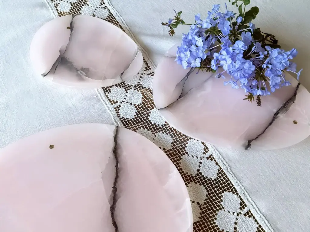 Hand carved presentation plates in pink onyx. Multiple use as plates, platters and placers. The polished finishing underlines the transparency of the onyx making this a very precious object.Dimensions: Small L 24, W 20, H 1.8 cm, medium L 30, W 28, H 1.8 cm and big L 36, W 35, H 1.8 cm.Available in different marbles, onyx and quartzite. 100% Hand made in Italy. Onyx is a natural material, every piece is unique as each onyx block is different in veins and color shades. All of our creations are handmade by Italian artisans and can slightly vary in shape and size. This is to be considered as a guarantee of a handmade object. All Pieruga objects are made of precious and natural marbles and onyx. Marble is sensitive to acid-based liquids, especially a prolonged contact with substances such as wine, lemon, vinegar, fruit juices, cola and alcohol can stain the surface.Cleaning should be carried out with a soft sponge, water and neutral detergent. Do not use metallic or abrasive sponges, do not wash in the dishwasher, do not use in the microwave. The color of the marble after washing can undergo variations due to the humidity trapped in the surface’s micro-pores. Once fully dried it will regain its original color. The brass inlays tend to oxidize over time, to make them return to shine again use a soft cotton pad soaked in a solution of water and traditional Marseille soap, gently rub over the brass inserts and rinse the surface thoroughly. We are against the use of chemical products, all Pieruga objects are processed and polished through long manual processes without the use of polishing liquids.Pieruga proudly creates elegant accessories and complements in marble through artisanal processes, bringing into dialogue ancient techniques of sculpture with advanced technologies. 100% handmade in Italy.Our mission is a clear signal of opposition to the enormous waste that occurs in the extraction and processing of large blocks of marble, tons of material are discarded and thrown, in disfigurement to the generosity of our mountains.Rediscovering the ancient art of manual sculpture we give new life to even the smallest fragment of marble, bringing to light its millenary beauty that is lost in more than 2000 years of architecture and sculpture.Pieruga marble is a new brand by Barberini & Gunnell.The Atelier Barberini & Gunnell was founded by the architects and designers Francesco Barberini and Nina A. Gunnell The artworks by Barberini & Gunnell are regularly shown at international art fairs, such as PAD London, PAD Genève, PAD Monaco, Salon Art + Design New York, Art Miami.