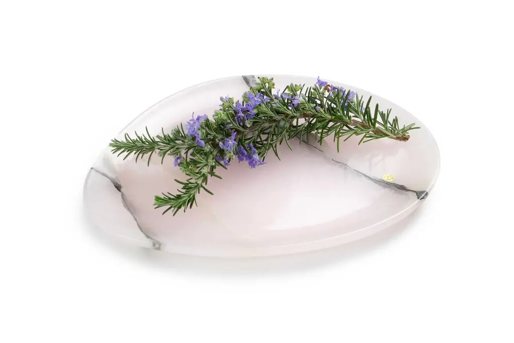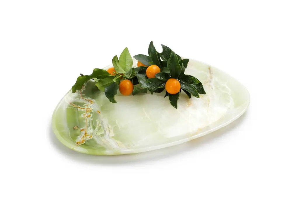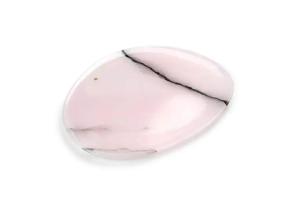 Hand carved presentation plates in green onyx and pink onyx. Multiple use as plates, platters and placers. Dimensions: Small - L 24 W 20 H 1.8 cm, Medium - L 30 W 28 H 1.8 cm, Big - L 36 W 35 H 1.8 cm.Available in different marbles, onyx and quartzite. 100% Hand made in Italy. Onyx is a natural material, every piece is unique as each onyx block is different in veins and color shades. All of our creations are handmade by Italian artisans and can slightly vary in shape and size. This is to be considered as a guarantee of a handmade object. All Pieruga objects are made of precious and natural marbles and onyx. Marble is sensitive to acid-based liquids, especially a prolonged contact with substances such as wine, lemon, vinegar, fruit juices, cola and alcohol can stain the surface.Cleaning should be carried out with a soft sponge, water and neutral detergent. Do not use metallic or abrasive sponges, do not wash in the dishwasher, do not use in the microwave. The color of the marble after washing can undergo variations due to the humidity trapped in the surface’s micro-pores. Once fully dried it will regain its original color. The brass inlays tend to oxidize over time, to make them return to shine again use a soft cotton pad soaked in a solution of water and traditional Marseille soap, gently rub over the brass inserts and rinse the surface thoroughly. We are against the use of chemical products, all Pieruga objects are processed and polished through long manual processes without the use of polishing liquids.Pieruga proudly creates elegant accessories and complements in marble through artisanal processes, bringing into dialogue ancient techniques of sculpture with advanced technologies. 100% handmade in Italy.Our Mission is a clear Signal of opposition to the enormous waste that occurs in the extraction and processing of large blocks of marble, tons of material are discarded and thrown, in disfigurement to the generosity of our mountains.Rediscovering the ancient art of manual sculpture we give new life to even the smallest fragment of marble, bringing to light its millenary beauty that is lost in more than 2000 years of architecture and sculpture.Pieruga Marble is a new brand by Barberini & Gunnell.The Atelier Barberini & Gunnell was founded by the architects and designers Francesco Barberini and Nina A. Gunnell The artworks by Barberini & Gunnell are regularly shown at international art fairs, such as PAD London, PAD Genève, PAD Monaco, Salon Art + Design New York, Art Miami.