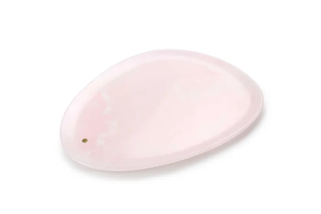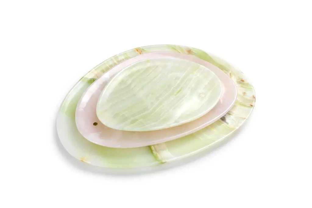 Hand carved presentation plates in green and pink onyx. Multiple use as plates, platters and placers. Dimensions: Small - L 24 W 20 H 1.8 cm, Medium - L 30 W 28 H 1.8 cm, Big - L 36 W 35 H 1.8 cm.Available in different marbles, onyx and quartzite. 100% Hand made in Italy. Onyx is a natural material, every piece is unique as each onyx block is different in veins and color shades. All of our creations are handmade by Italian artisans and can slightly vary in shape and size. This is to be considered as a guarantee of a handmade object. All Pieruga objects are made of precious and natural marbles and onyx. Marble is sensitive to acid-based liquids, especially a prolonged contact with substances such as wine, lemon, vinegar, fruit juices, cola and alcohol can stain the surface.Cleaning should be carried out with a soft sponge, water and neutral detergent. Do not use metallic or abrasive sponges, do not wash in the dishwasher, do not use in the microwave. The color of the marble after washing can undergo variations due to the humidity trapped in the surface’s micro-pores. Once fully dried it will regain its original color. The brass inlays tend to oxidize over time, to make them return to shine again use a soft cotton pad soaked in a solution of water and traditional Marseille soap, gently rub over the brass inserts and rinse the surface thoroughly. We are against the use of chemical products, all Pieruga objects are processed and polished through long manual processes without the use of polishing liquids.Pieruga proudly creates elegant accessories and complements in marble through artisanal processes, bringing into dialogue ancient techniques of sculpture with advanced technologies. 100% handmade in Italy.Our Mission is a clear Signal of opposition to the enormous waste that occurs in the extraction and processing of large blocks of marble, tons of material are discarded and thrown, in disfigurement to the generosity of our mountains.Rediscovering the ancient art of manual sculpture we give new life to even the smallest fragment of marble, bringing to light its millenary beauty that is lost in more than 2000 years of architecture and sculpture.Pieruga Marble is a new brand by Barberini & Gunnell.The Atelier Barberini & Gunnell was founded by the architects and designers Francesco Barberini and Nina A. Gunnell The artworks by Barberini & Gunnell are regularly shown at international art fairs, such as PAD London, PAD Genève, PAD Monaco, Salon Art + Design New York, Art Miami.