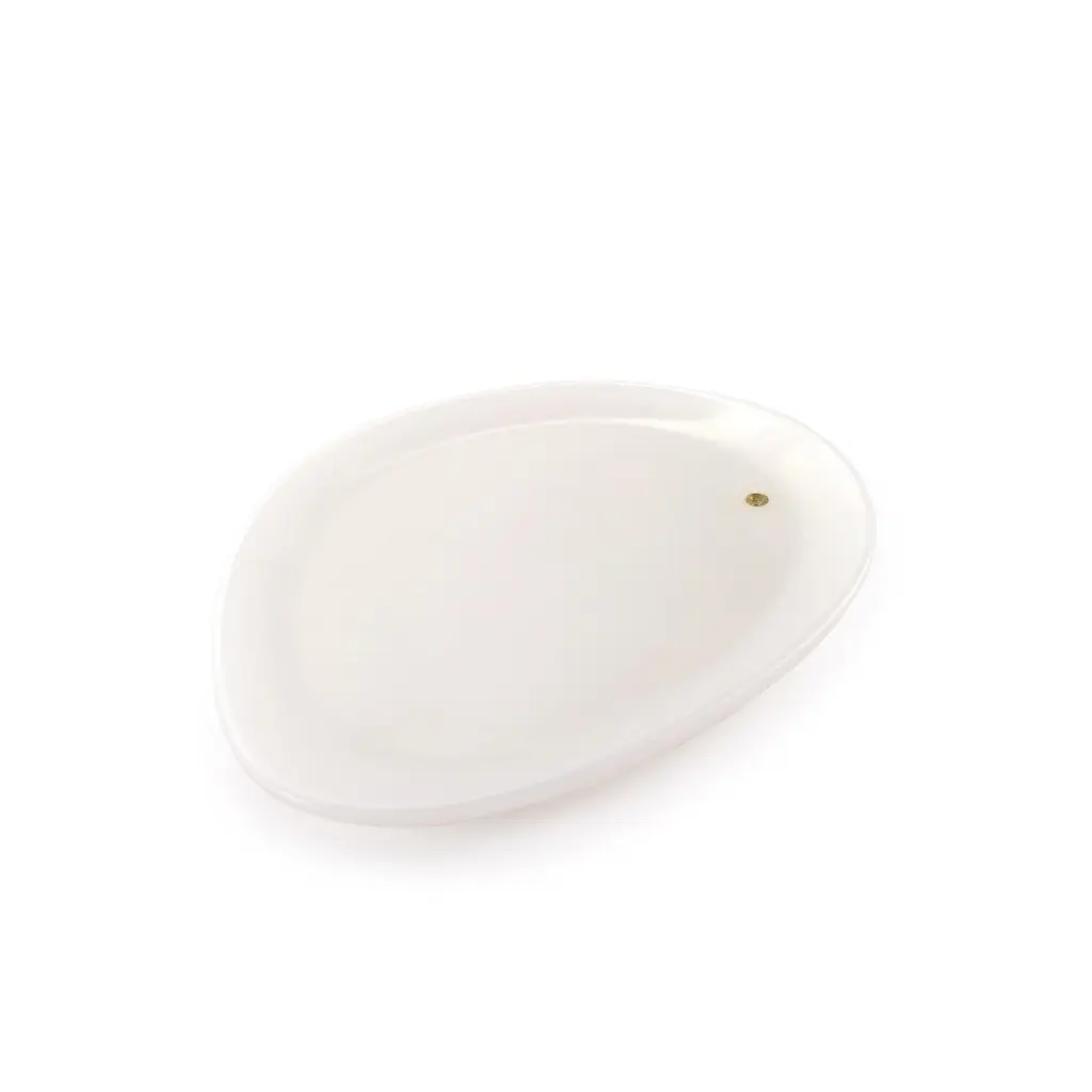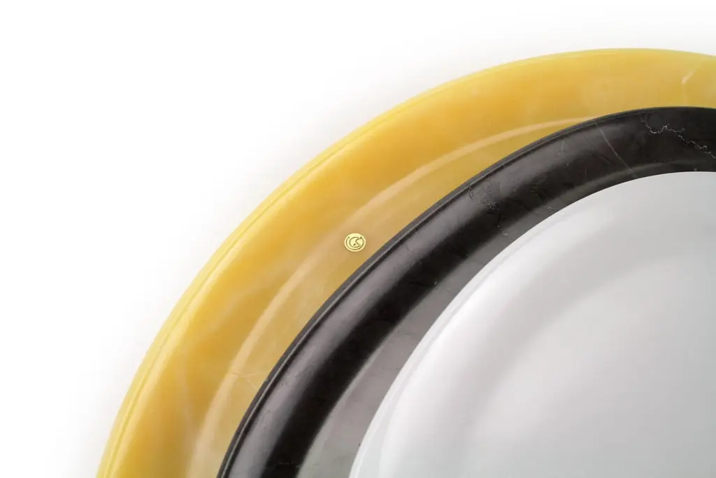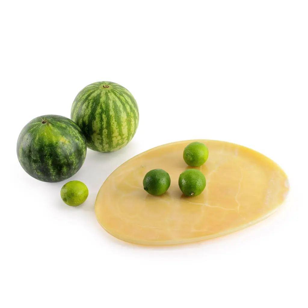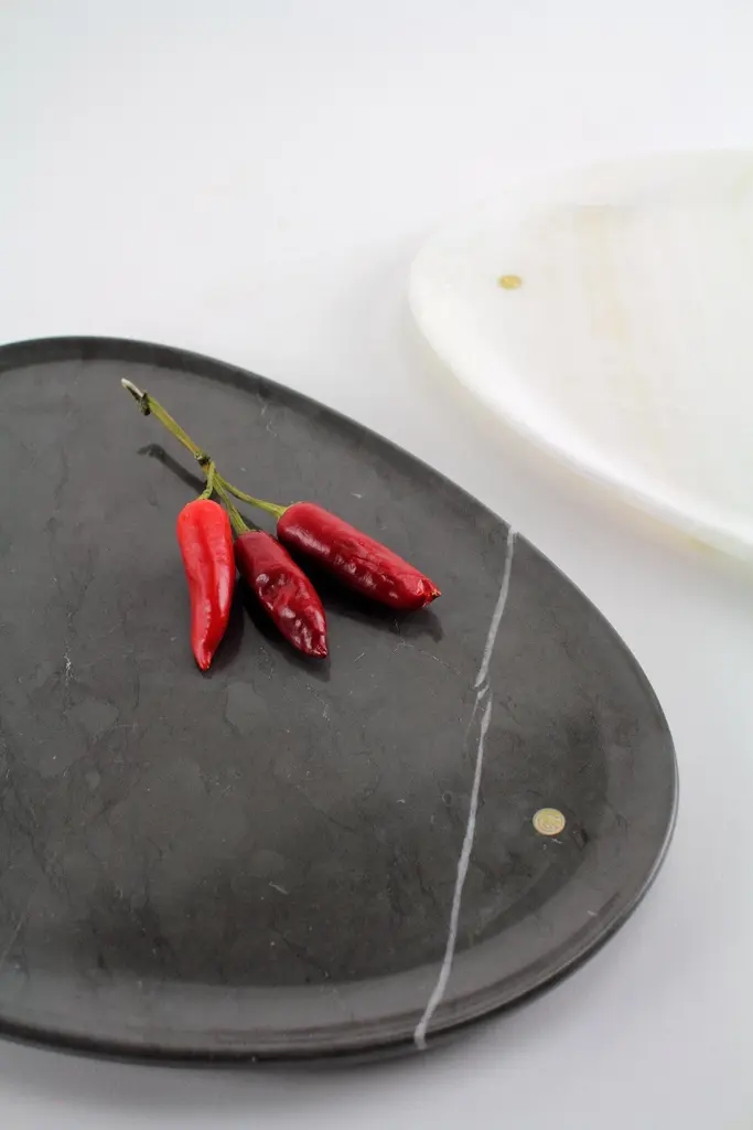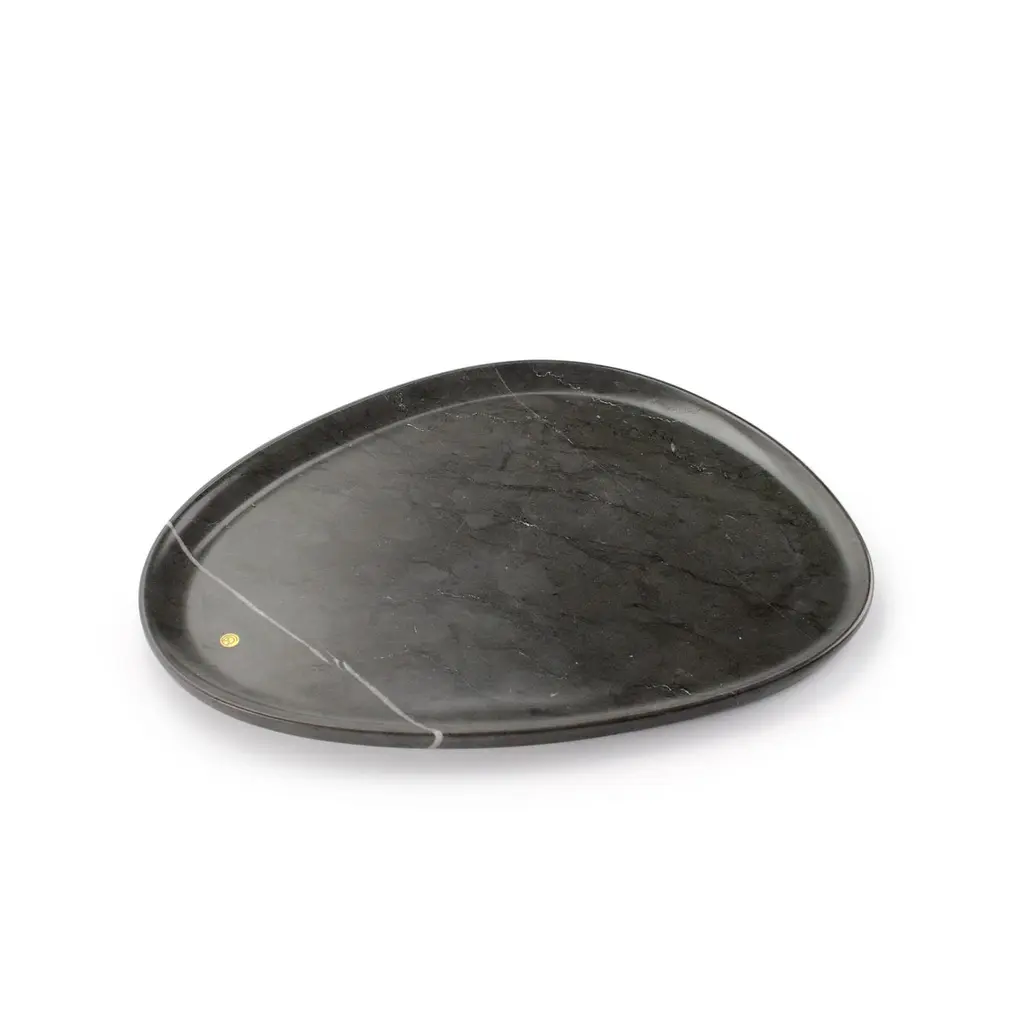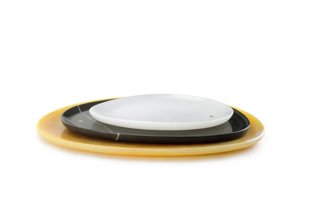Hand carved presentation plates in White onyx, Grey stone and Orange onyx. Multiple use as plates, platters and placers. Dimensions: Small - L24 W20 H1.8 cm, Medium - L30 W28 H1.8 cm, Big - L36 W35 H1.8 cm.Available in different marbles, onyx and quartzite. 100% Hand made in Italy. Onyx is a natural material, every piece is unique as each onyx block is different in veins and color shades. All of our creations are handmade by Italian artisans and can slightly vary in shape and size. This is to be considered as a guarantee of a handmade object. All Pieruga objects are made of precious and natural marbles and onyx. Marble is sensitive to acid-based liquids, especially a prolonged contact with substances such as wine, lemon, vinegar, fruit juices, cola and alcohol can stain the surface.Cleaning should be carried out with a soft sponge, water and neutral detergent. Do not use metallic or abrasive sponges, do not wash in the dishwasher, do not use in the microwave. The color of the marble after washing can undergo variations due to the humidity trapped in the surface’s micro-pores. Once fully dried it will regain its original color. The brass inlays tend to oxidize over time, to make them return to shine again use a soft cotton pad soaked in a solution of water and traditional Marseille soap, gently rub over the brass inserts and rinse the surface thoroughly. We are against the use of chemical products, all Pieruga objects are processed and polished through long manual processes without the use of polishing liquids.Pieruga proudly creates elegant accessories and complements in marble through artisanal processes, bringing into dialogue ancient techniques of sculpture with advanced technologies. 100% handmade in Italy.Our mission is a clear signal of opposition to the enormous waste that occurs in the extraction and processing of large blocks of marble, tons of material are discarded and thrown, in disfigurement to the generosity of our mountains.Rediscovering the ancient art of manual sculpture we give new life to even the smallest fragment of marble, bringing to light its millenary beauty that is lost in more than 2000 years of architecture and sculpture.Pieruga marble is a new brand by Barberini & Gunnell.The Atelier Barberini & Gunnell was founded by the architects and designers Francesco Barberini and Nina A. Gunnell The artworks by Barberini & Gunnell are regularly shown at international art fairs, such as PAD London, PAD Genève, PAD Monaco, Salon Art + Design New York, Art Miami.