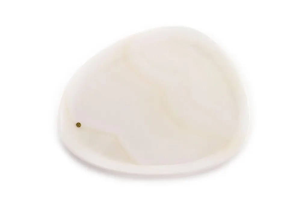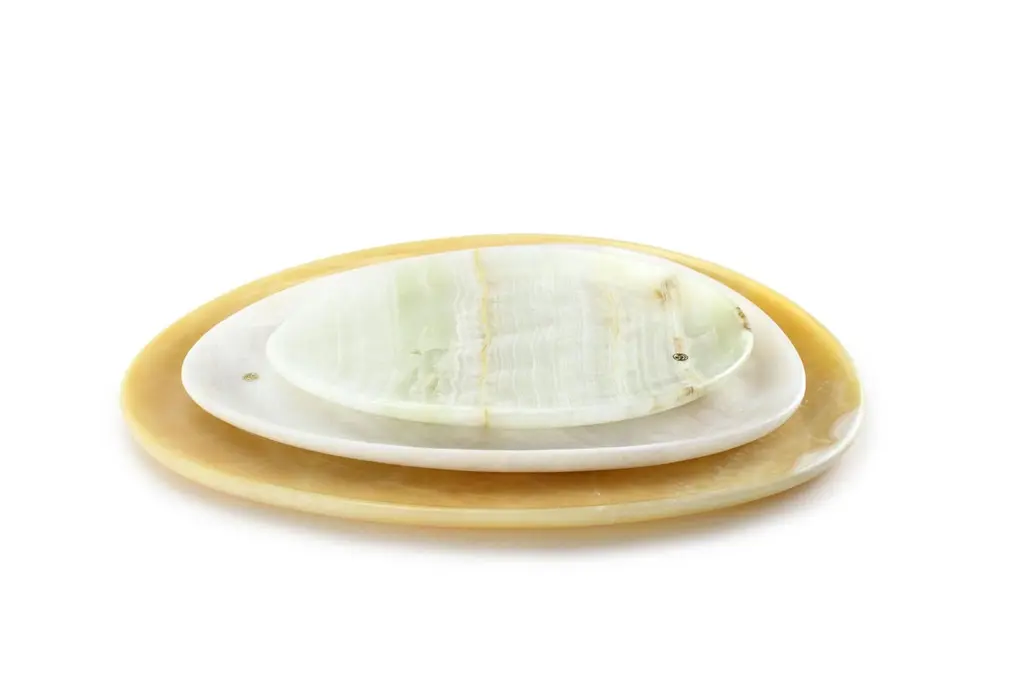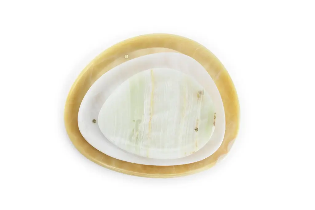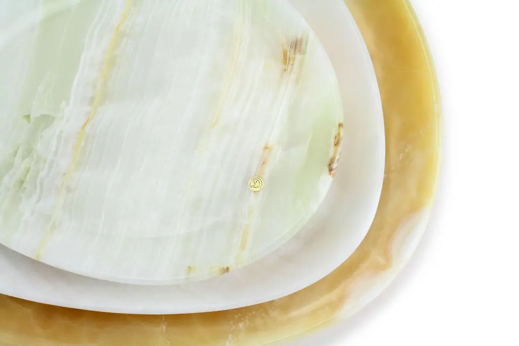 Hand carved presentation plates in green, white and orange onyx . Multiple use as plates, platters and placers. Dimensions: Small - L 24 W 20 H 1.8 cm, Medium - L 30 W 28 H 1.8 cm, Big - L 36 W 35 H 1.8 cm.Available in different marbles, onyx and quartzite.100% Hand made in Italy.Onyx is a natural material, every piece is unique as each onyx block is different in veins and color shades. All of our creations are handmade by Italian artisans and can slightly vary in shape and size. This is to be considered as a guarantee of a handmade object. All Pieruga objects are made of precious and natural marbles and onyx. Marble is sensitive to acid-based liquids, especially a prolonged contact with substances such as wine, lemon, vinegar, fruit juices, cola and alcohol can stain the surface.Cleaning should be carried out with a soft sponge, water and neutral detergent. Do not use metallic or abrasive sponges, do not wash in the dishwasher, do not use in the microwave. The color of the marble after washing can undergo variations due to the humidity trapped in the surface’s micro-pores. Once fully dried it will regain its original color. The brass inlays tend to oxidize over time, to make them return to shine again use a soft cotton pad soaked in a solution of water and traditional Marseille soap, gently rub over the brass inserts and rinse the surface thoroughly. We are against the use of chemical products, all Pieruga objects are processed and polished through long manual processes without the use of polishing liquids.Pieruga proudly creates elegant accessories and complements in marble through artisanal processes, bringing into dialogue ancient techniques of sculpture with advanced technologies. 100% handmade in Italy.Our Mission is a clear Signal of opposition to the enormous waste that occurs in the extraction and processing of large blocks of marble, tons of material are discarded and thrown, in disfigurement to the generosity of our mountains.Rediscovering the ancient art of manual sculpture we give new life to even the smallest fragment of marble, bringing to light its millenary beauty that is lost in more than 2000 years of architecture and sculpture.Pieruga Marble is a new brand by Barberini & Gunnell.The Atelier Barberini & Gunnell was founded by the architects and designers Francesco Barberini and Nina A. Gunnell The artworks by Barberini & Gunnell are regularly shown at international art fairs, such as PAD London, PAD Genève, PAD Monaco, Salon Art + Design New York, Art Miami.