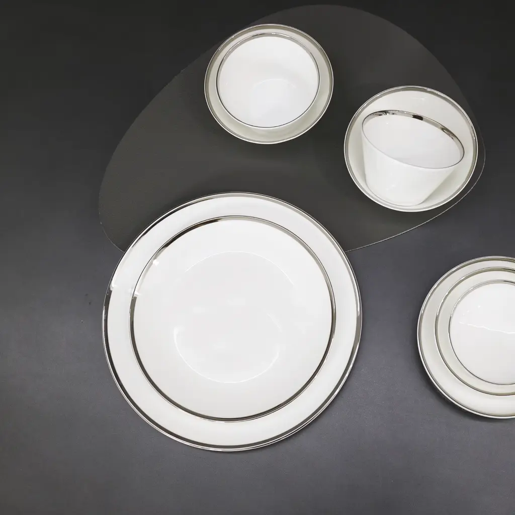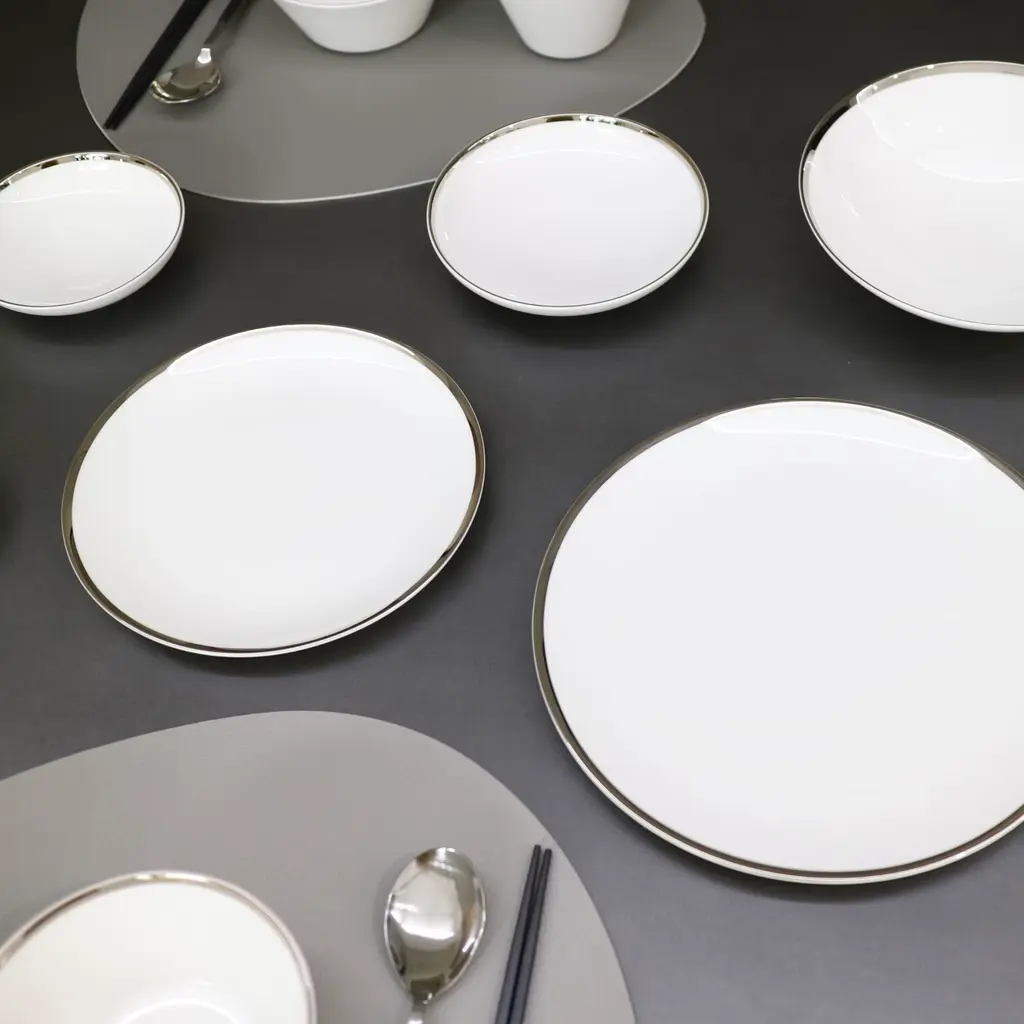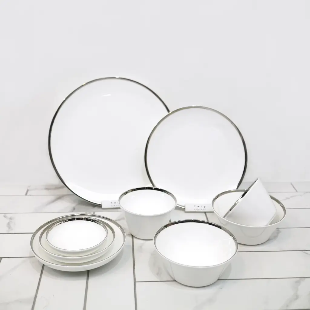 A classically inspired collection which combines the majestic look of Platinum with the purity of Fine Bone China. The edges in this collection are all hand-painted. This collection has been designed with sophistication and minimalism as our inspirations. With contemporary shapes and a complete collection to choose from, we offer elegance and modernity from the Platinum Edge Collection by Twig New York.Ideal for salad and dessertOne set of two per boxFine Bone China with hand-painted Platinum rimDue to hand-painted nature of the process, the gold finish may contain variations and brush strokesPlatinum Edge Collection
