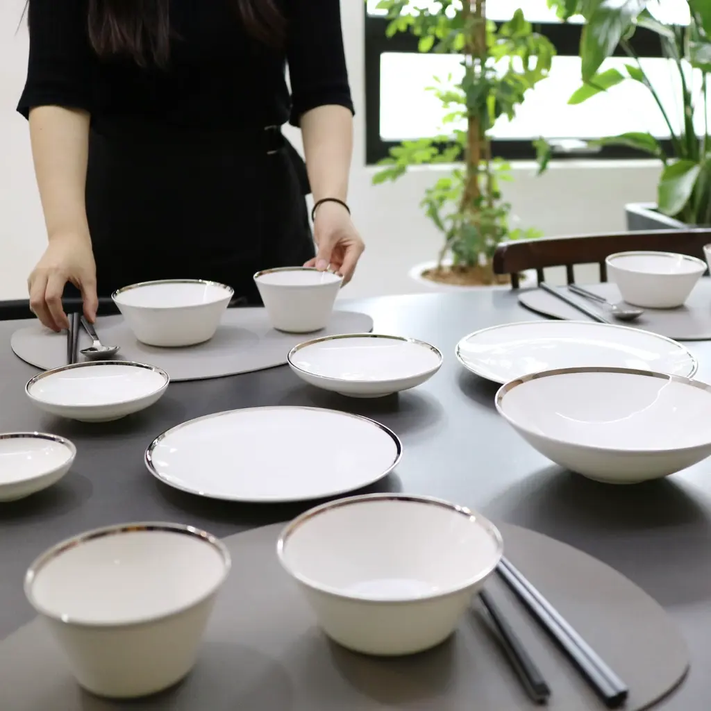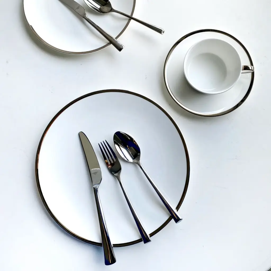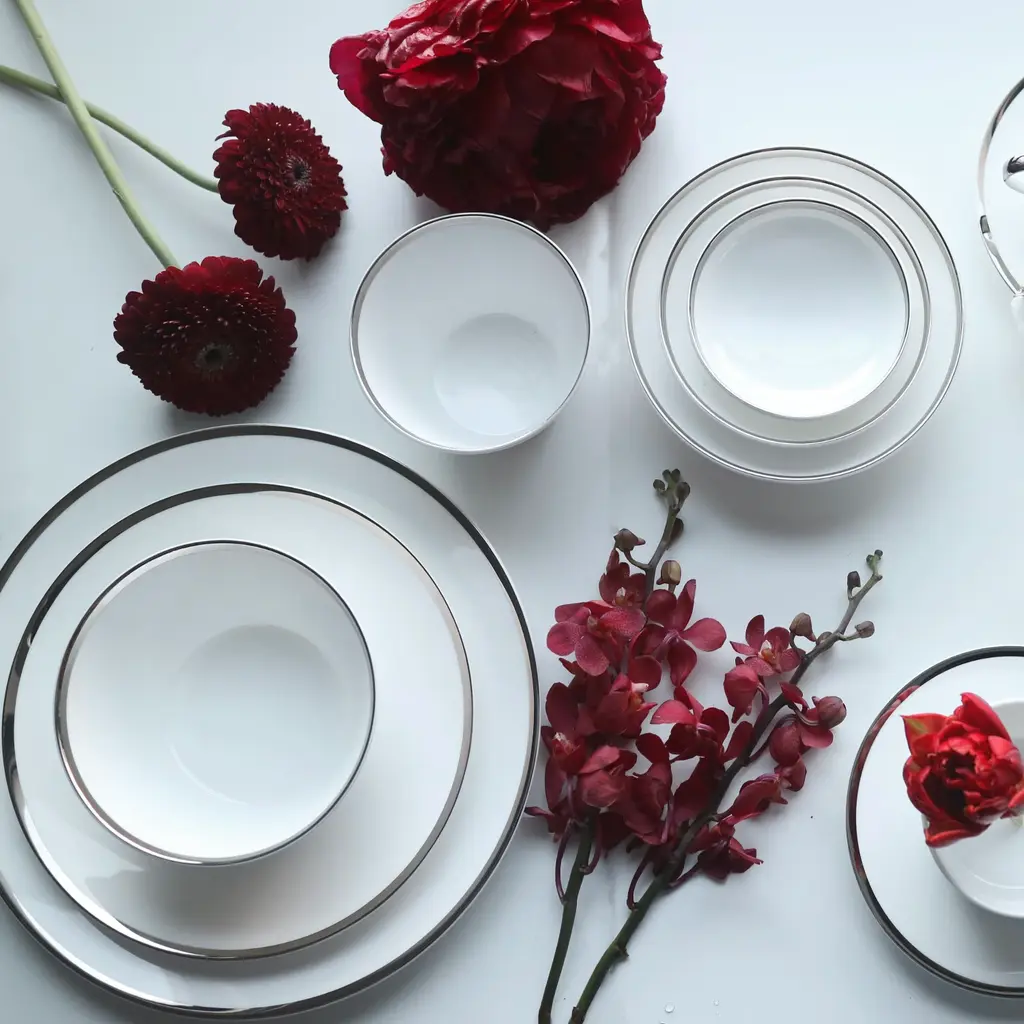 A classically inspired collection which combines the majestic look of Platinum with the purity of Fine Bone China. The edges in this collection are all hand-painted. This collection has been designed with sophistication and minimalism as our inspirations. With contemporary shapes and a complete collection to choose from, we offer elegance and modernity from the Platinum Edge Collection by Twig New York.Ideal for salad and dessertOne set of two per boxFine Bone China with hand-painted Platinum rimDue to hand-painted nature of the process, the gold finish may contain variations and brush strokesPlatinum Edge Collection
