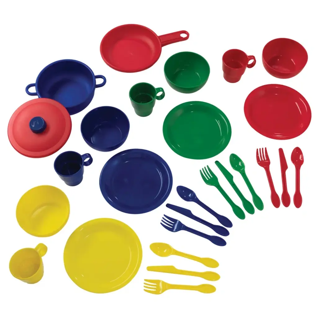This complete KidKraft 27-Piece Cookware Set in classic pastel colors has everything little cooks and foodies need to serve their friends, family or stuffed animals and dolls. With a lidded pot, pan and place settings for four, this set has everything kids need to be the perfect little hosts. Built from sturdy, easy-to-clean plastic, this set is built to last. It's a perfect addition to any KidKraft play kitchen or role play item and can even be used in our outdoor playhouse and swing set kitchens!