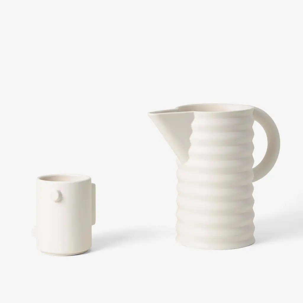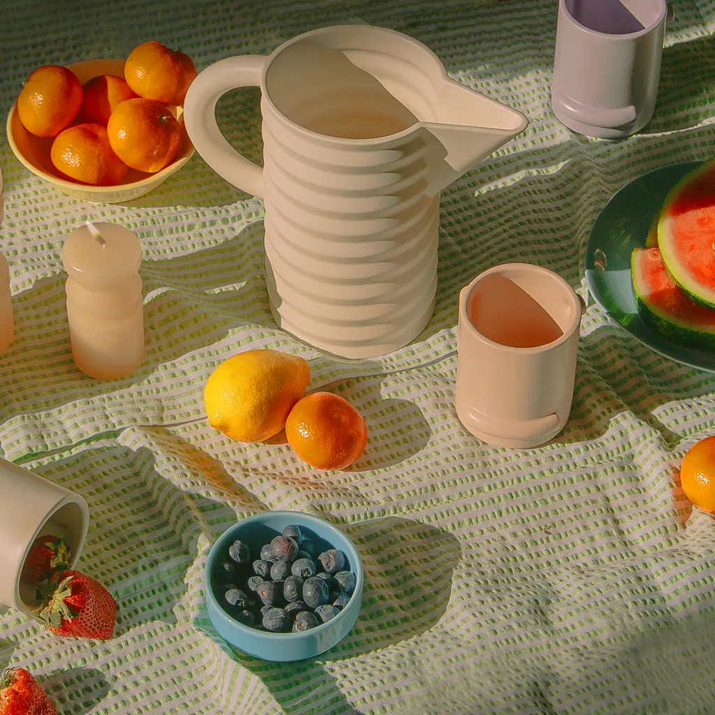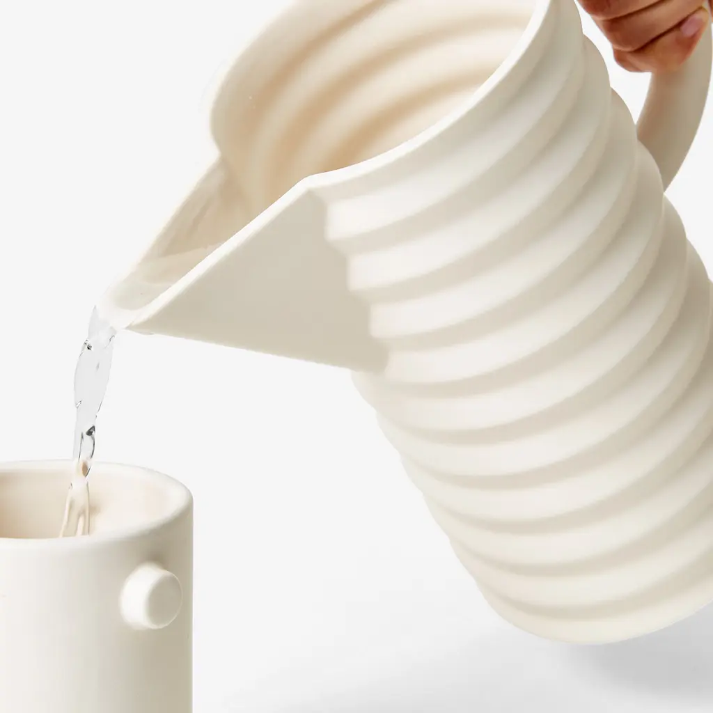Transform the act of pouring water into a refined gesture with the Areaware Pleated Pitcher. Sculptural and elegant, the pitcher was designed by High Gloss with a pleated silhouette. A circular handle makes holding the pitcher a delight, while the generously sized spout minimizes drips. Made from glazed ceramic, this product is both durable and easy to clean. It has a capacity of 60 oz, which is ideal for serving guests, whether you’re pouring plain water, juice, or another beverage. This pitcher also comes with a set of 4 Confetti cups which stack to occupy minimal space in a cupboard.