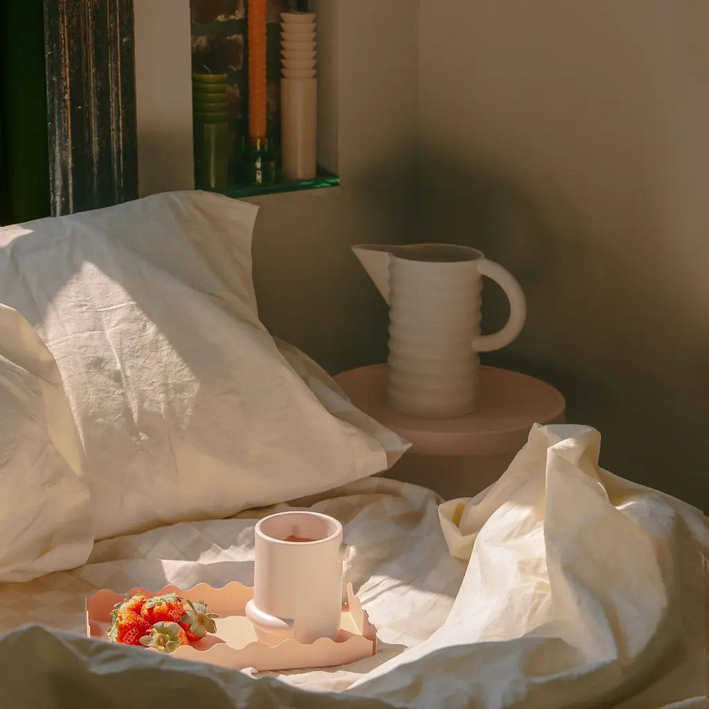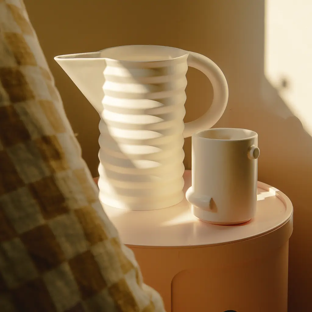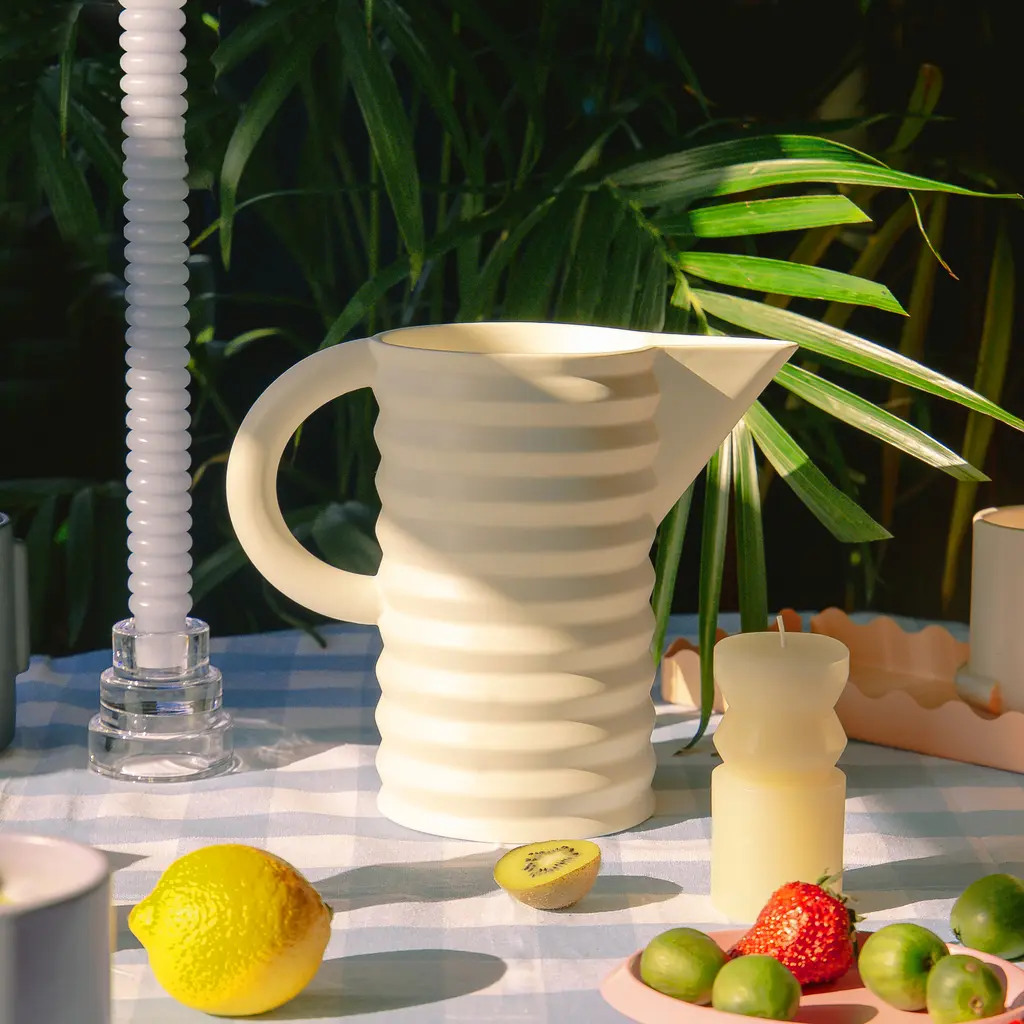 Transform the act of pouring water into a refined gesture with the Areaware Pleated Pitcher. Sculptural and elegant, the pitcher was designed by High Gloss with a pleated silhouette. A circular handle makes holding the pitcher a delight, while the generously sized spout minimizes drips. Made from glazed ceramic, this product is both durable and easy to clean. It has a capacity of 60 oz, which is ideal for serving guests, whether you’re pouring plain water, juice, or another beverage. This pitcher also comes with a set of 4 Confetti cups which stack to occupy minimal space in a cupboard.