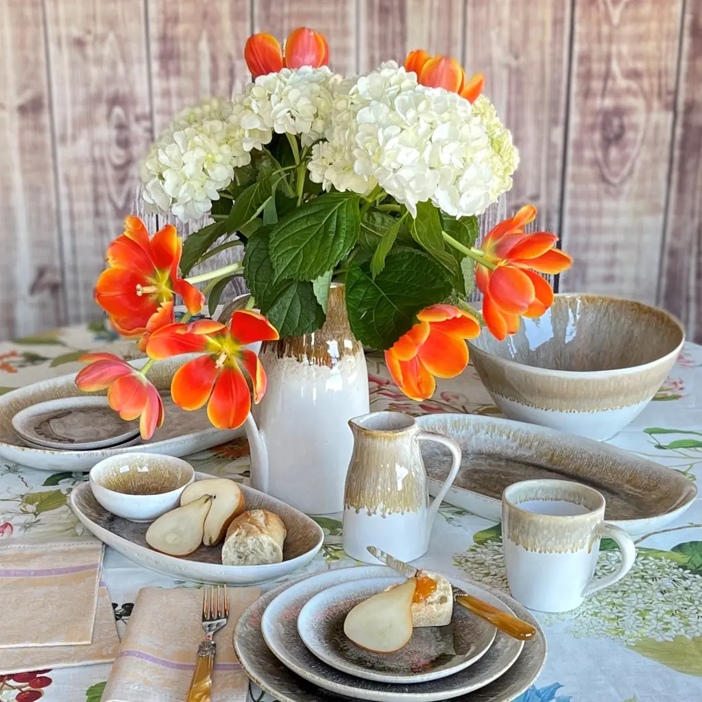 Bring casual elegance to everyday dining with the Point Lobos collection from Carmel Ceramic. A reactive glaze mixes earthy brown hues on a white background, giving each piece a unique, artisan-inspired look. Durable stoneware is dishwasher and microwave safe for ease of care and use.